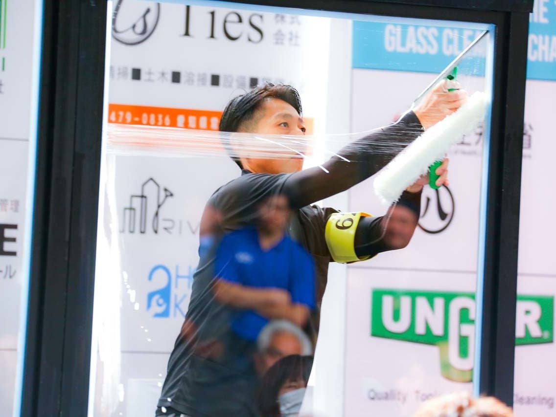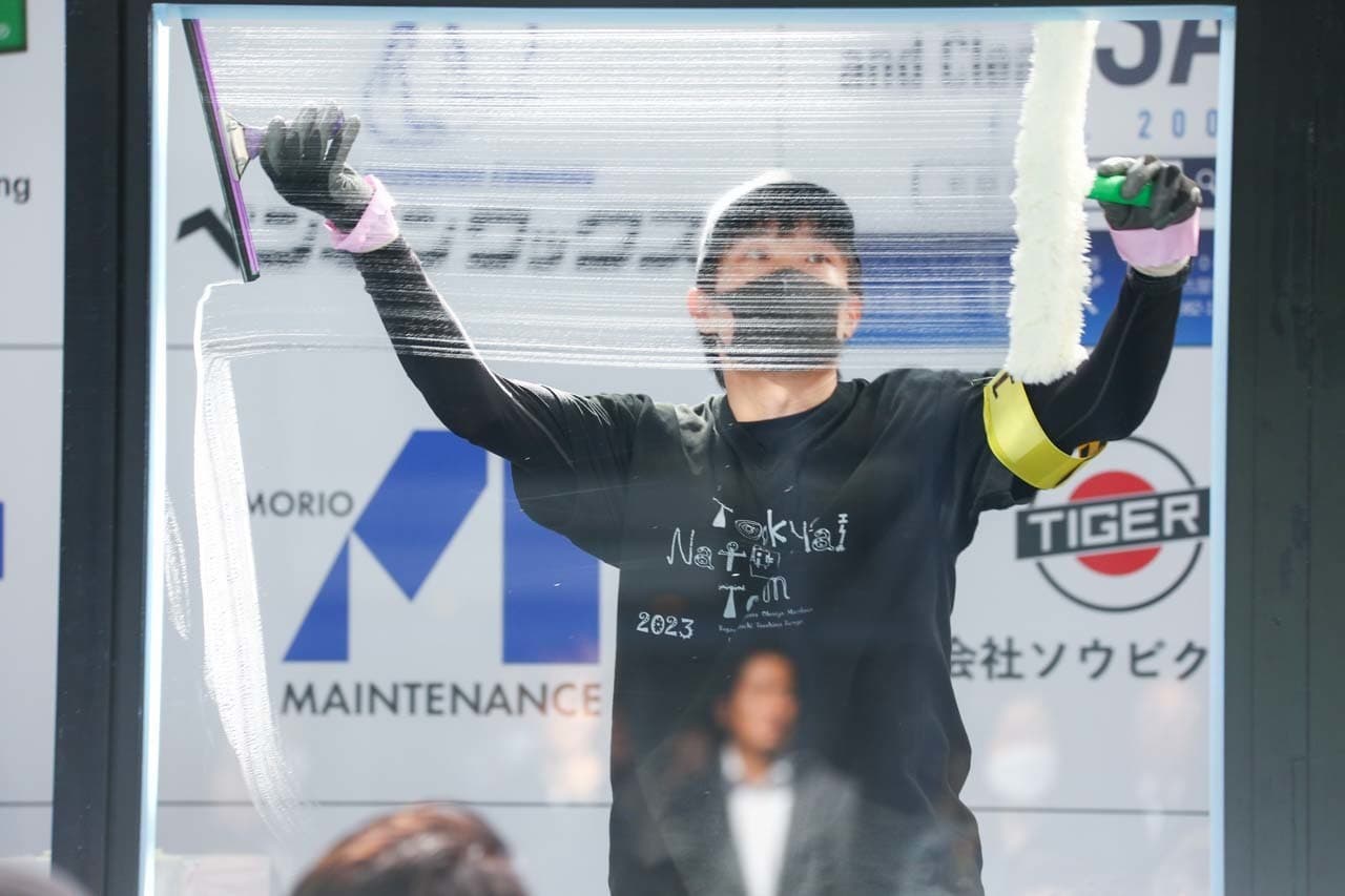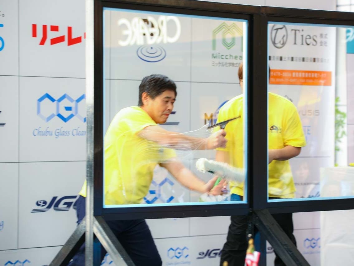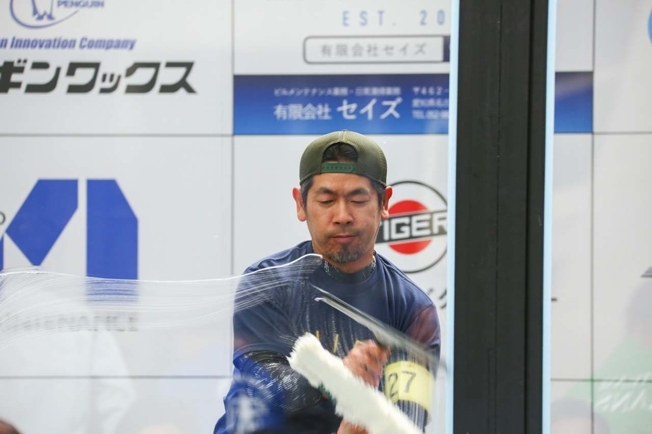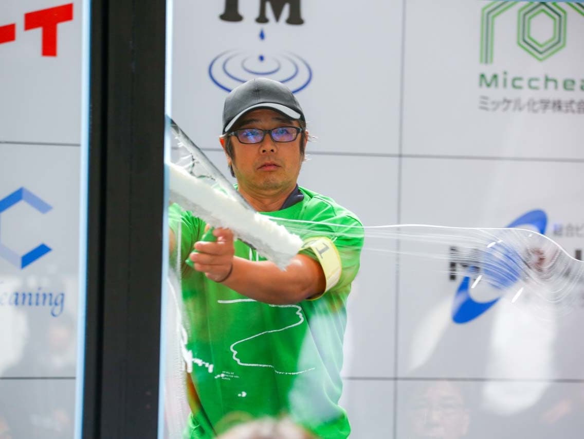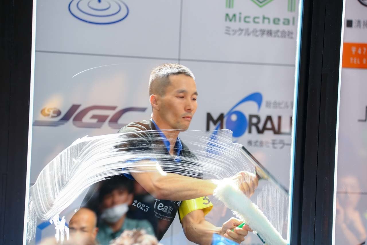 1040mm×1150mmの窓枠付き板ガラスを35cmのシャンプーと30cmのスクイージーを使用して、より早くよりきれいに拭き上げる技術を競います。