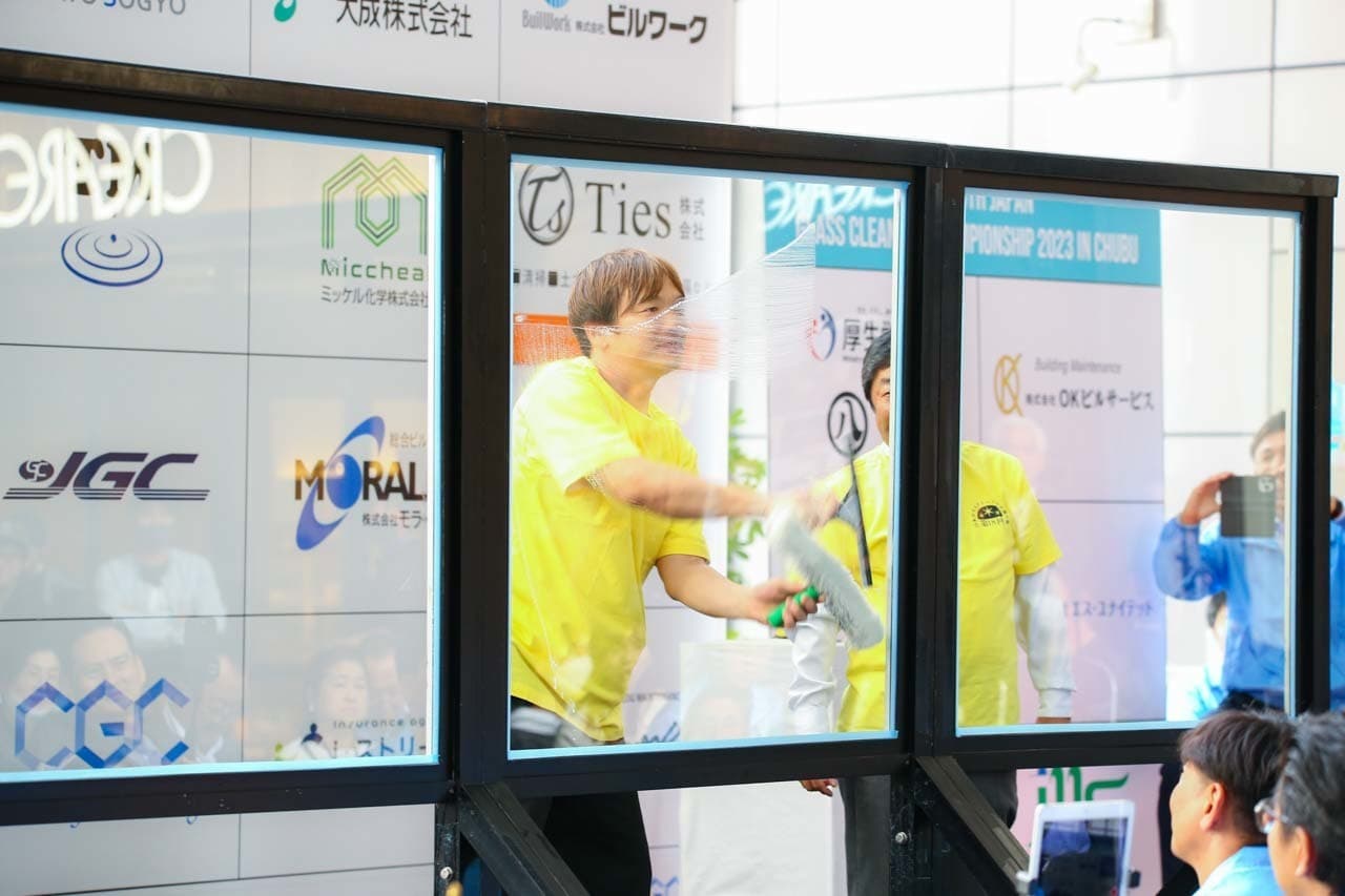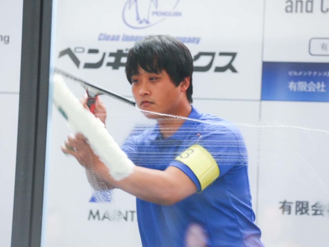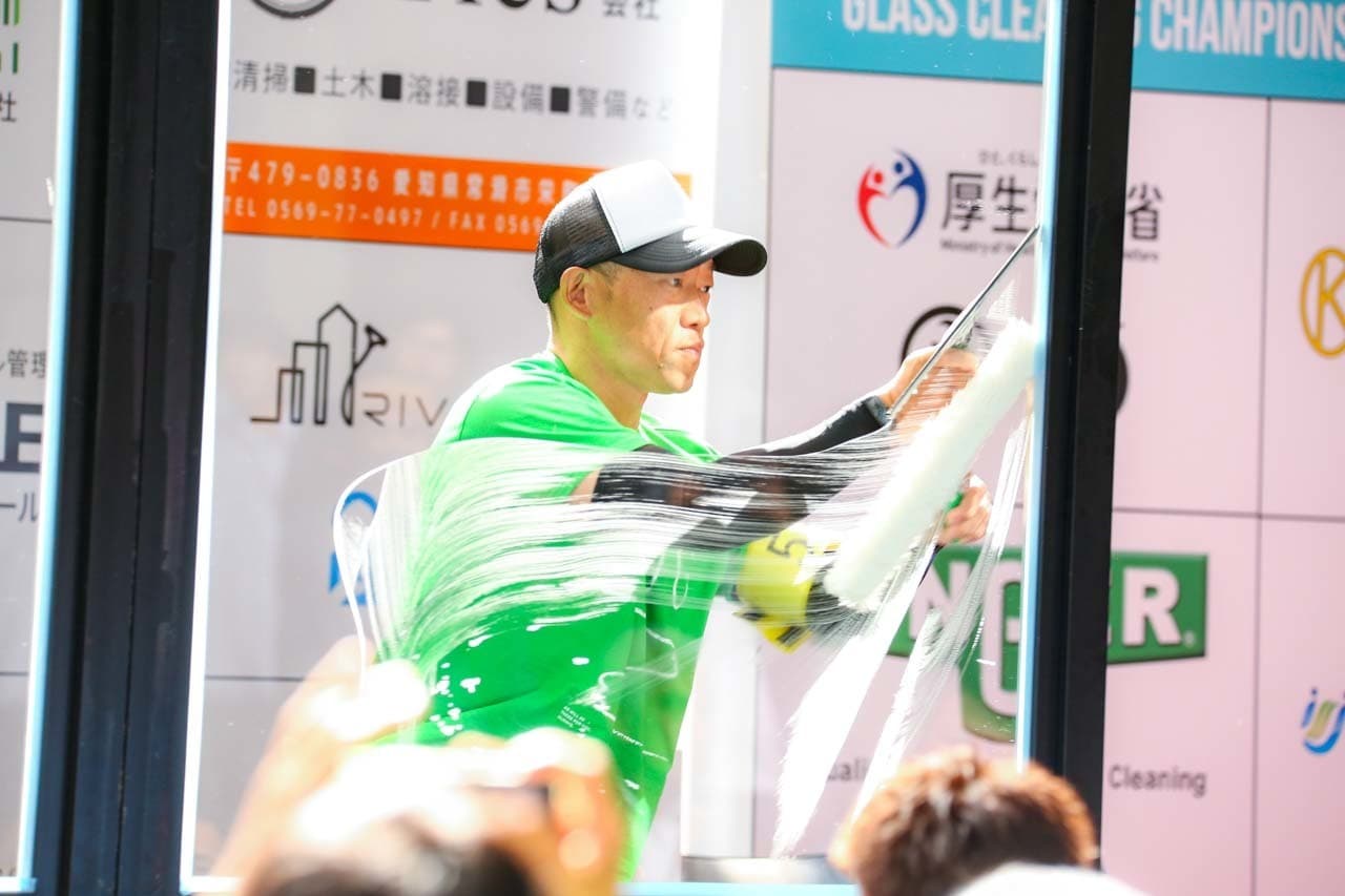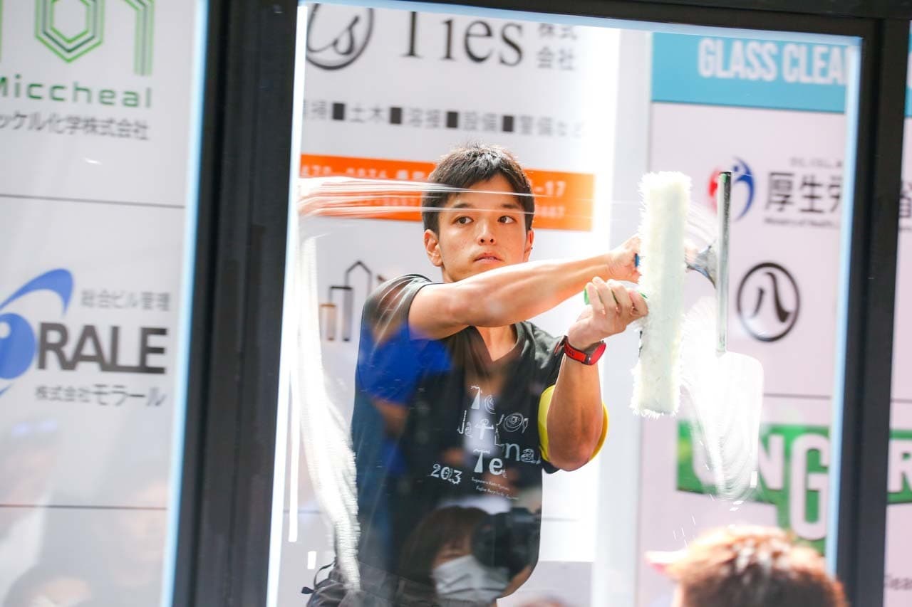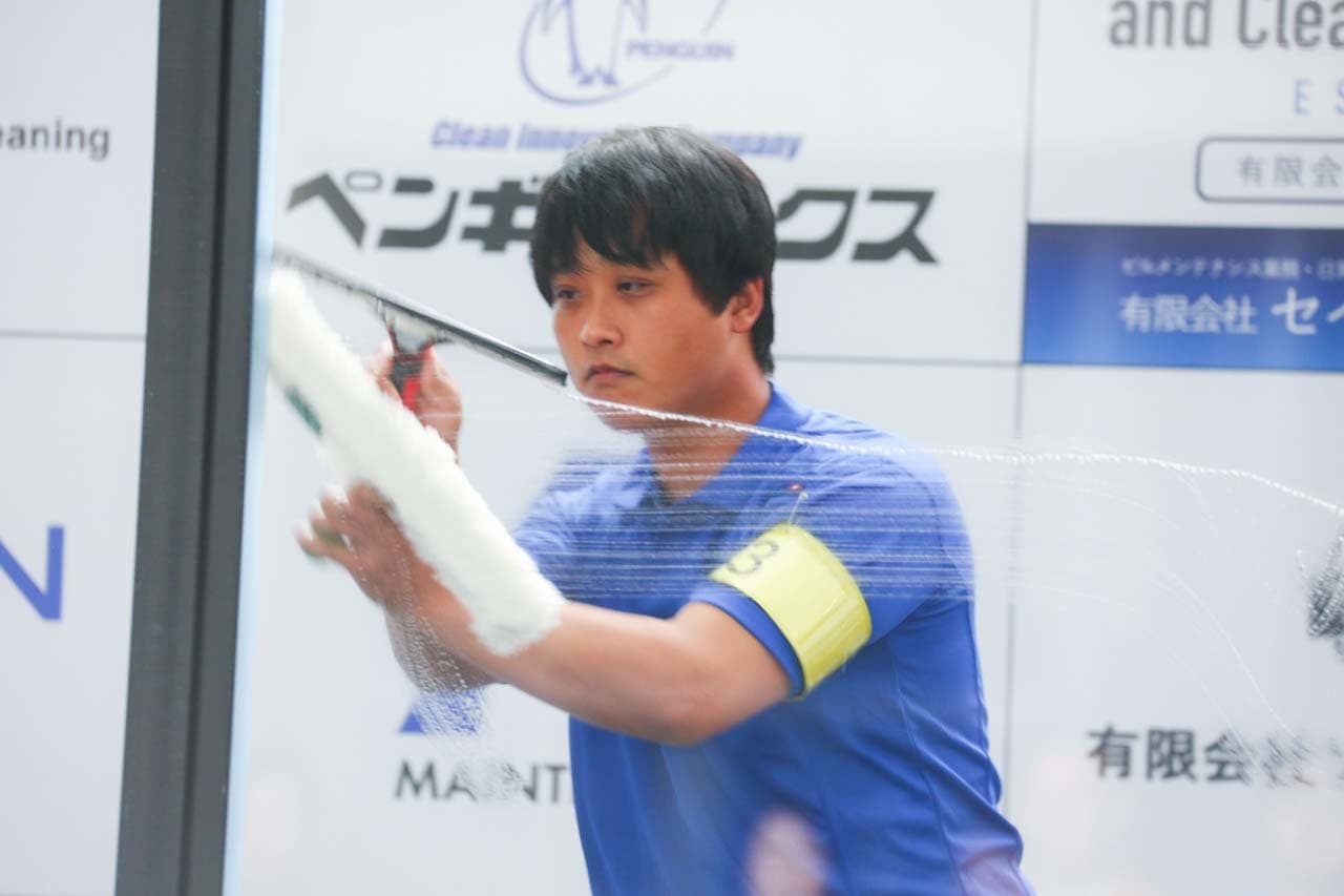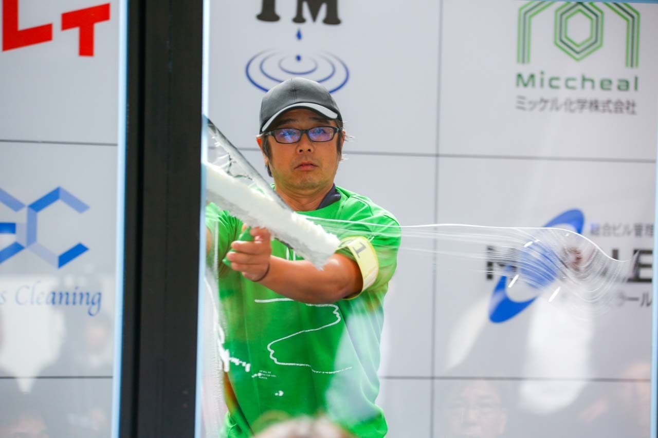 1040mm×1150mmの窓枠付き板ガラスを35cmのシャンプーと30cmのスクイージーを使用して、より早くよりきれいに拭き上げる技術を競います。