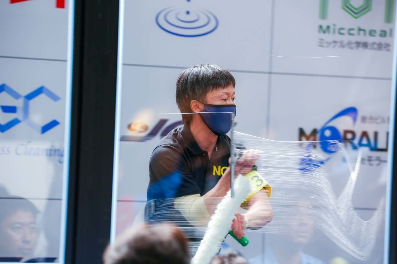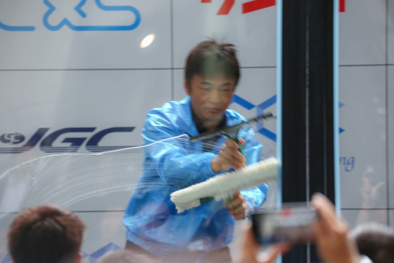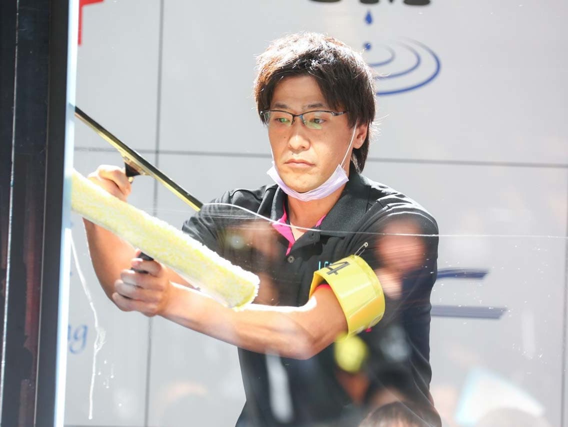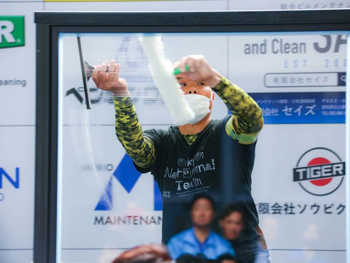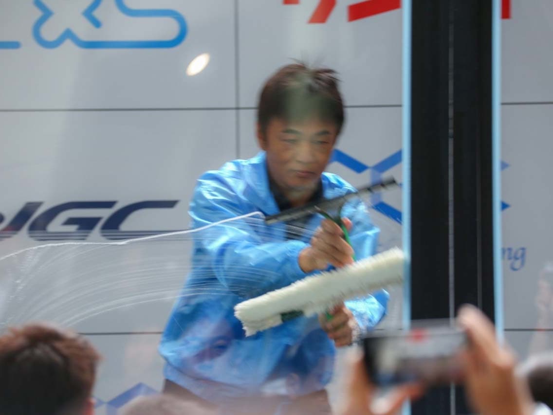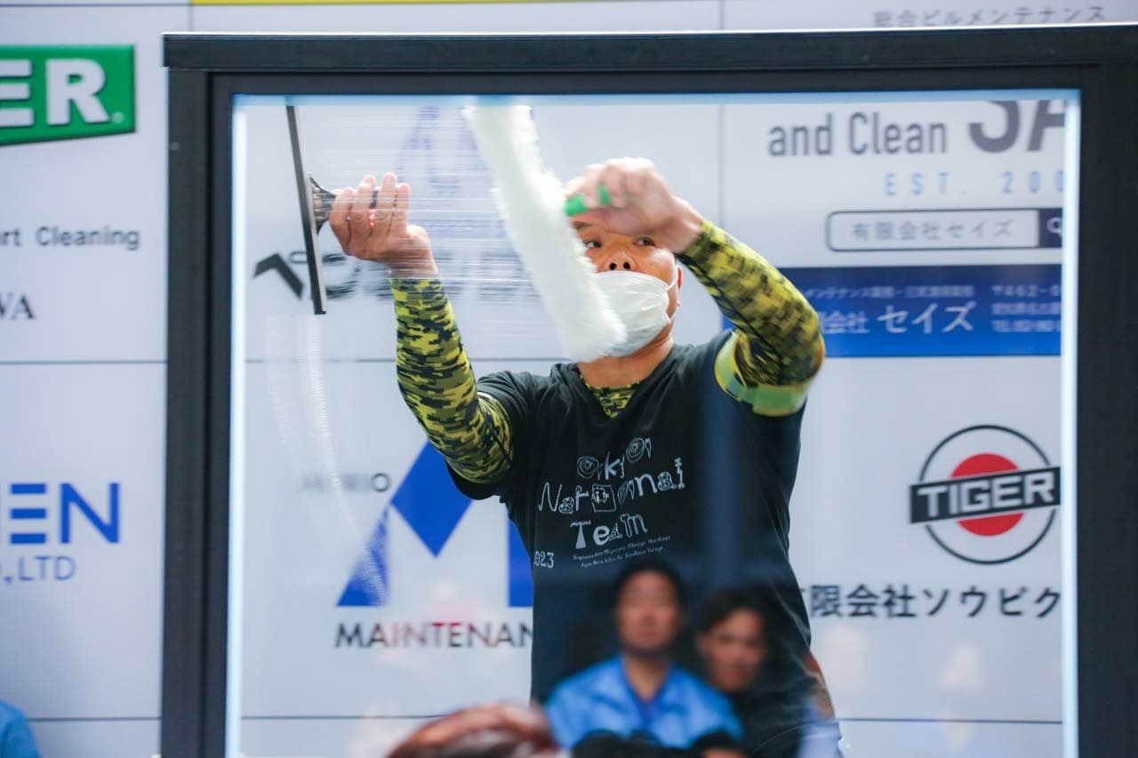 1040mm×1150mmの窓枠付き板ガラスを35cmのシャンプーと30cmのスクイージーを使用して、より早くよりきれいに拭き上げる技術を競います。
