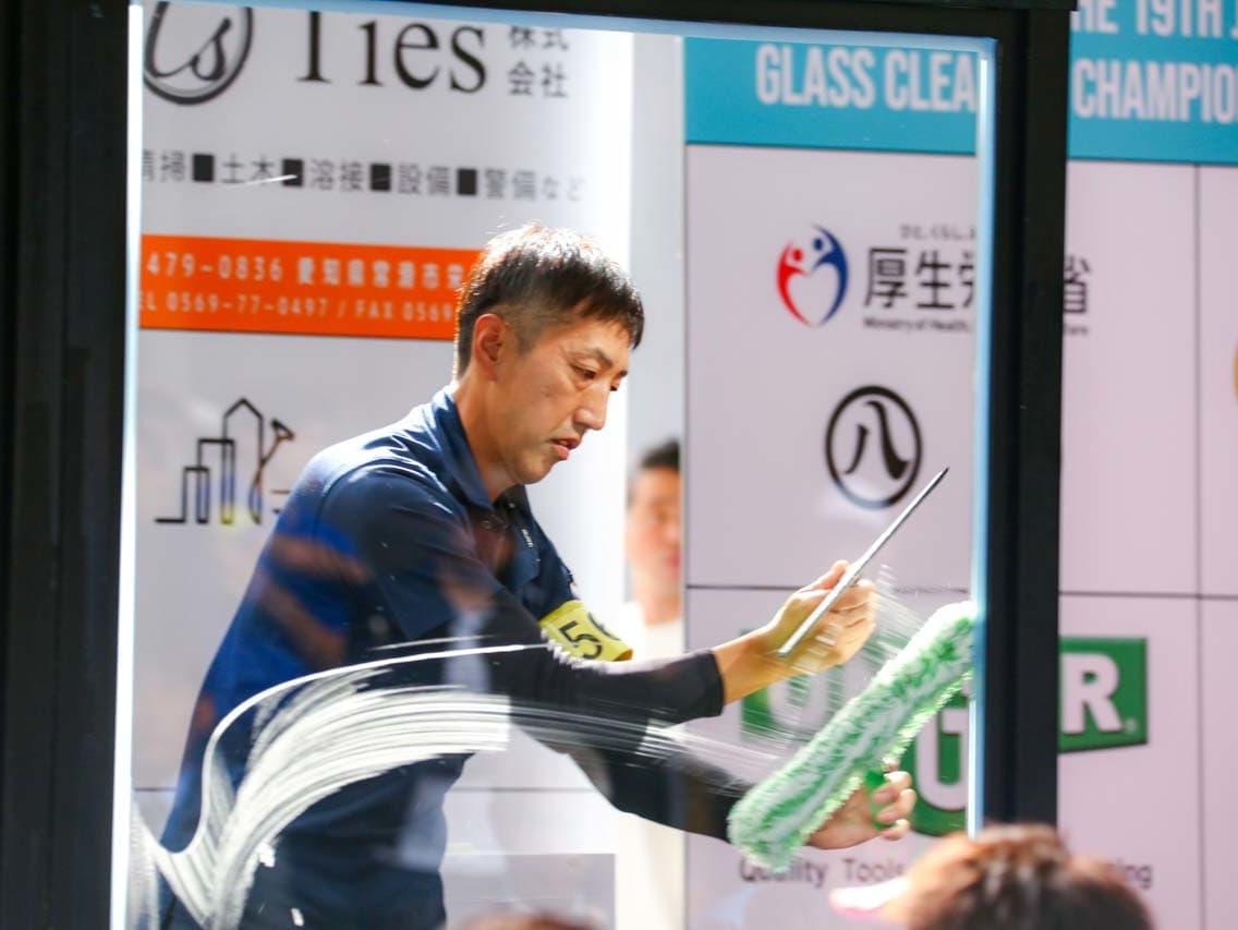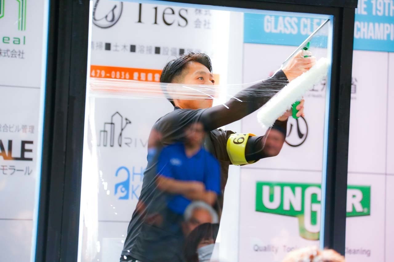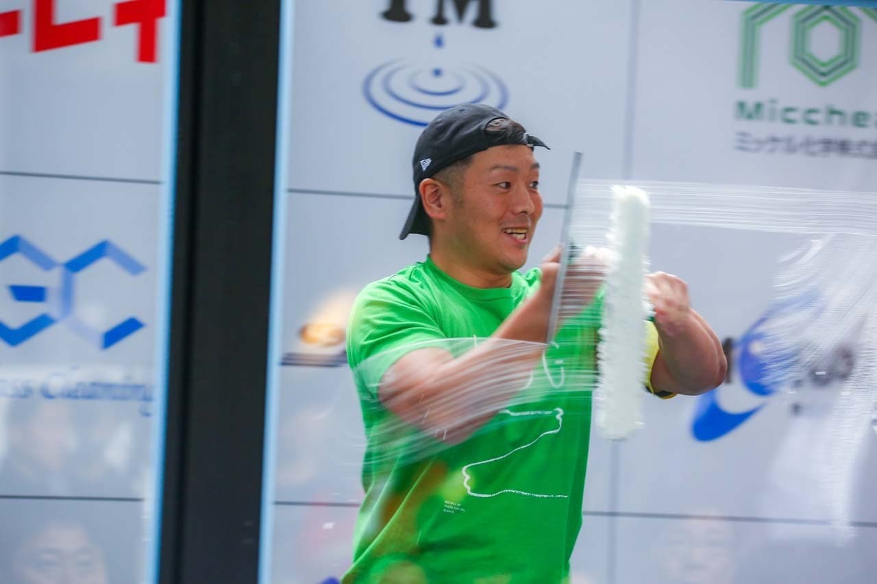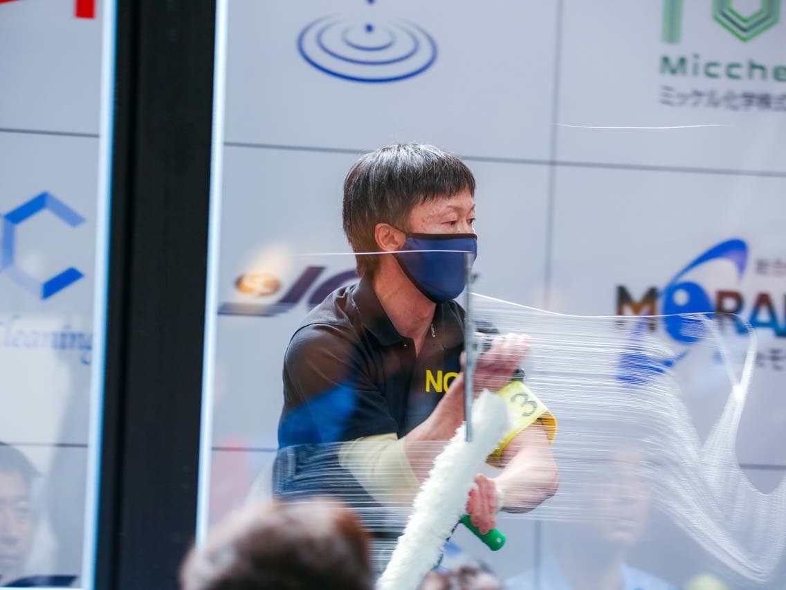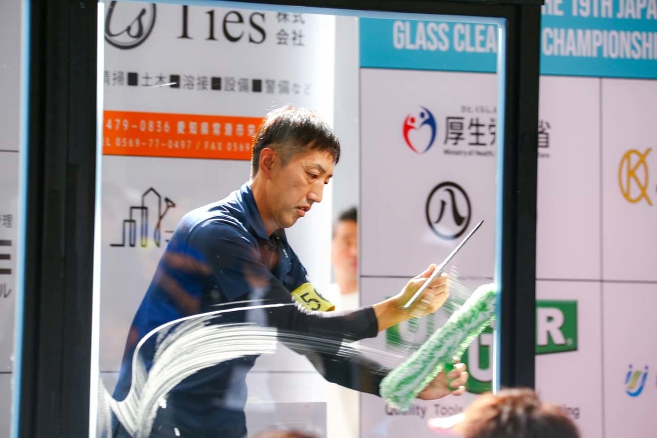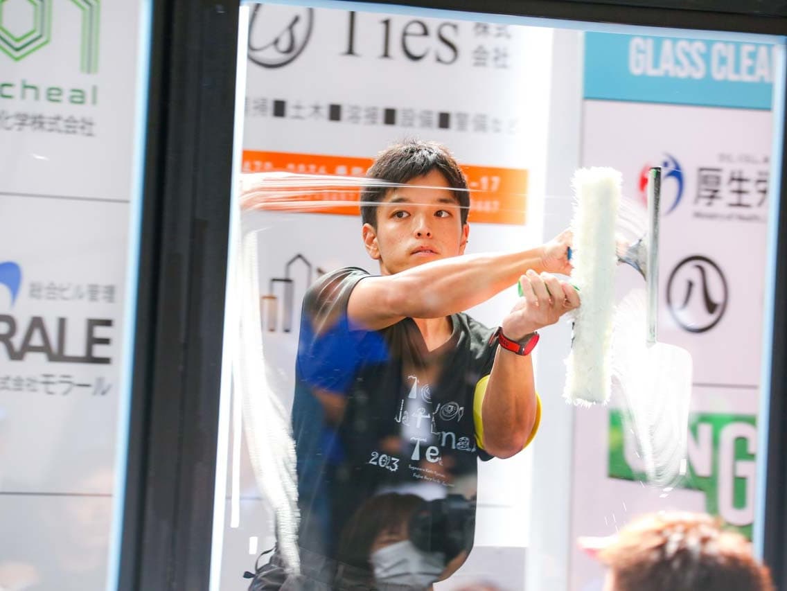 1040mm×1150mmの窓枠付き板ガラスを35cmのシャンプーと30cmのスクイージーを使用して、より早くよりきれいに拭き上げる技術を競います。