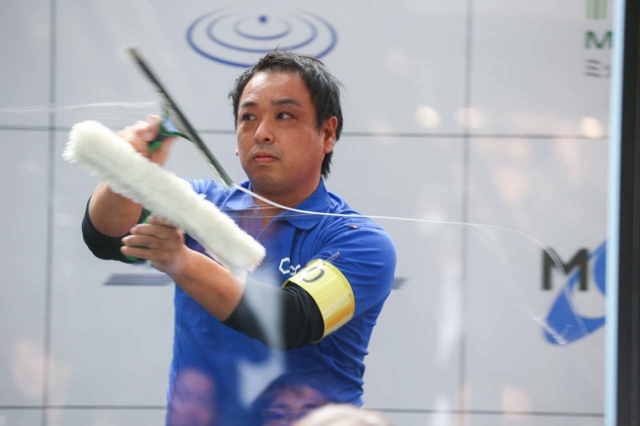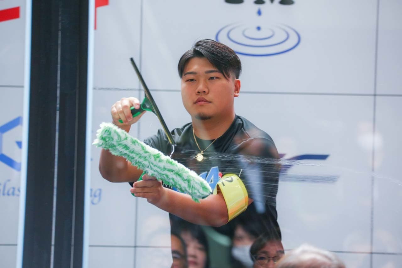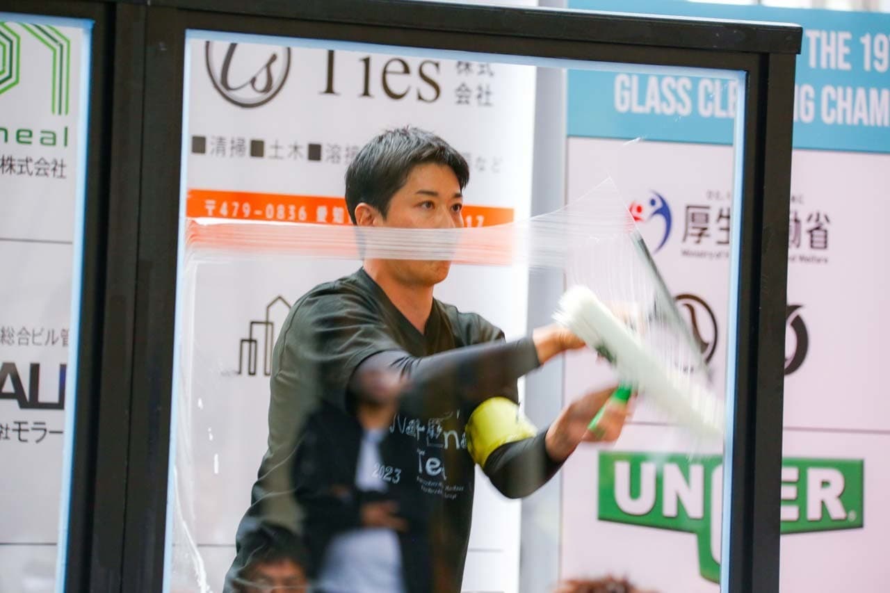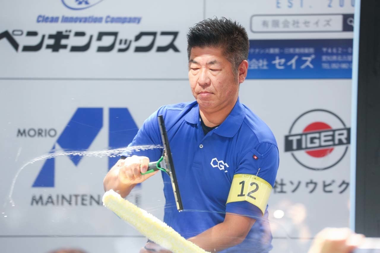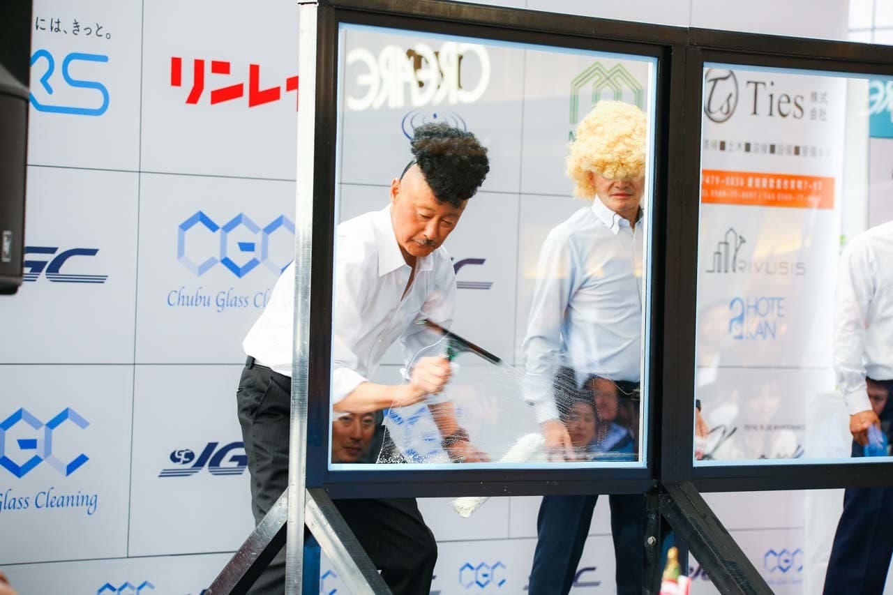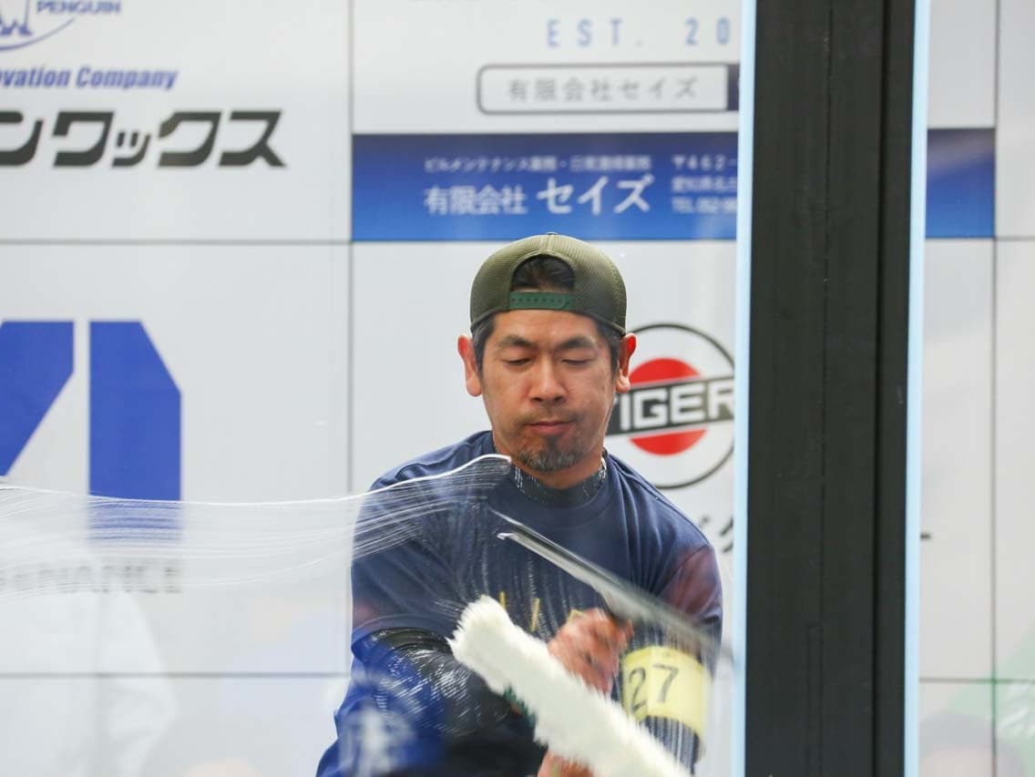1040mm×1150mmの窓枠付き板ガラスを35cmのシャンプーと30cmのスクイージーを使用して、より早くよりきれいに拭き上げる技術を競います。