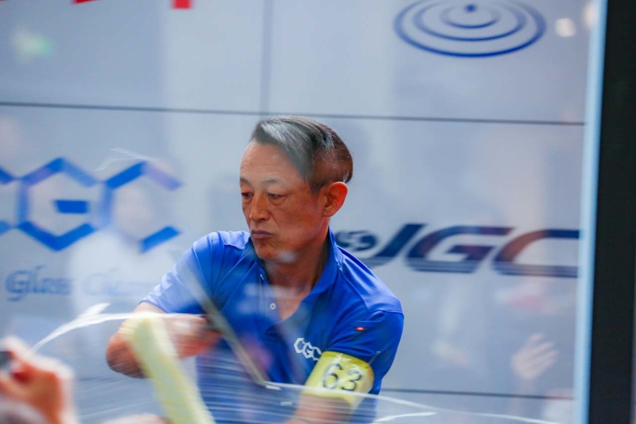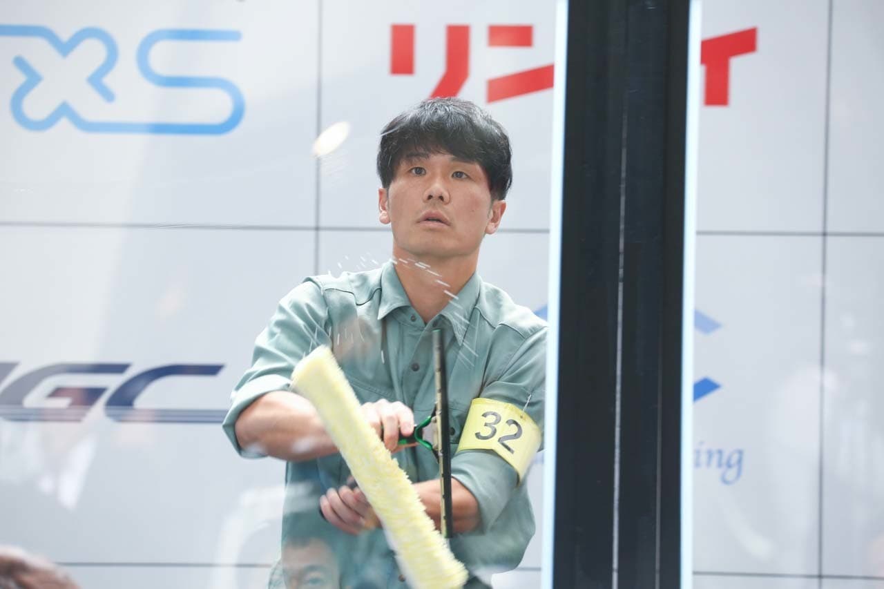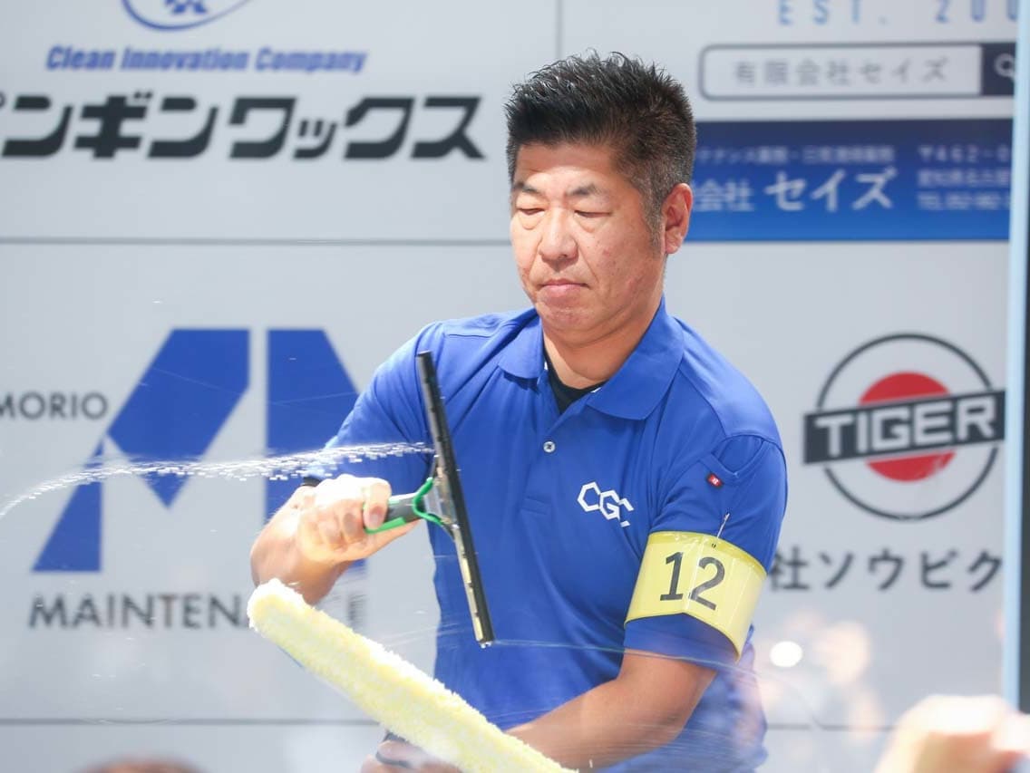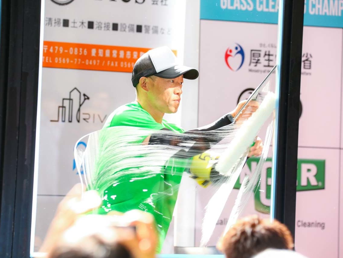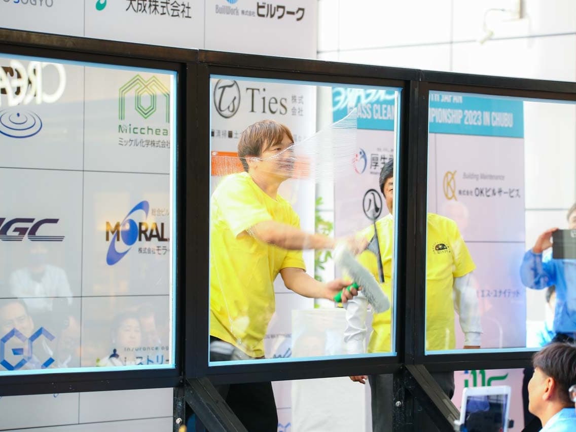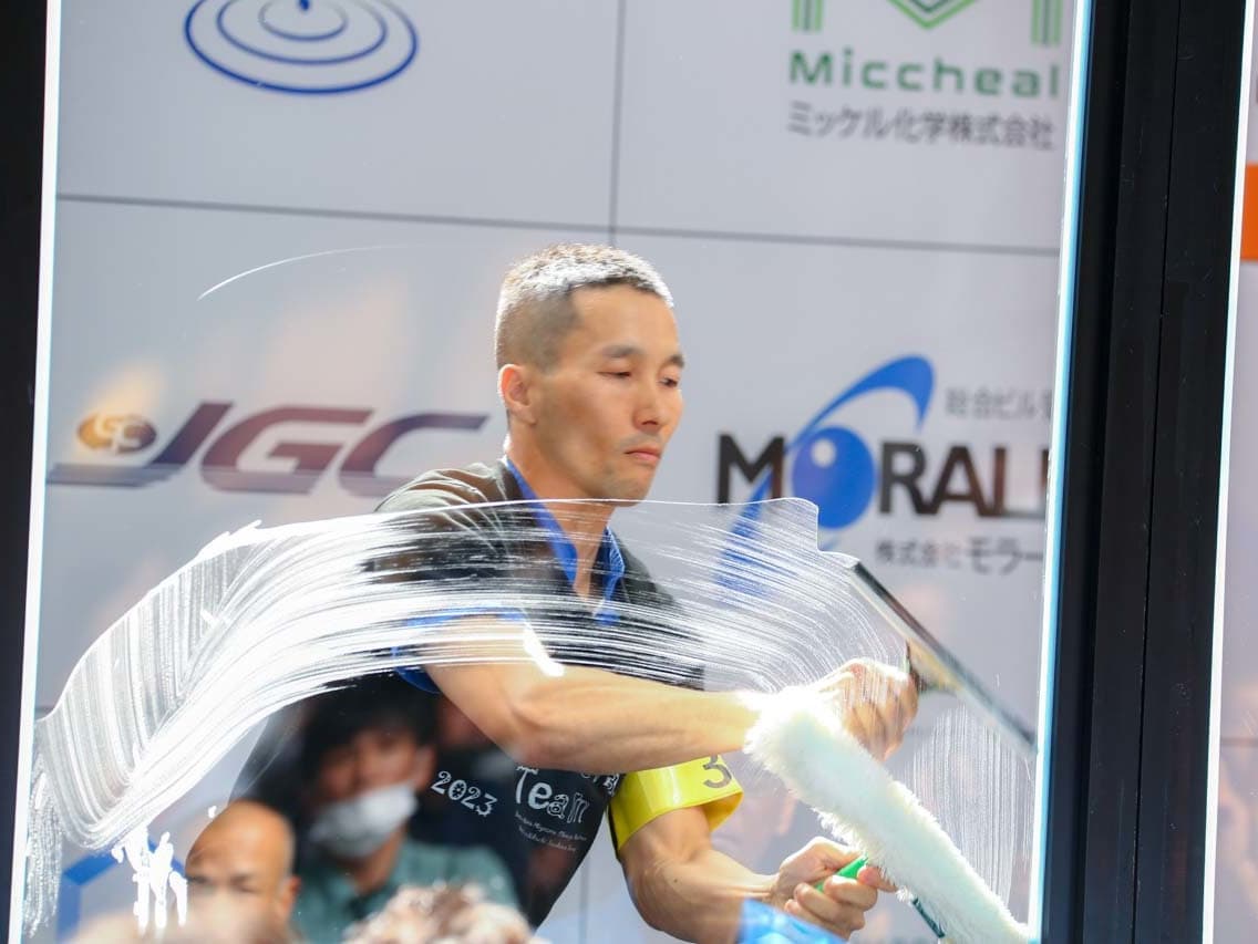 1040mm×1150mmの窓枠付き板ガラスを35cmのシャンプーと30cmのスクイージーを使用して、より早くよりきれいに拭き上げる技術を競います。