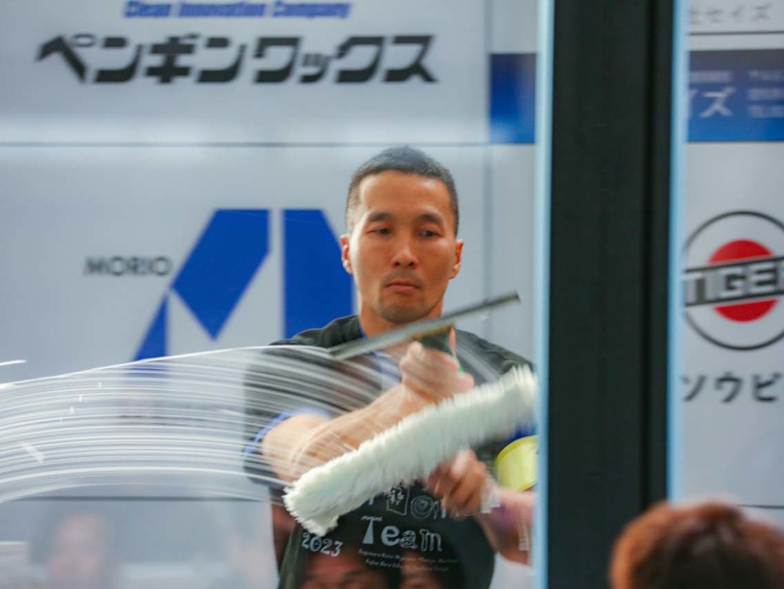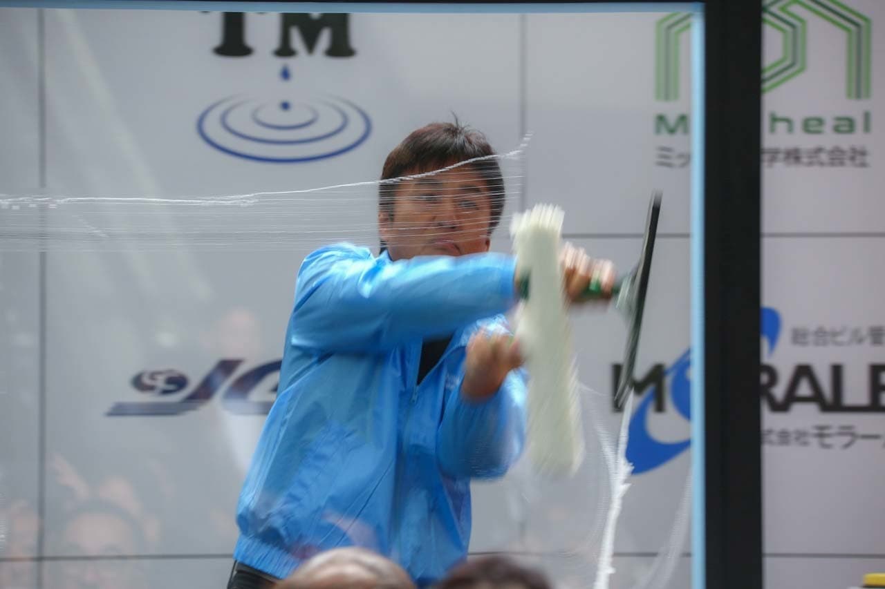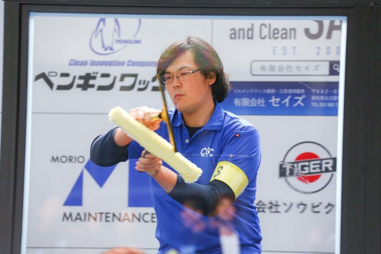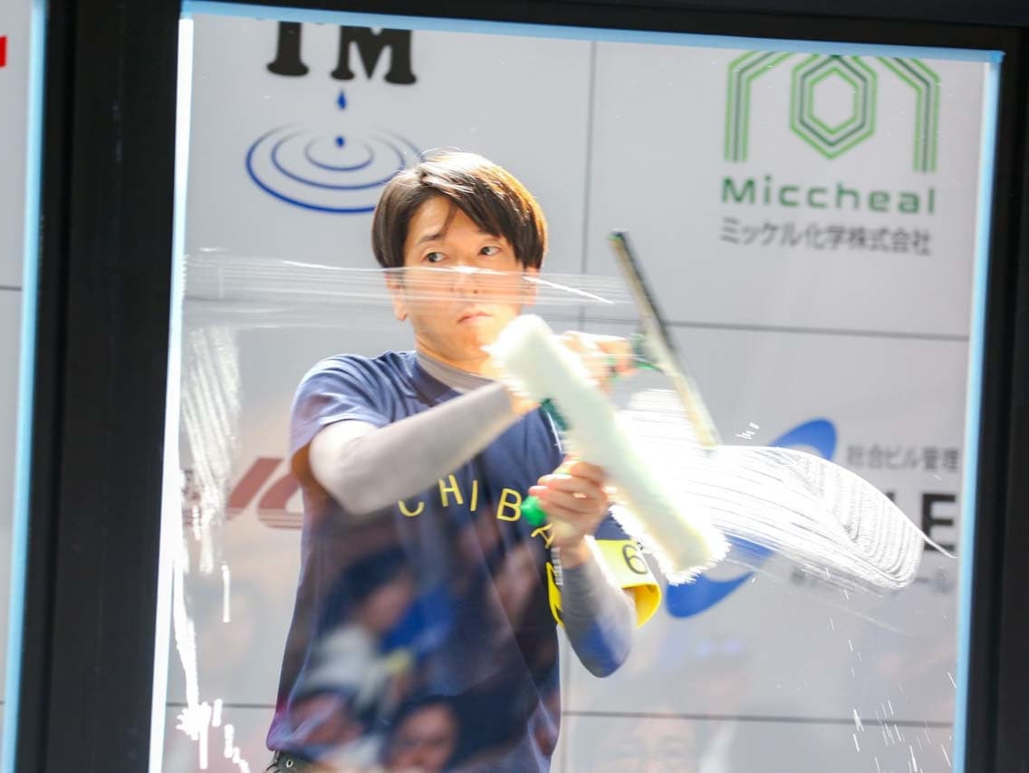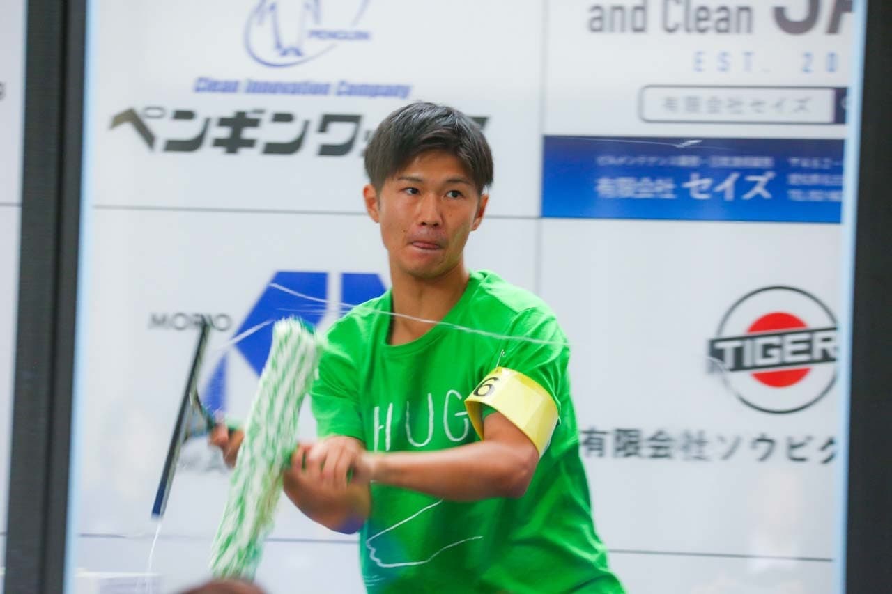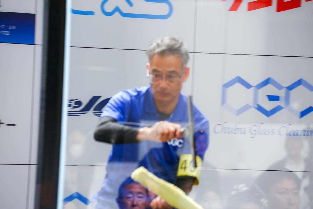 1040mm×1150mmの窓枠付き板ガラスを35cmのシャンプーと30cmのスクイージーを使用して、より早くよりきれいに拭き上げる技術を競います。