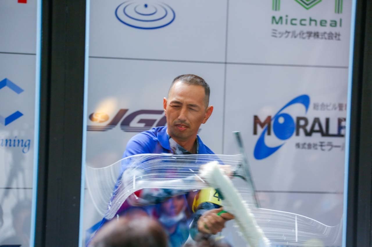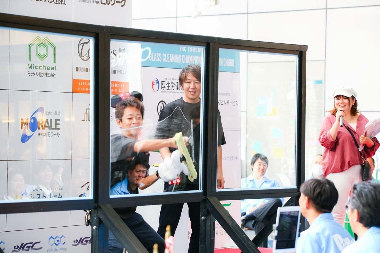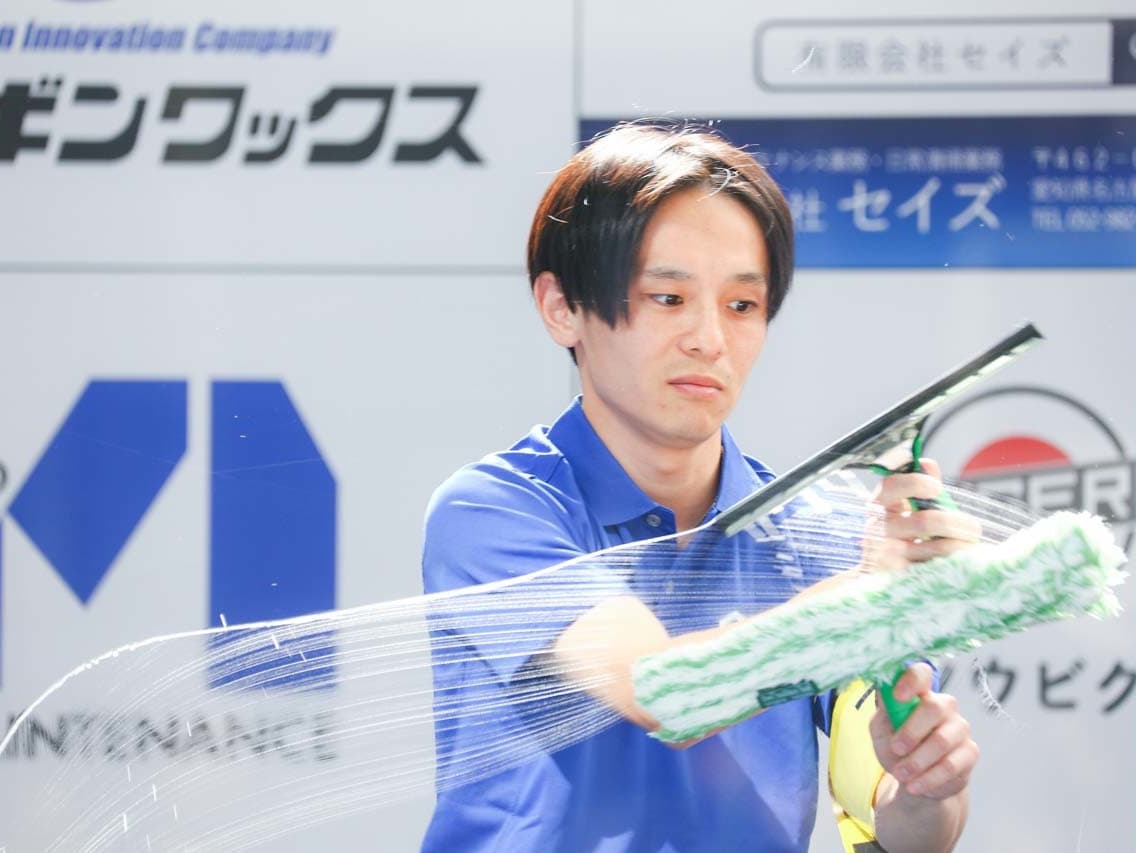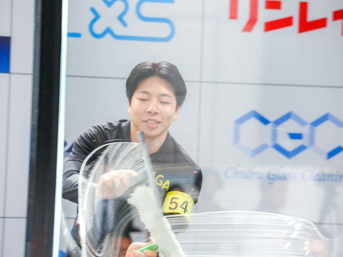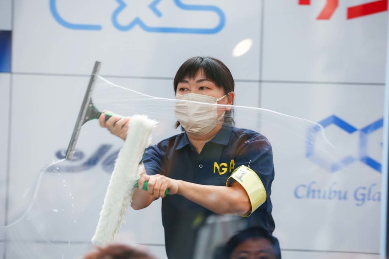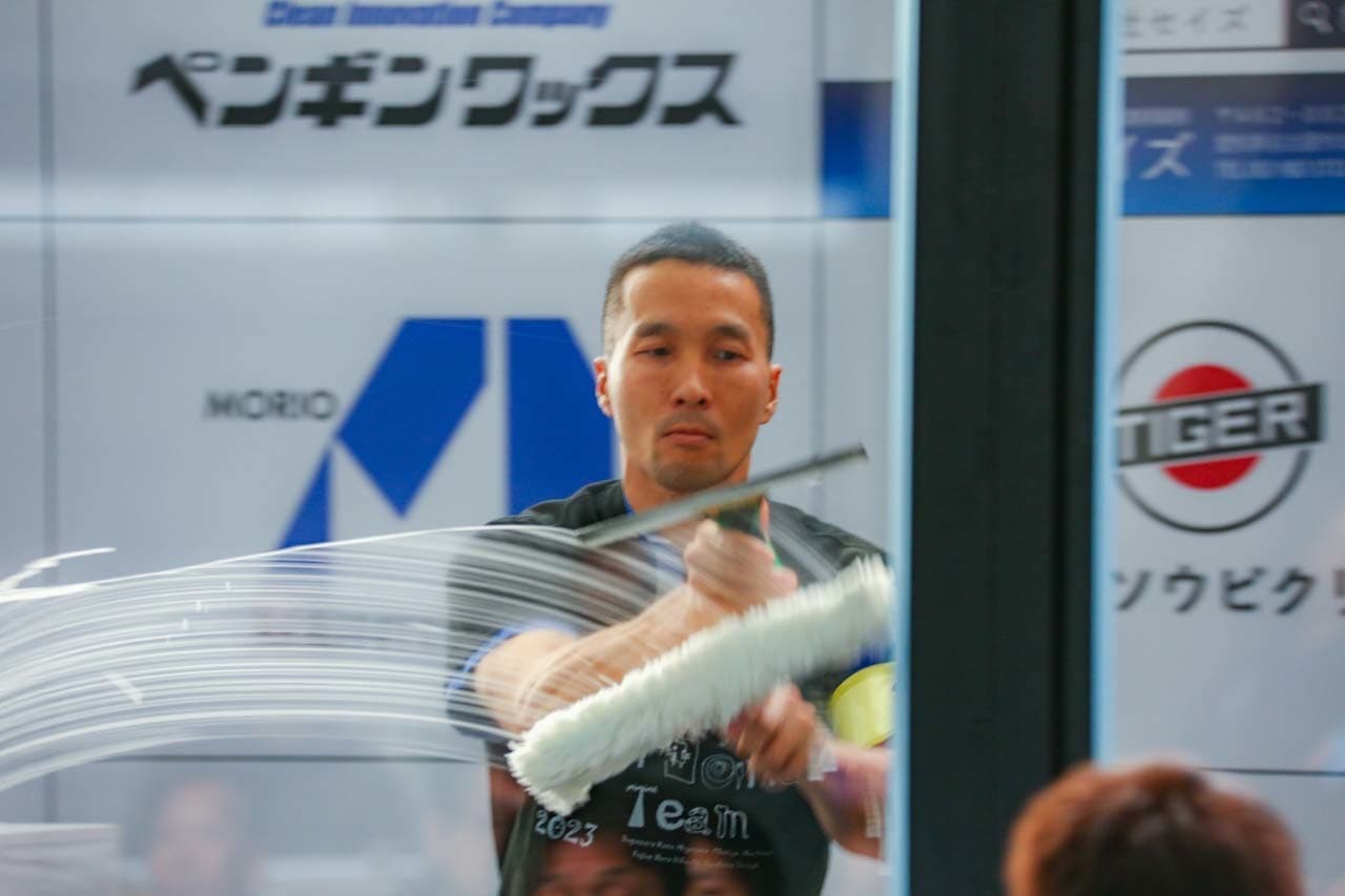 1040mm×1150mmの窓枠付き板ガラスを35cmのシャンプーと30cmのスクイージーを使用して、より早くよりきれいに拭き上げる技術を競います。