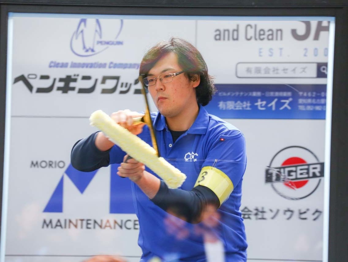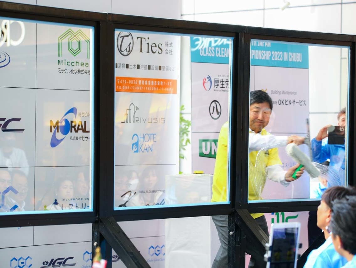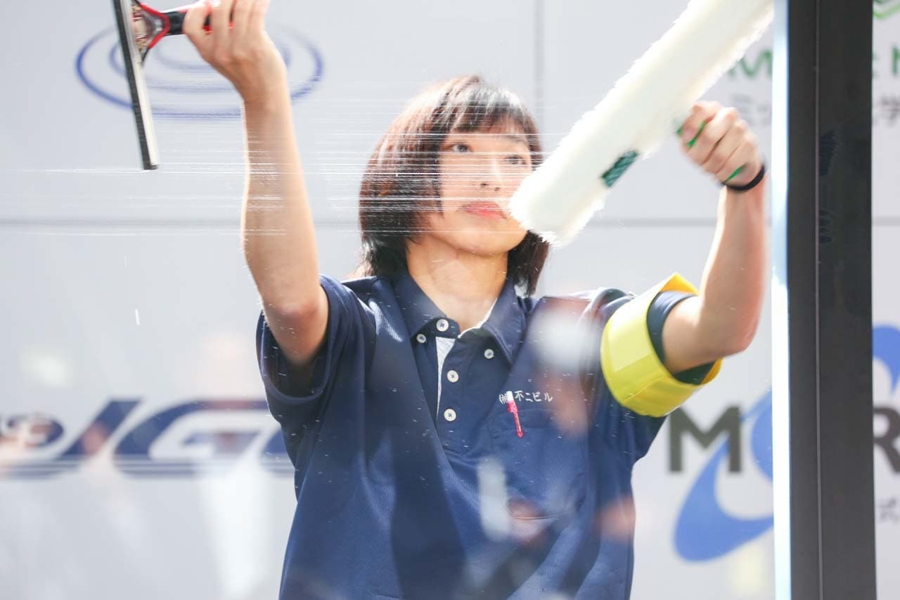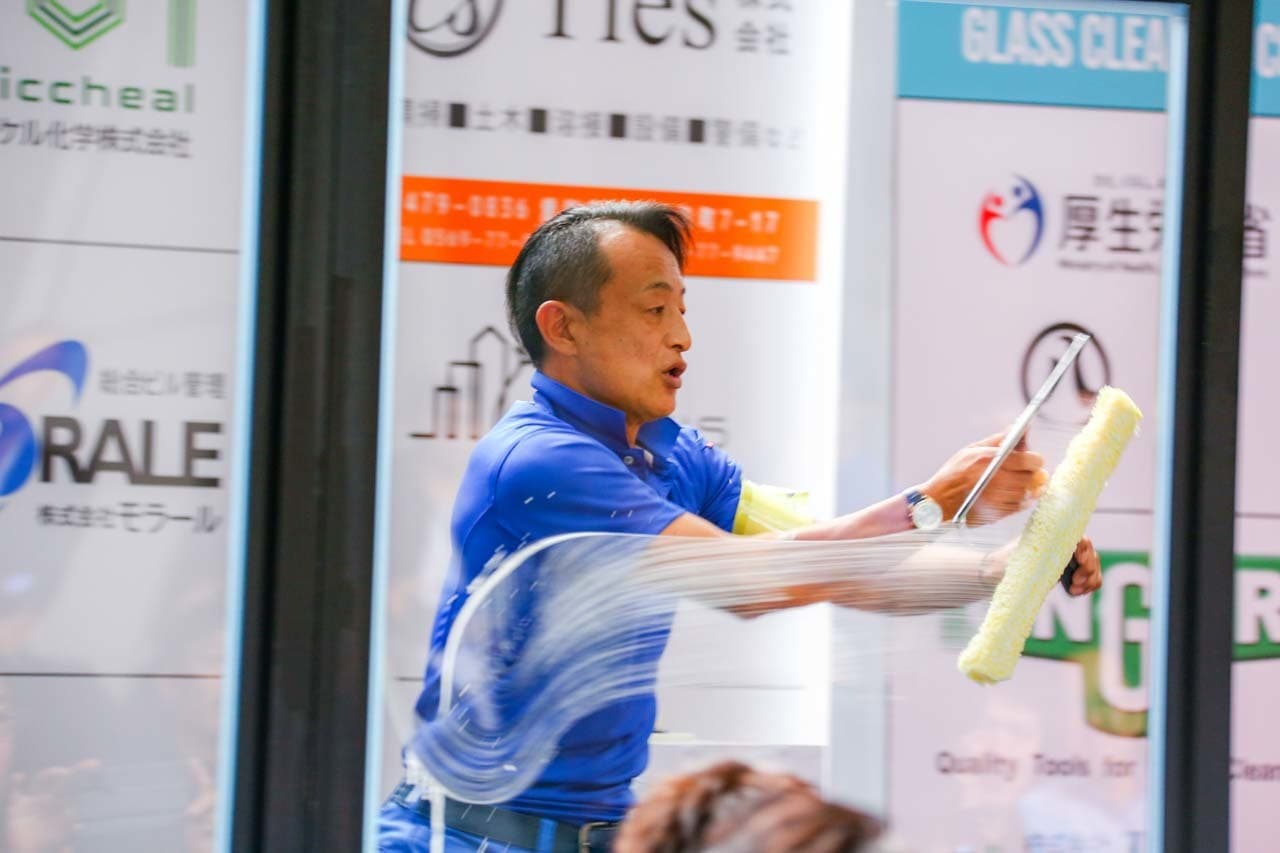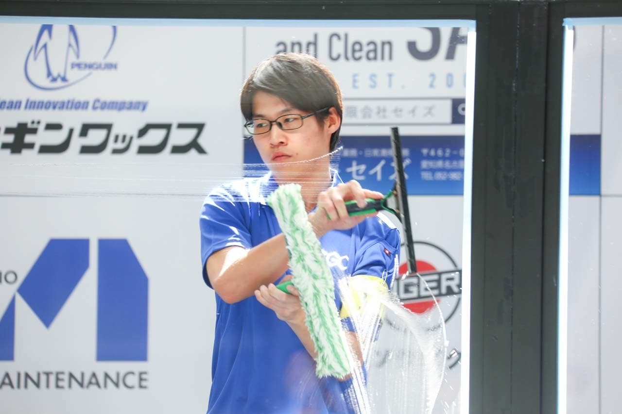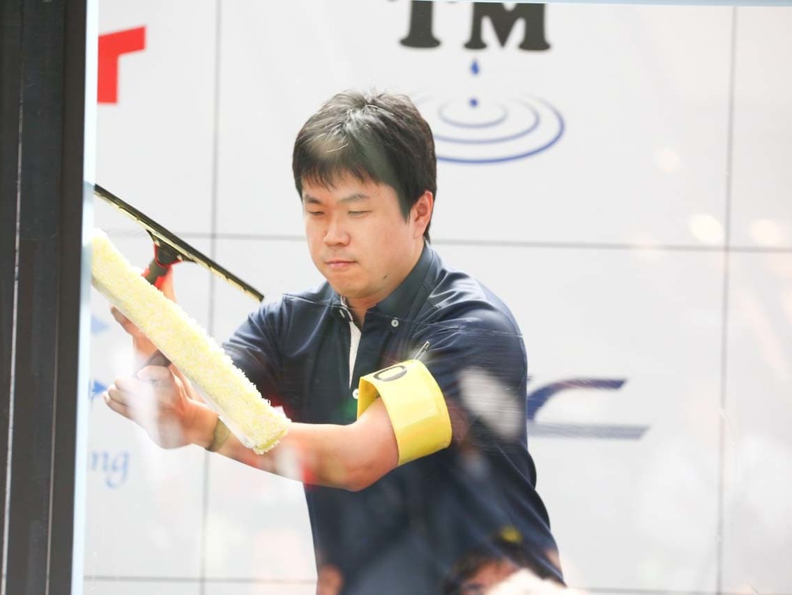 1040mm×1150mmの窓枠付き板ガラスを35cmのシャンプーと30cmのスクイージーを使用して、より早くよりきれいに拭き上げる技術を競います。