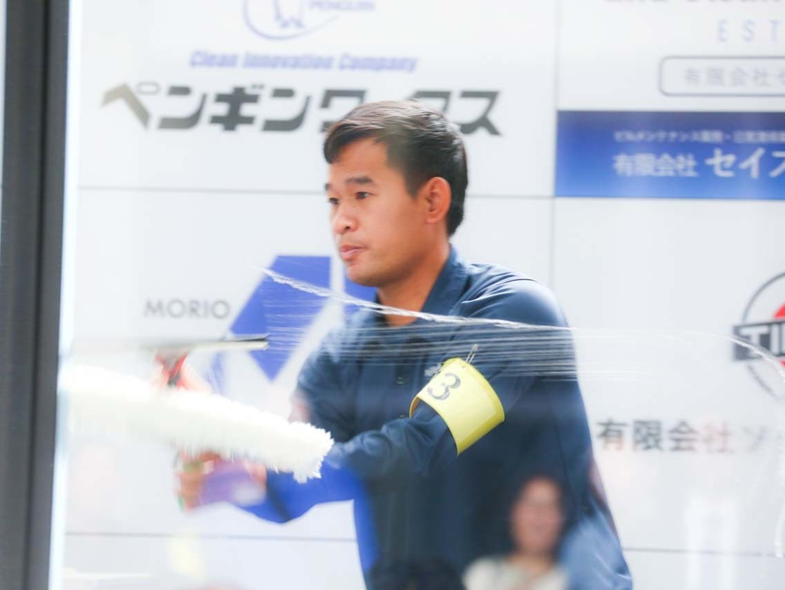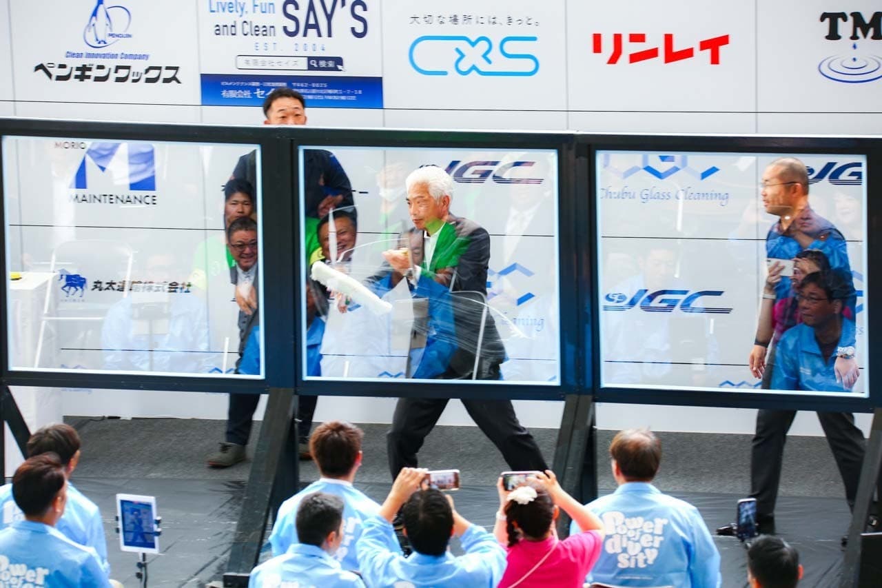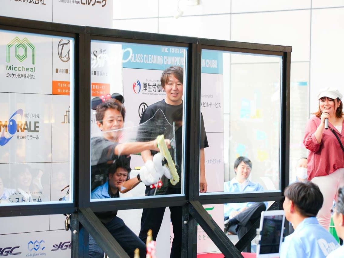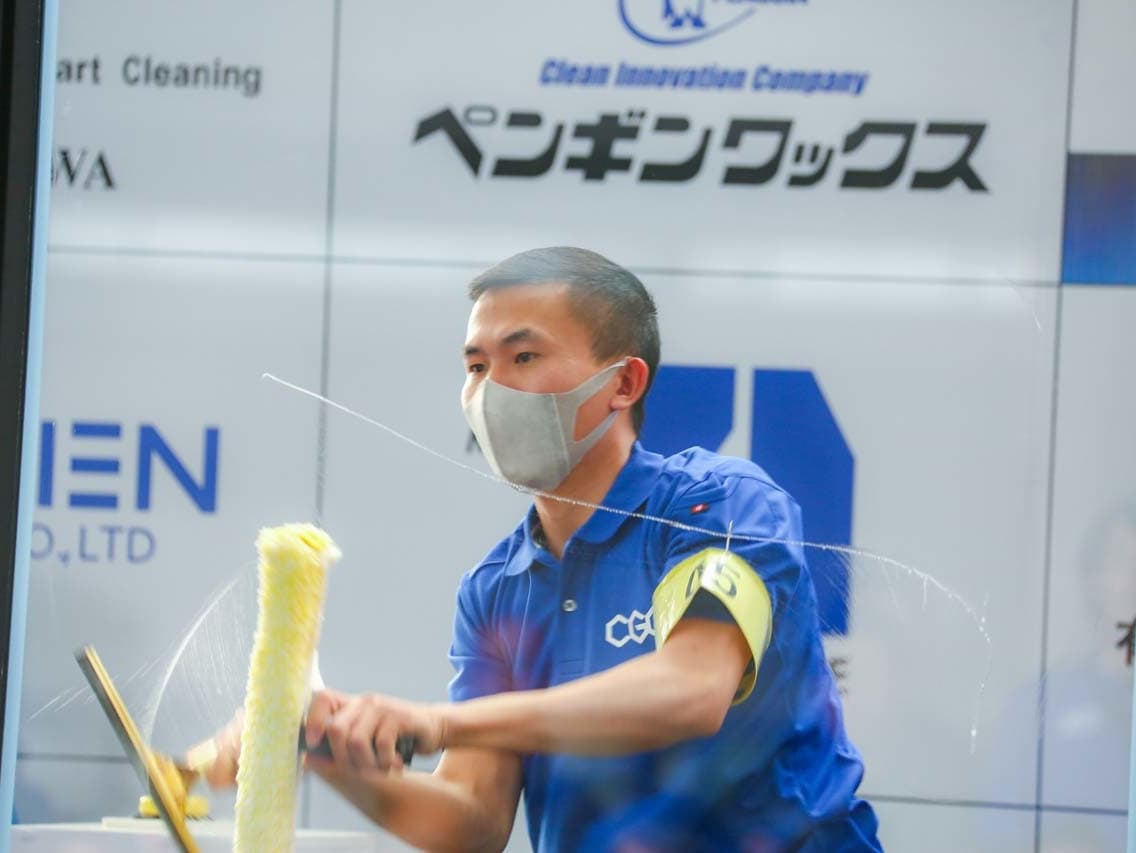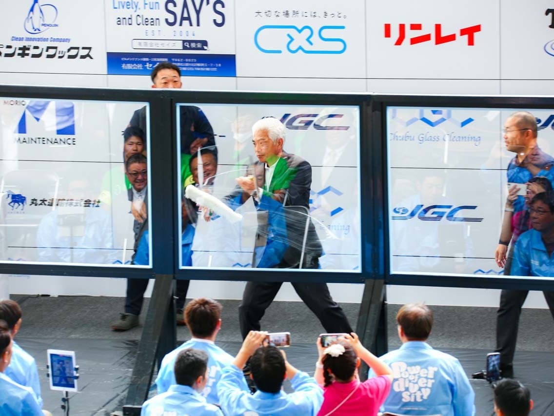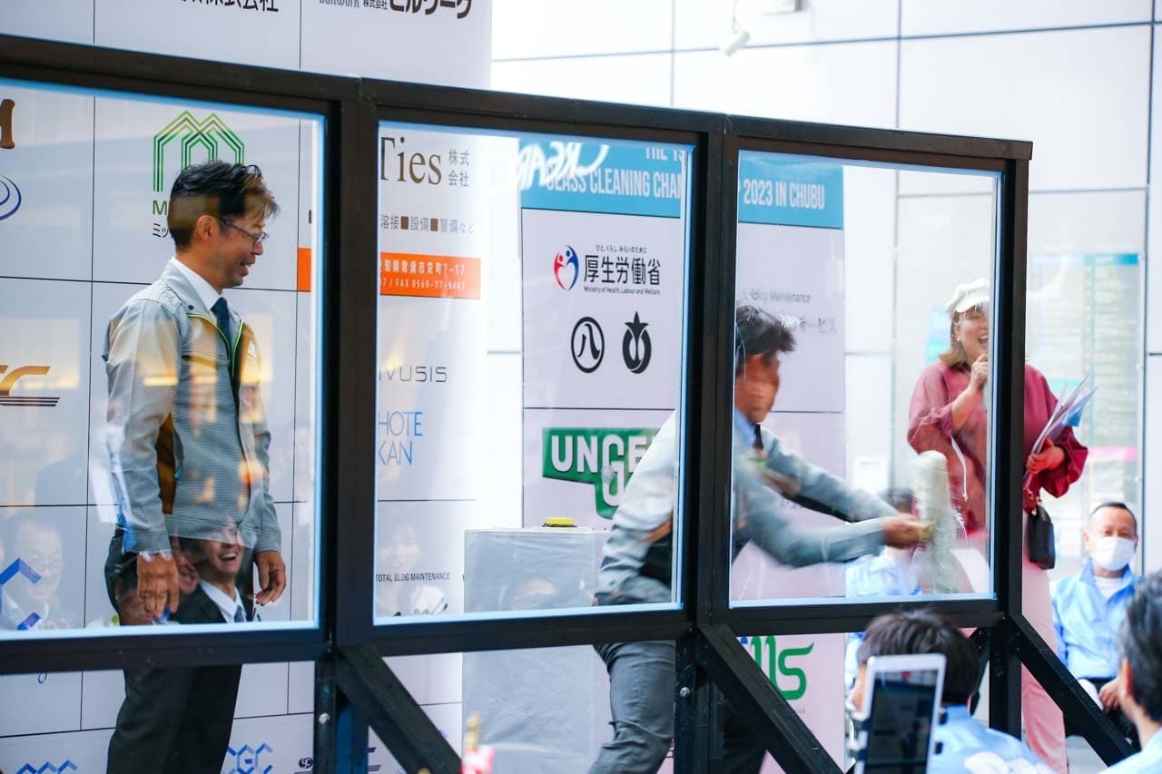 1040mm×1150mmの窓枠付き板ガラスを35cmのシャンプーと30cmのスクイージーを使用して、より早くよりきれいに拭き上げる技術を競います。