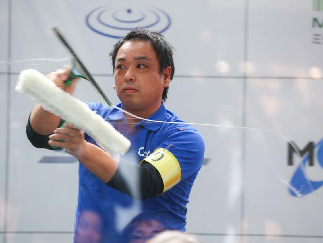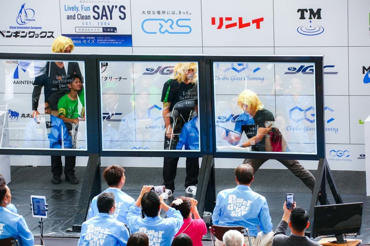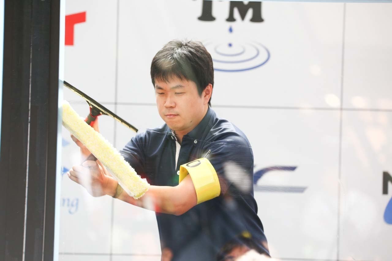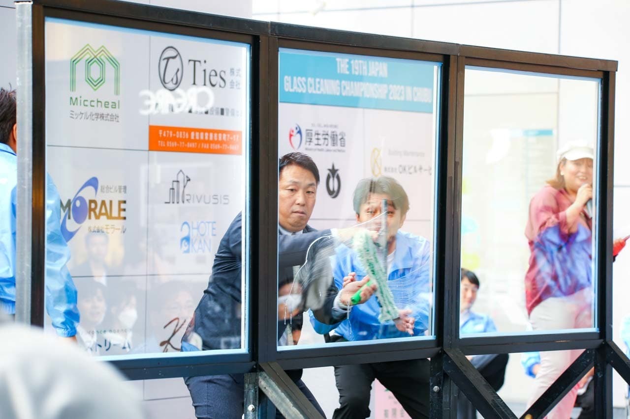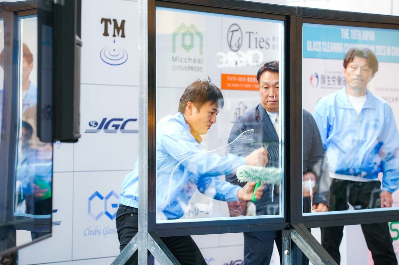 1040mm×1150mmの窓枠付き板ガラスを35cmのシャンプーと30cmのスクイージーを使用して、より早くよりきれいに拭き上げる技術を競います。