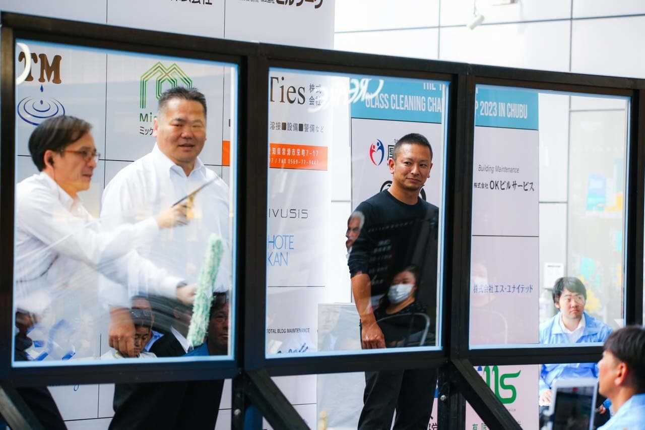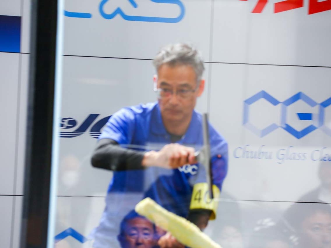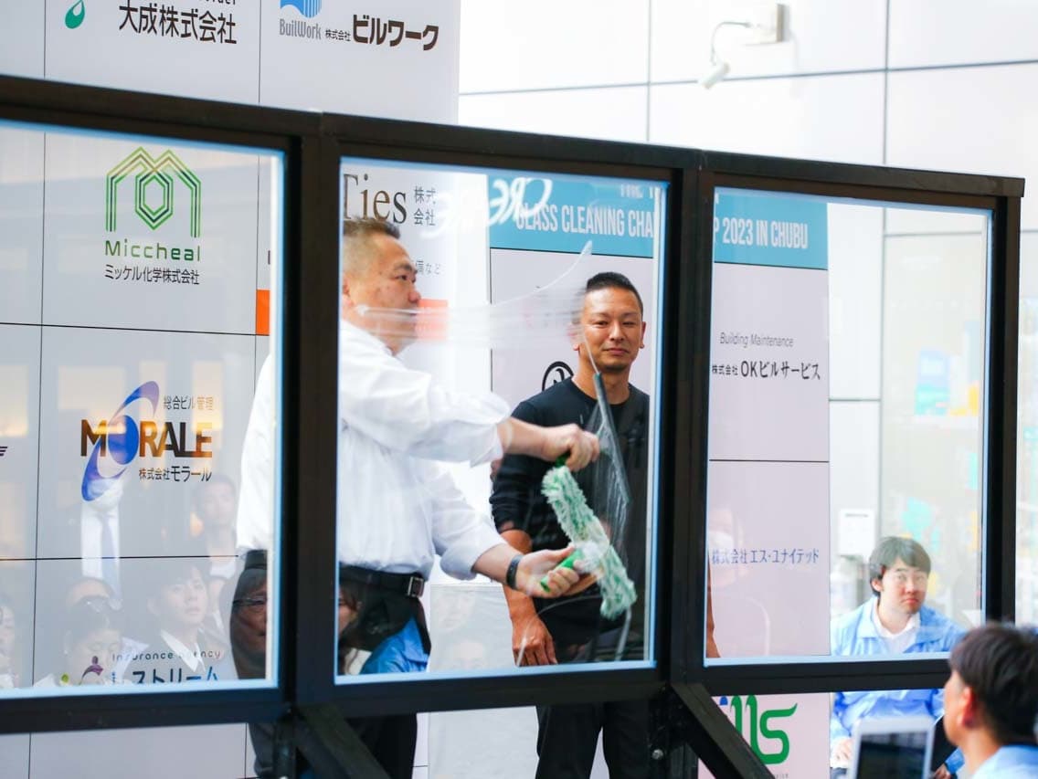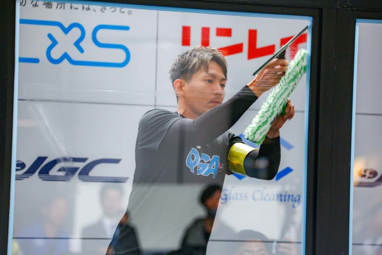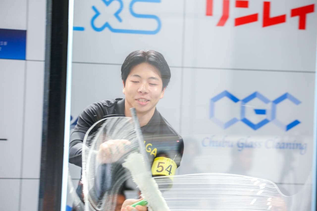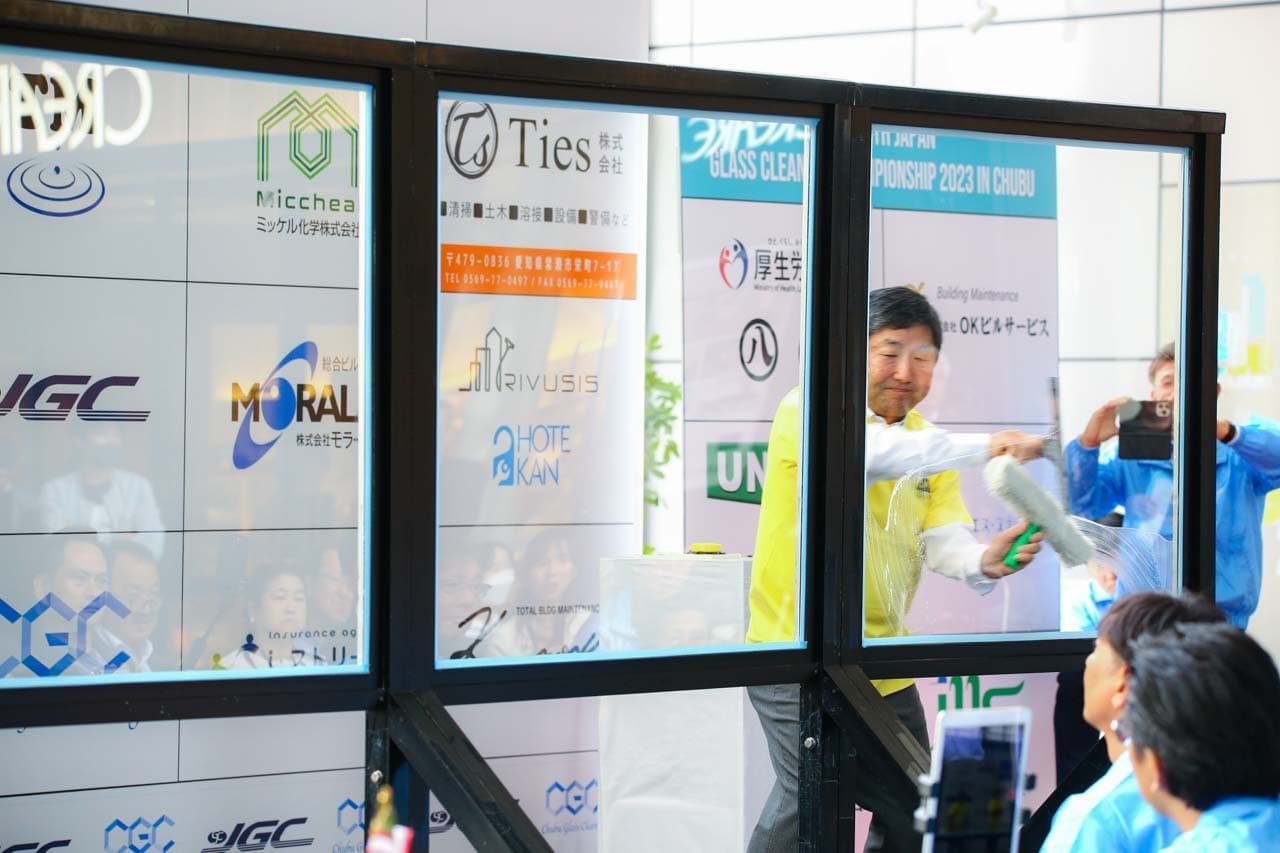 1040mm×1150mmの窓枠付き板ガラスを35cmのシャンプーと30cmのスクイージーを使用して、より早くよりきれいに拭き上げる技術を競います。