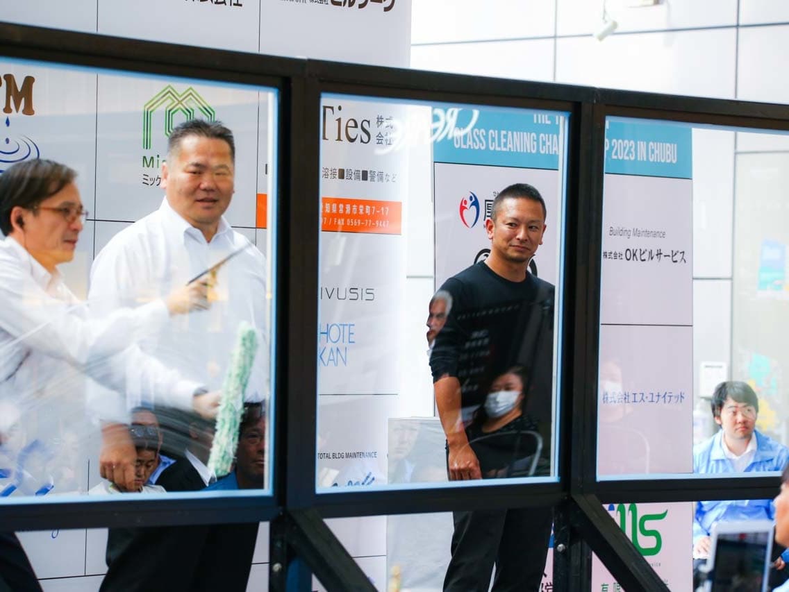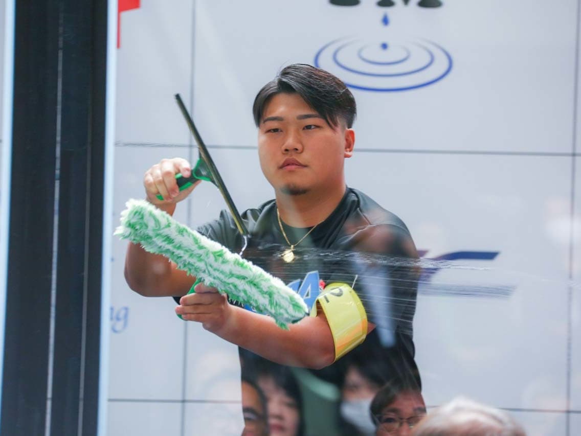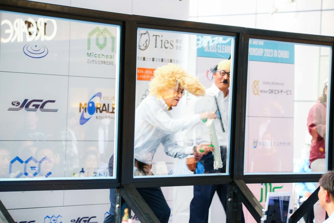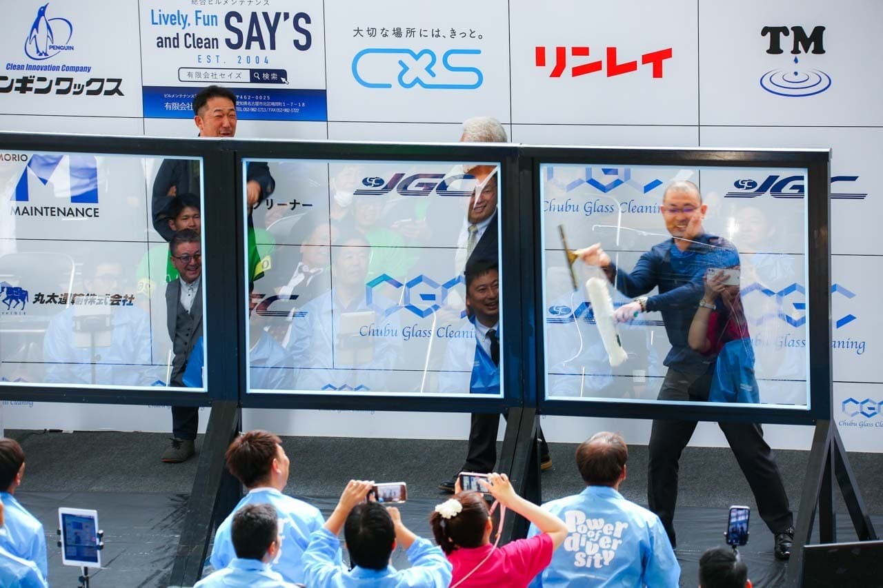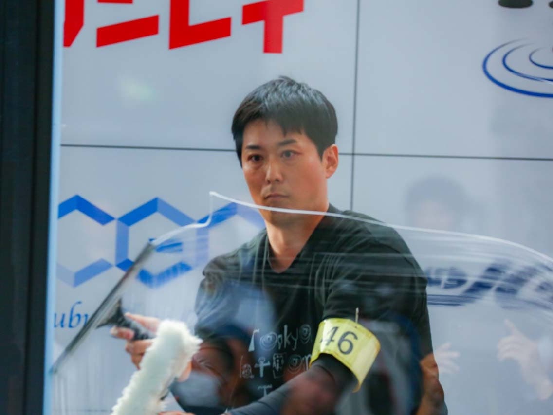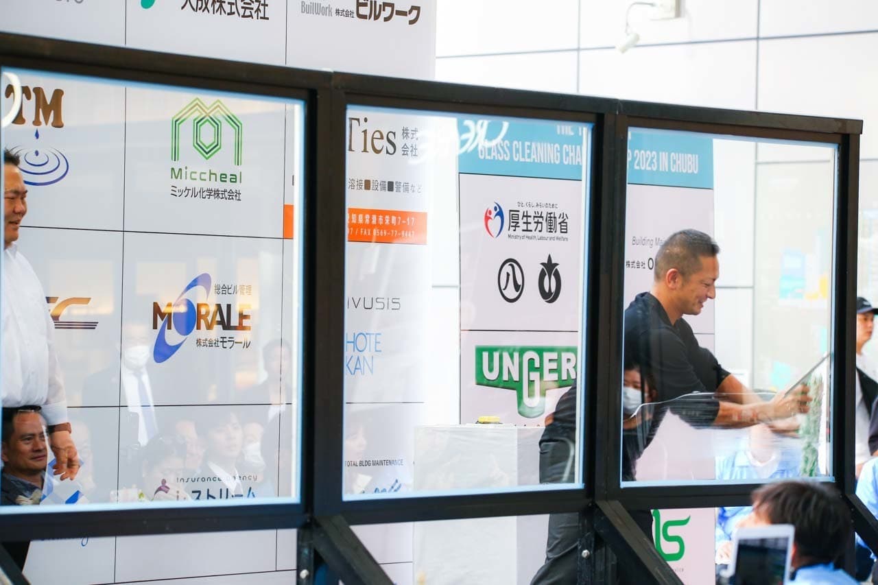 1040mm×1150mmの窓枠付き板ガラスを35cmのシャンプーと30cmのスクイージーを使用して、より早くよりきれいに拭き上げる技術を競います。