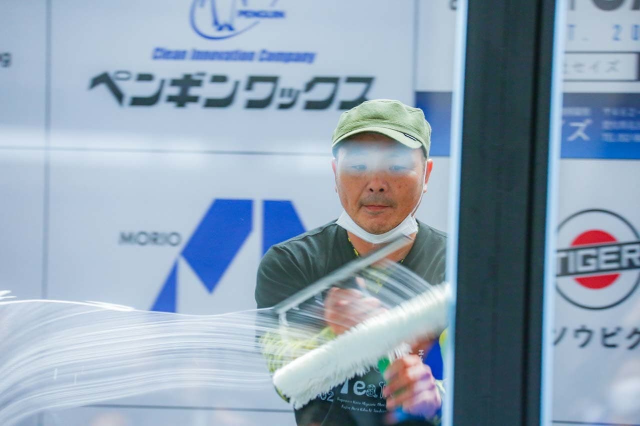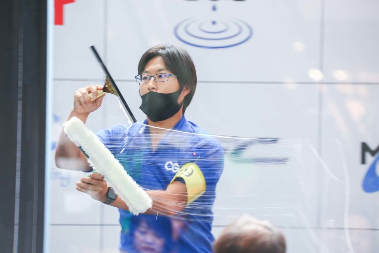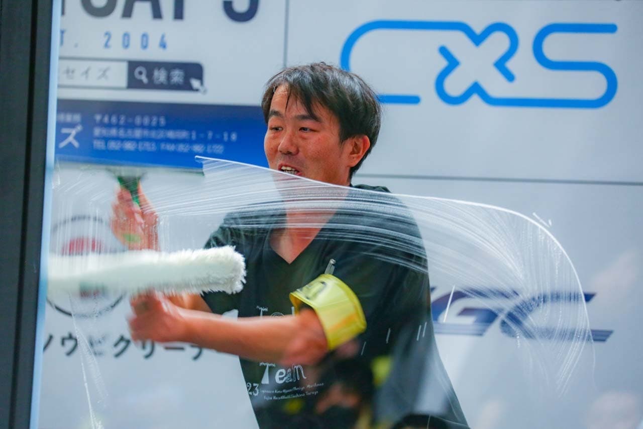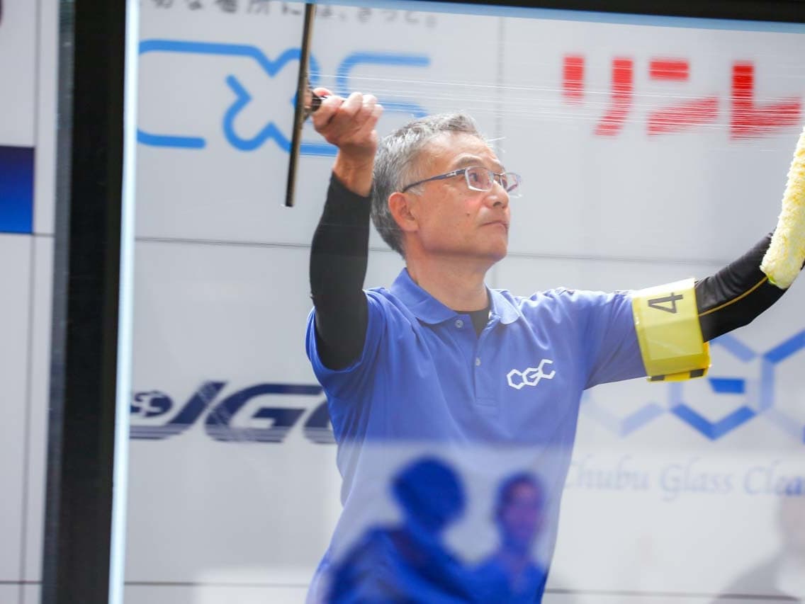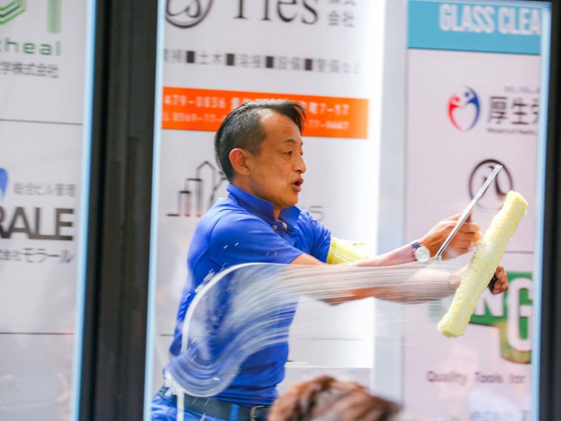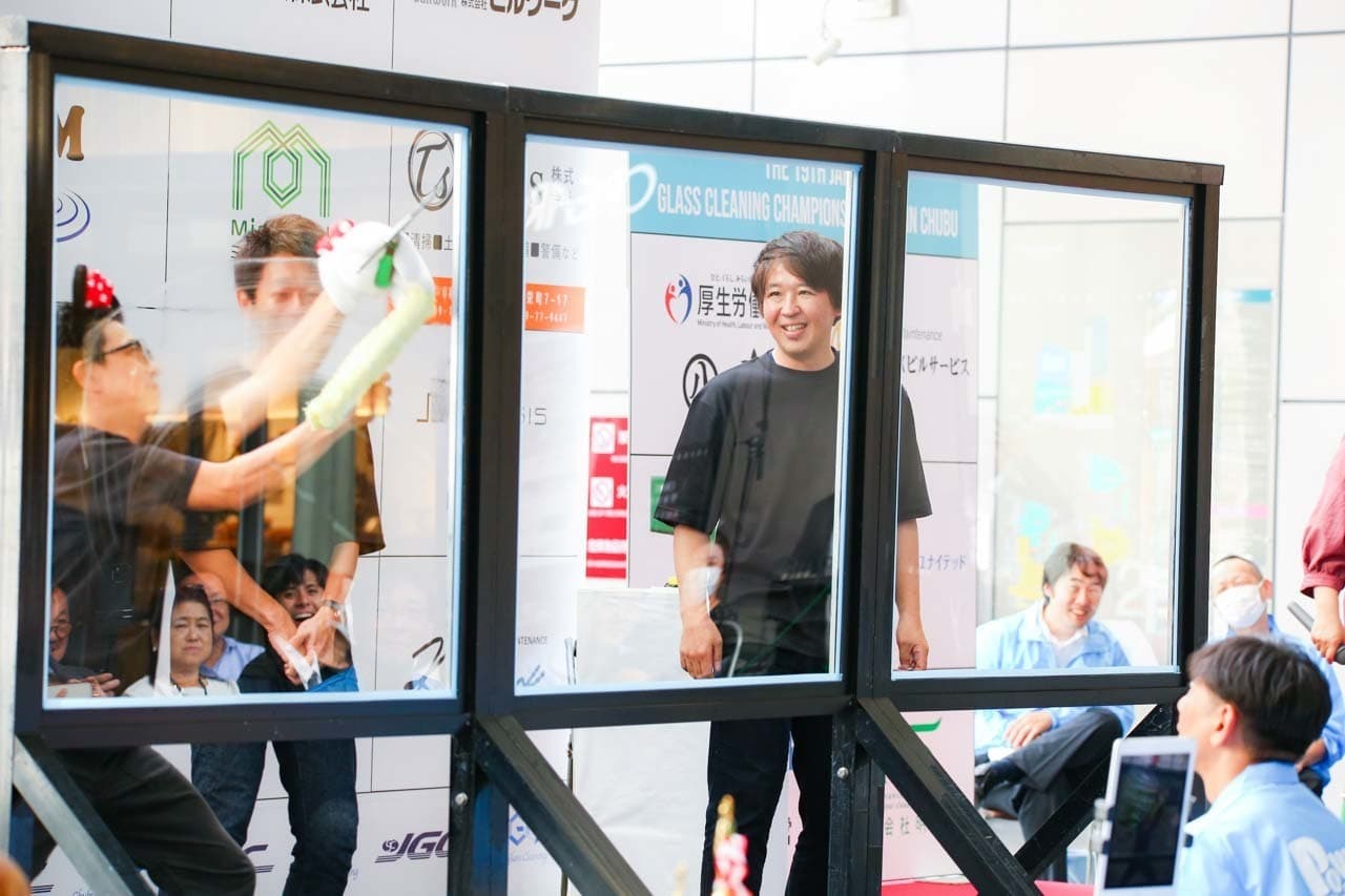 1040mm×1150mmの窓枠付き板ガラスを35cmのシャンプーと30cmのスクイージーを使用して、より早くよりきれいに拭き上げる技術を競います。