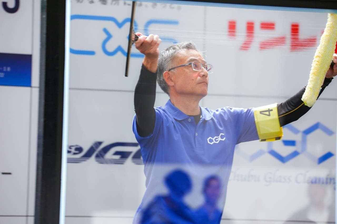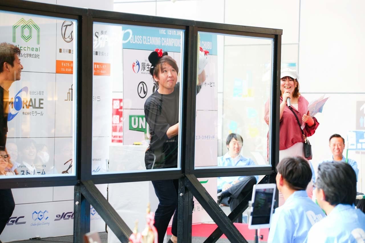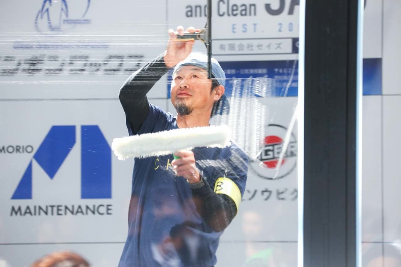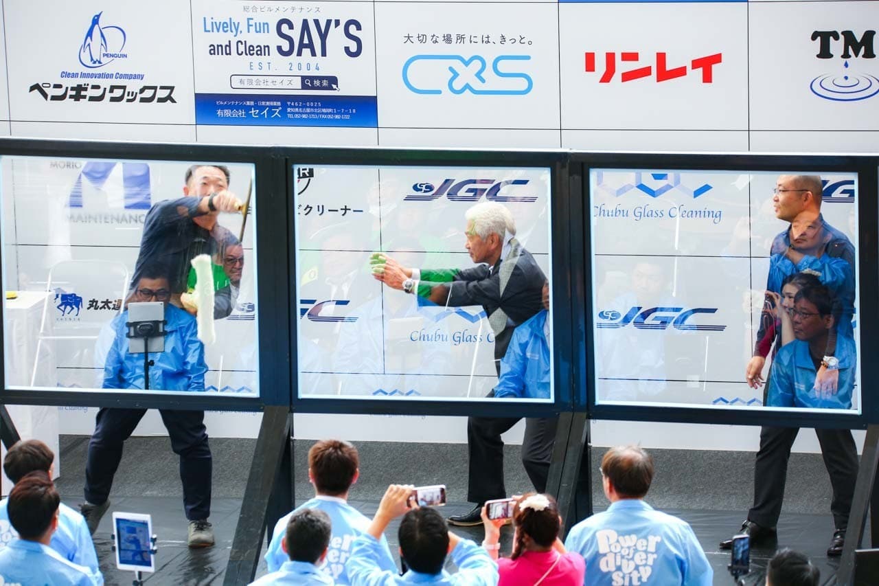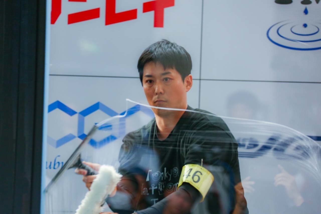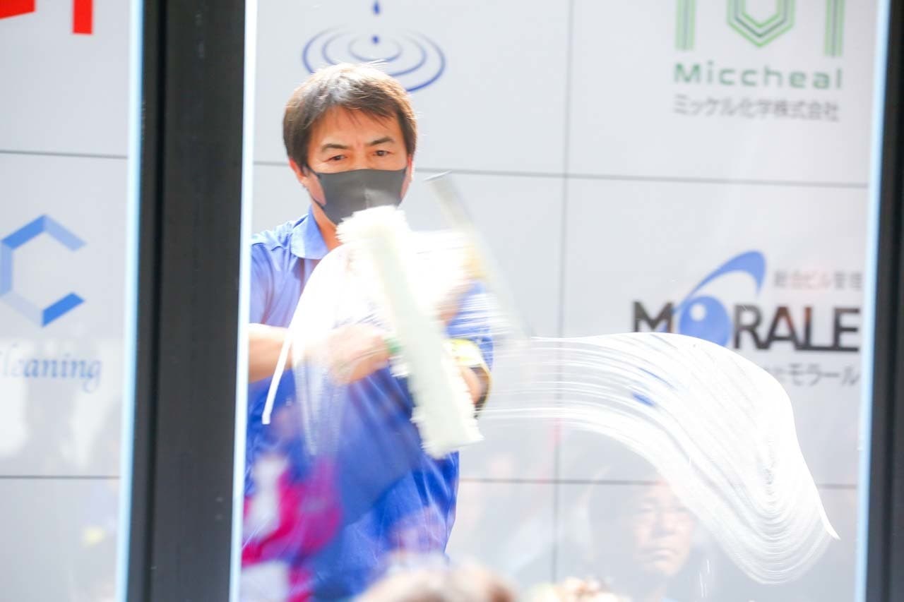 1040mm×1150mmの窓枠付き板ガラスを35cmのシャンプーと30cmのスクイージーを使用して、より早くよりきれいに拭き上げる技術を競います。