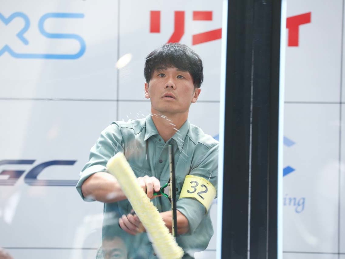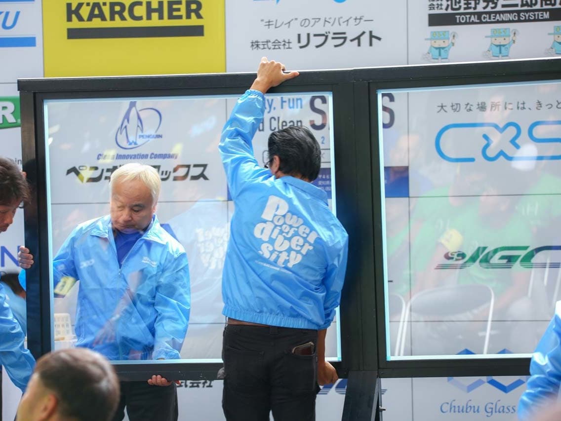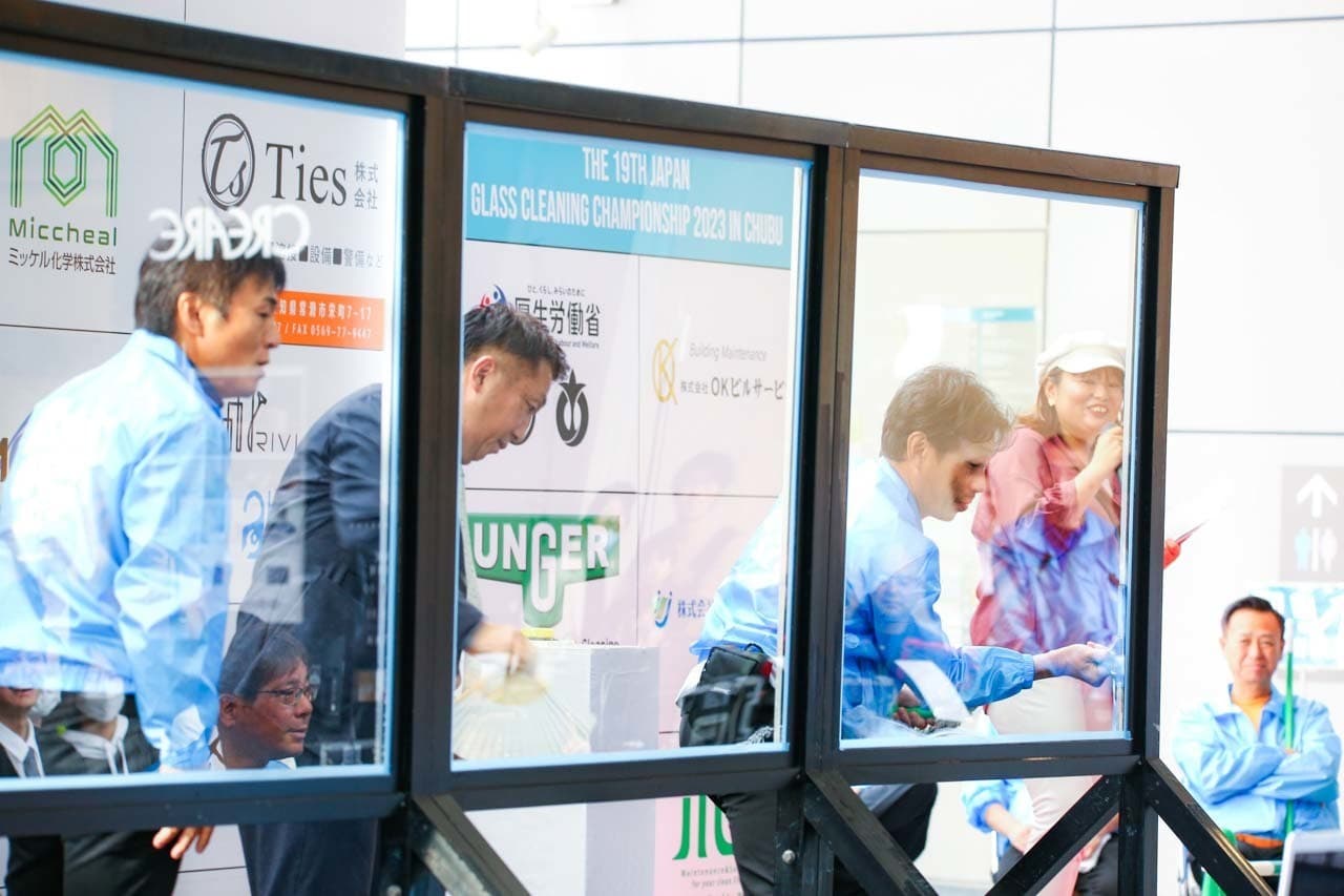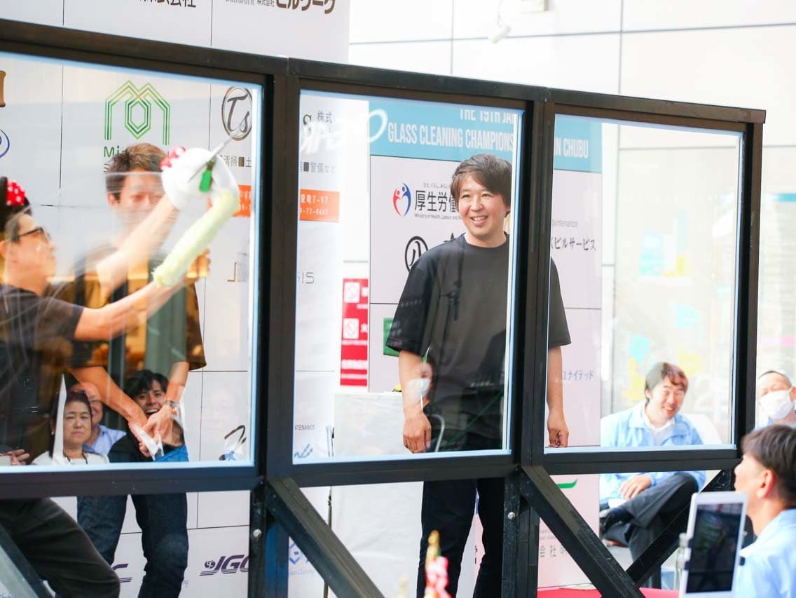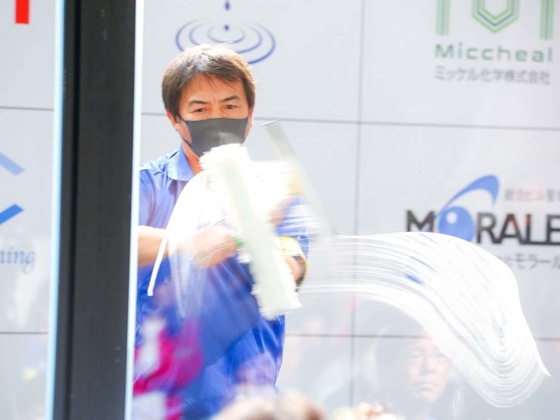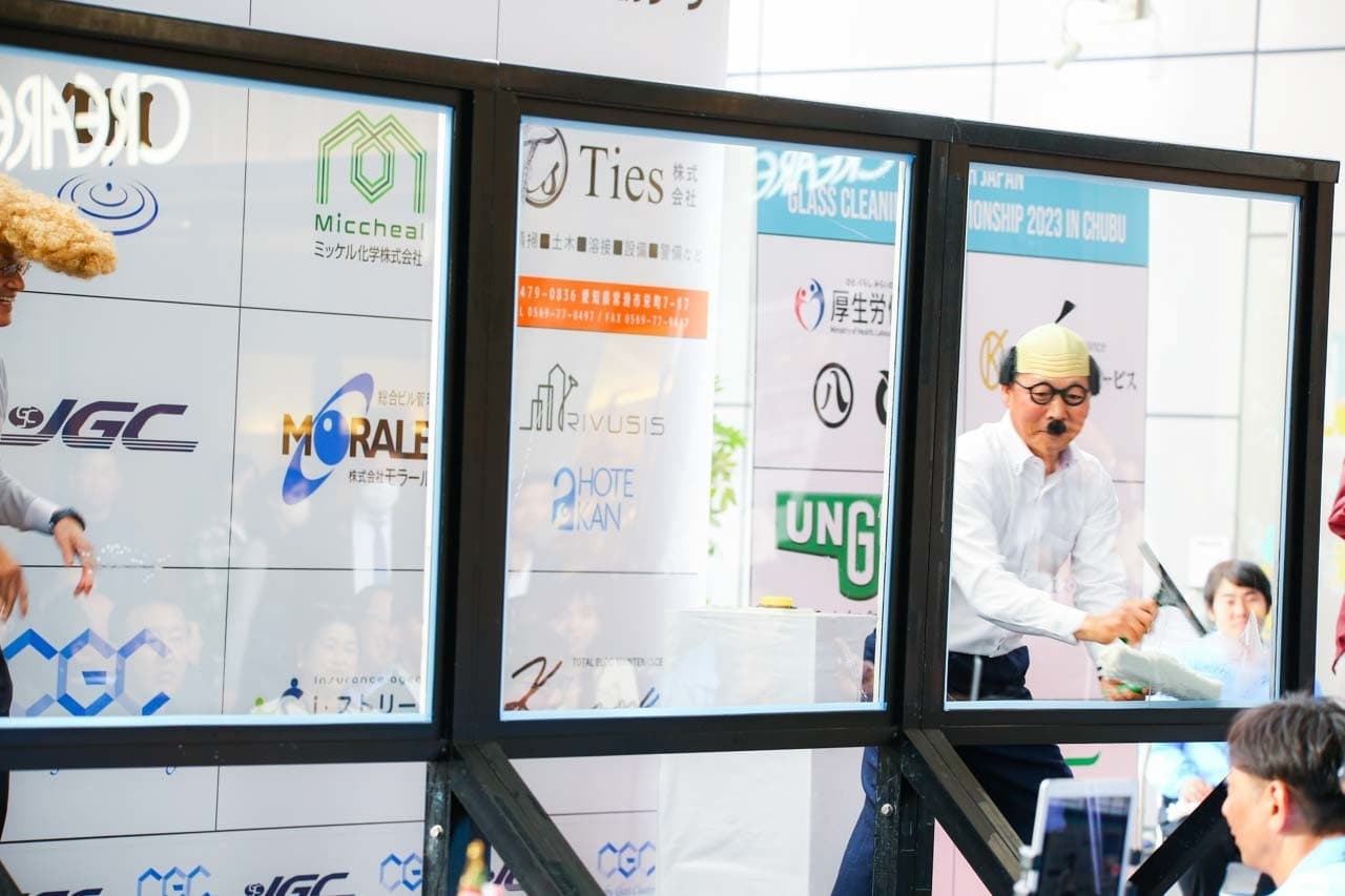 1040mm×1150mmの窓枠付き板ガラスを35cmのシャンプーと30cmのスクイージーを使用して、より早くよりきれいに拭き上げる技術を競います。