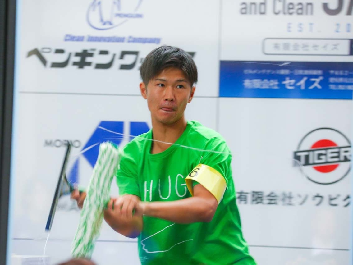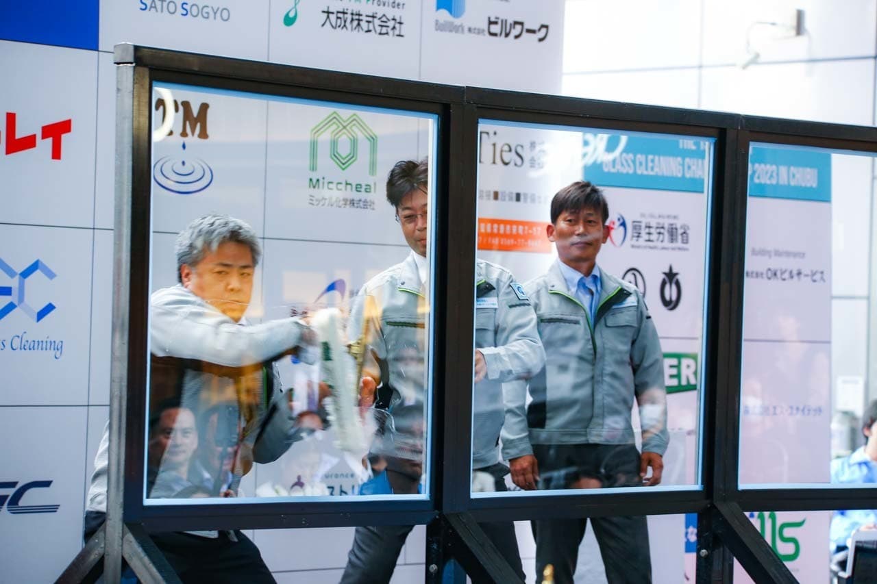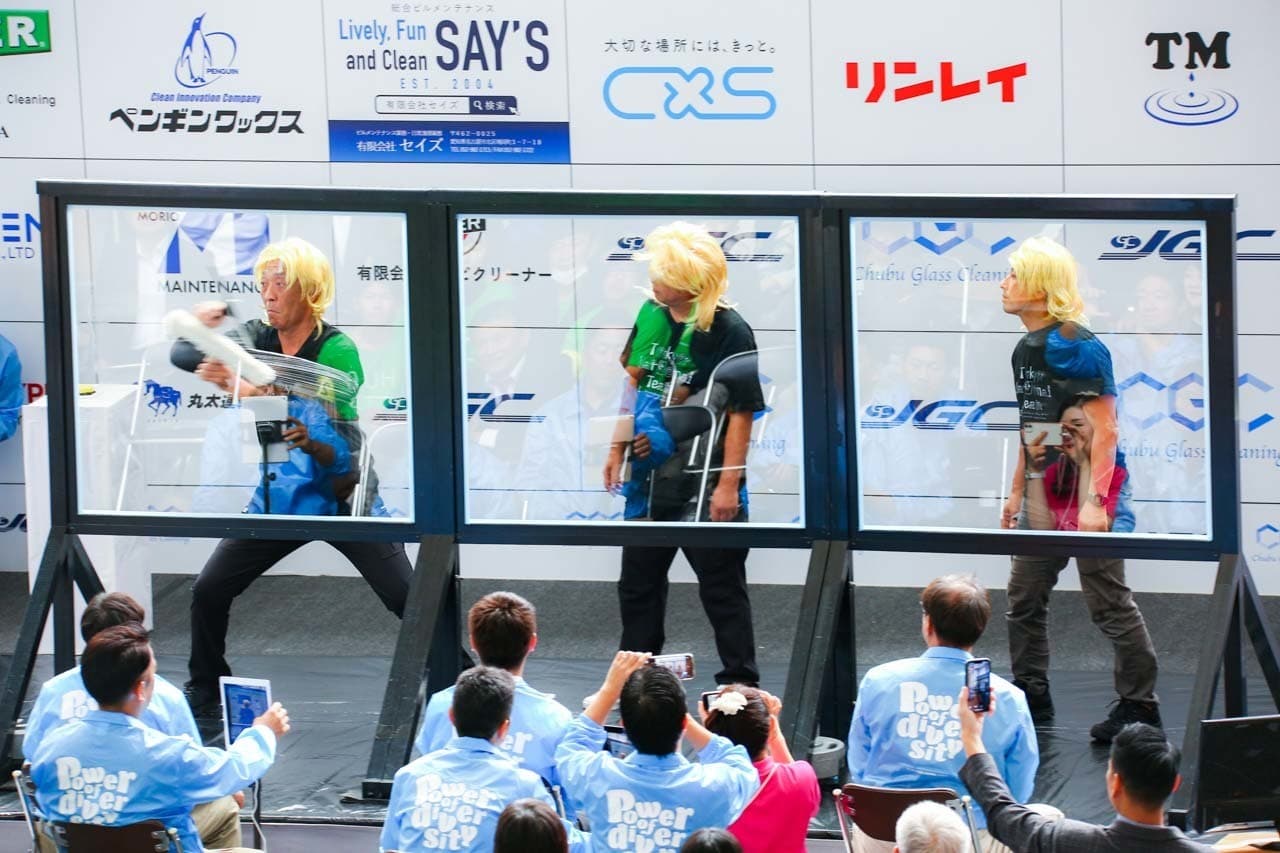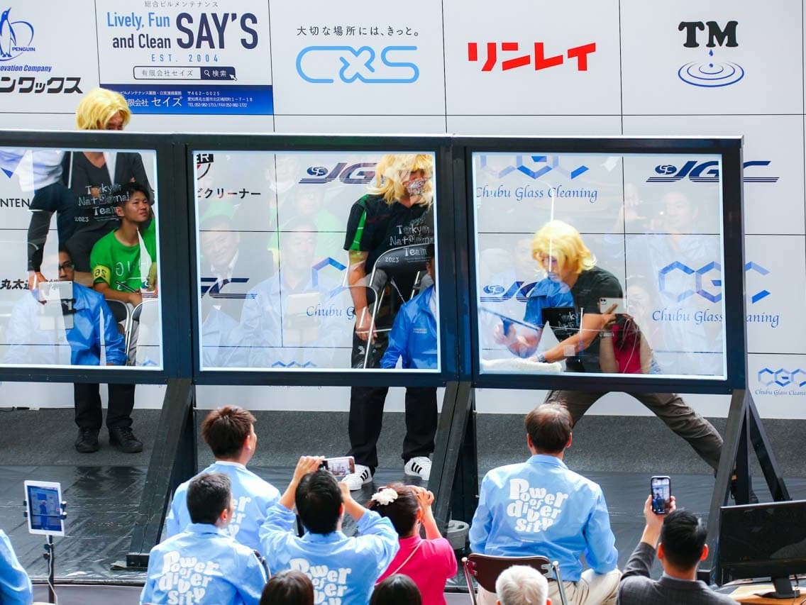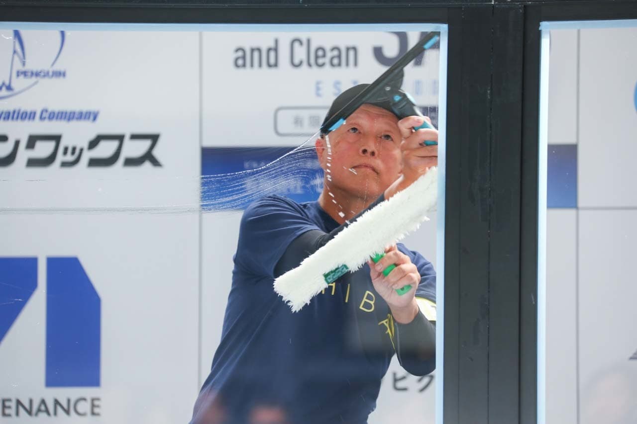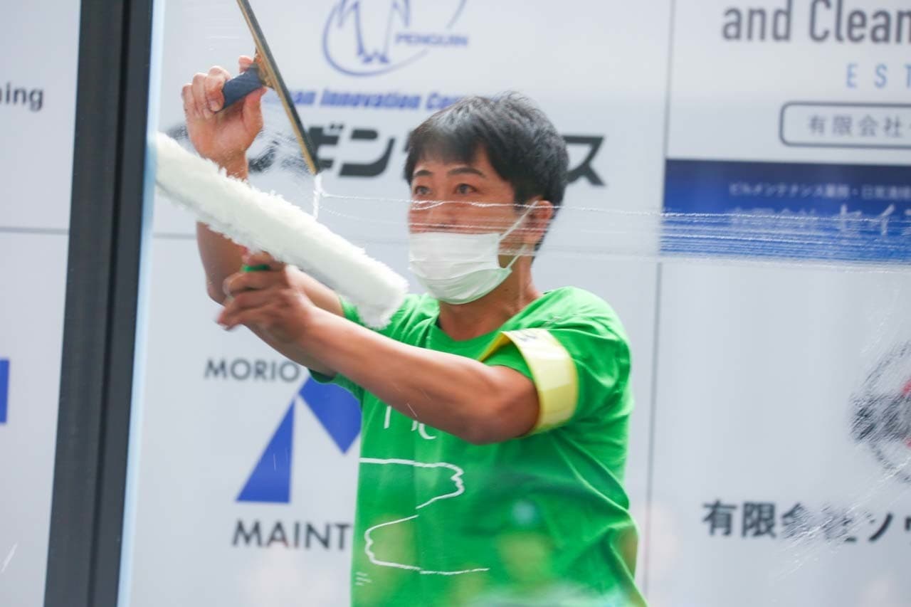 1040mm×1150mmの窓枠付き板ガラスを35cmのシャンプーと30cmのスクイージーを使用して、より早くよりきれいに拭き上げる技術を競います。