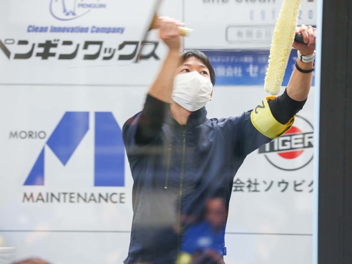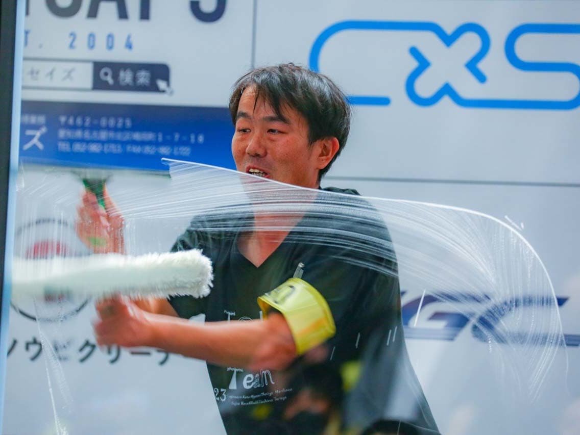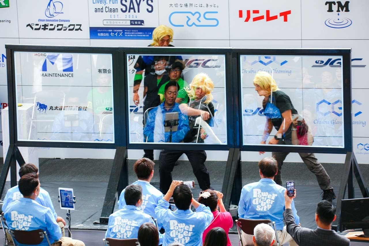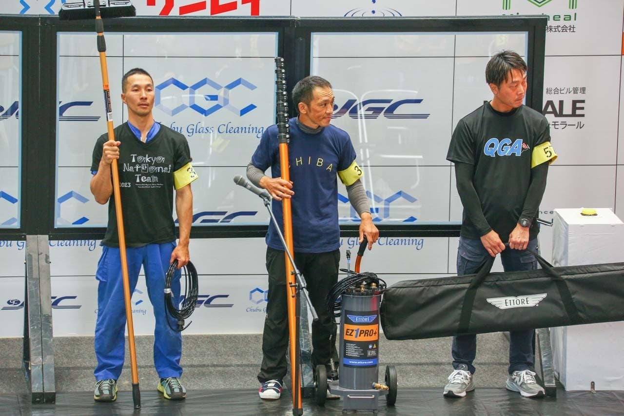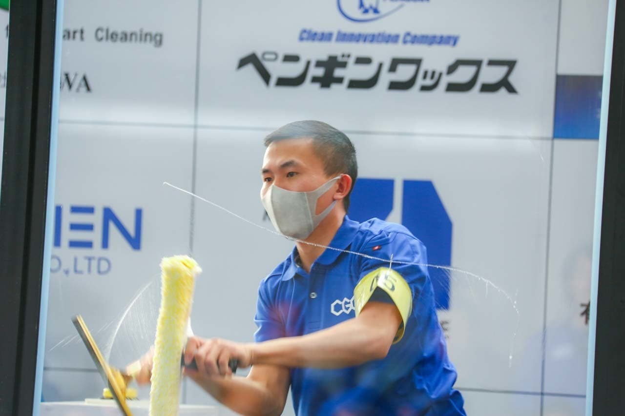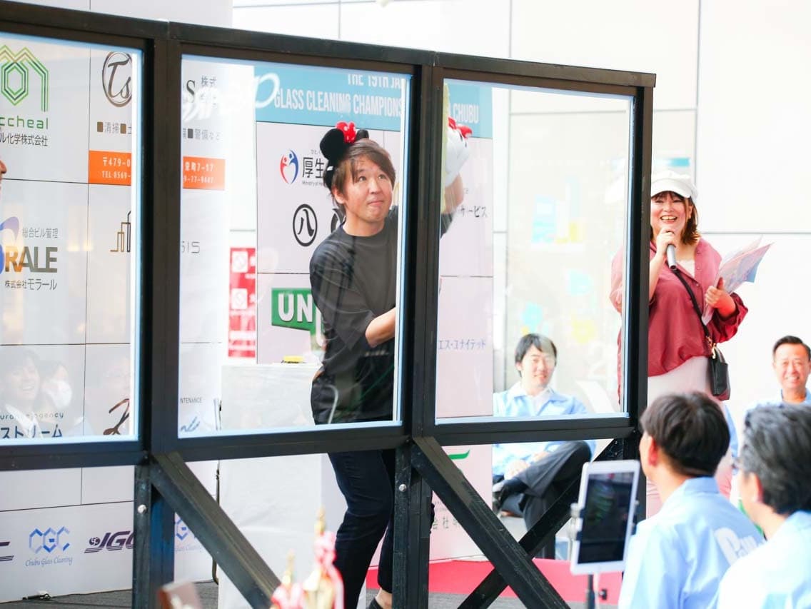 1040mm×1150mmの窓枠付き板ガラスを35cmのシャンプーと30cmのスクイージーを使用して、より早くよりきれいに拭き上げる技術を競います。