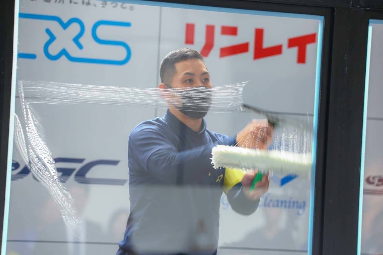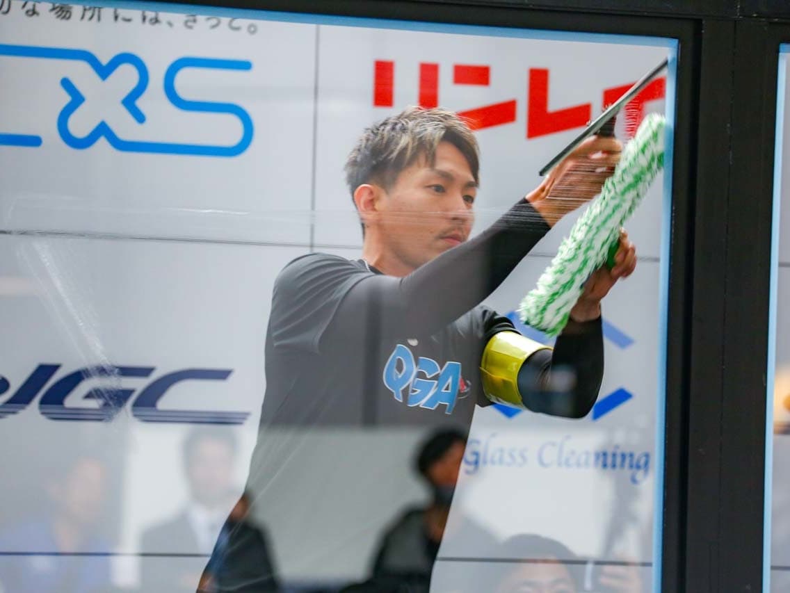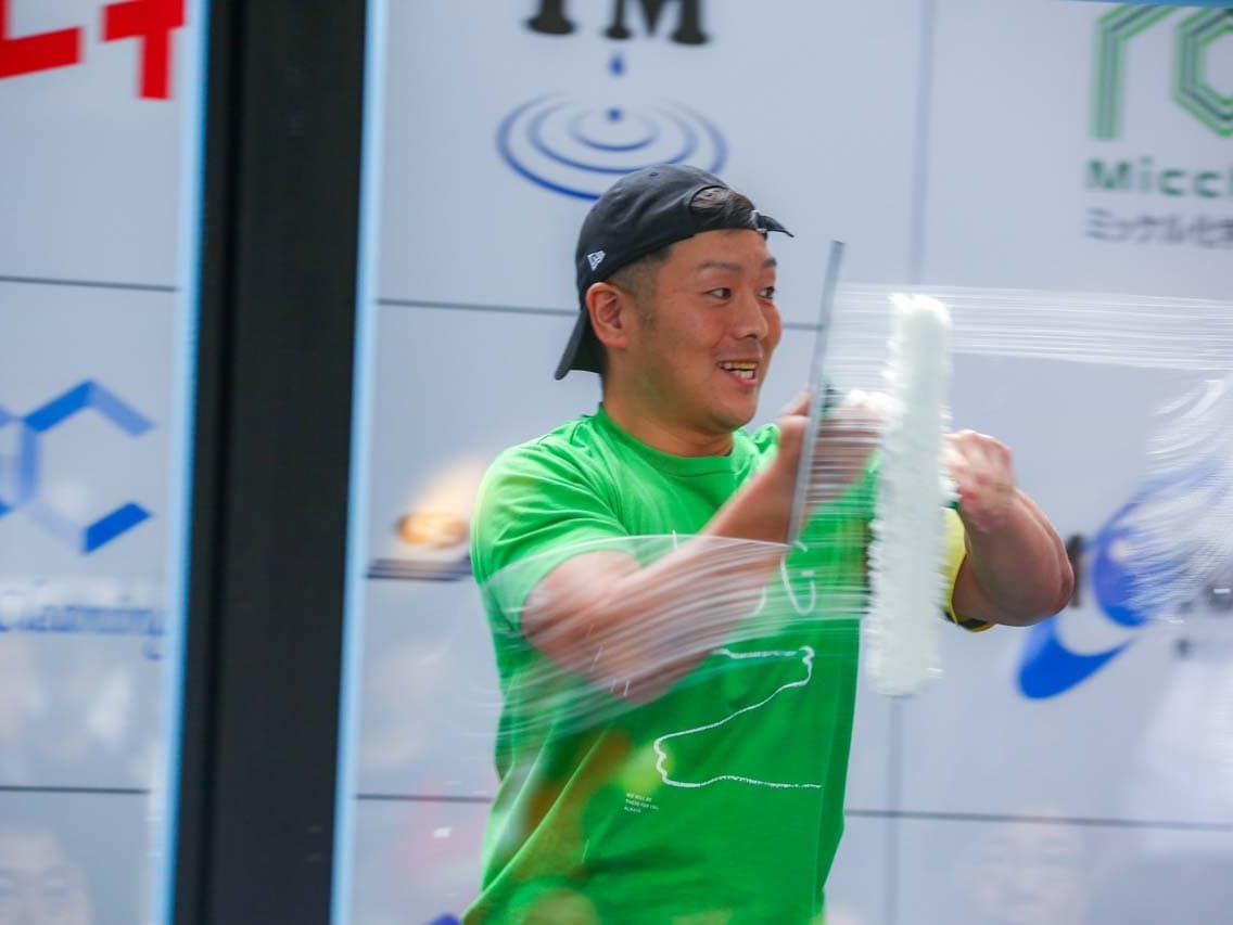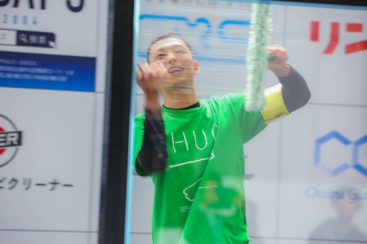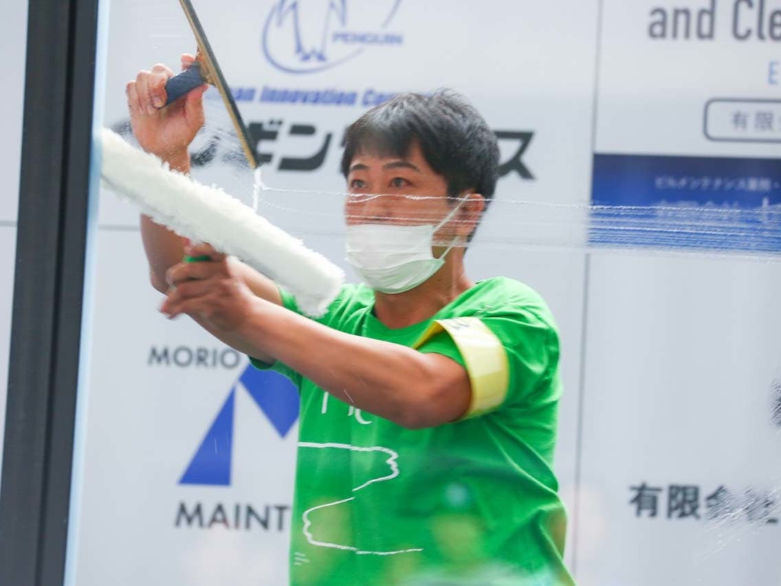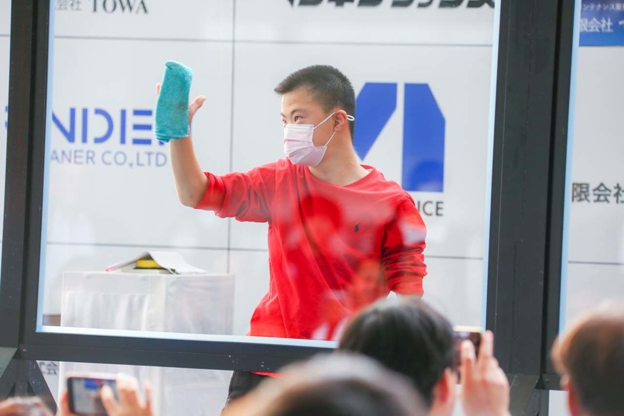 1040mm×1150mmの窓枠付き板ガラスを35cmのシャンプーと30cmのスクイージーを使用して、より早くよりきれいに拭き上げる技術を競います。