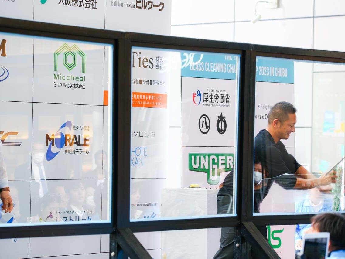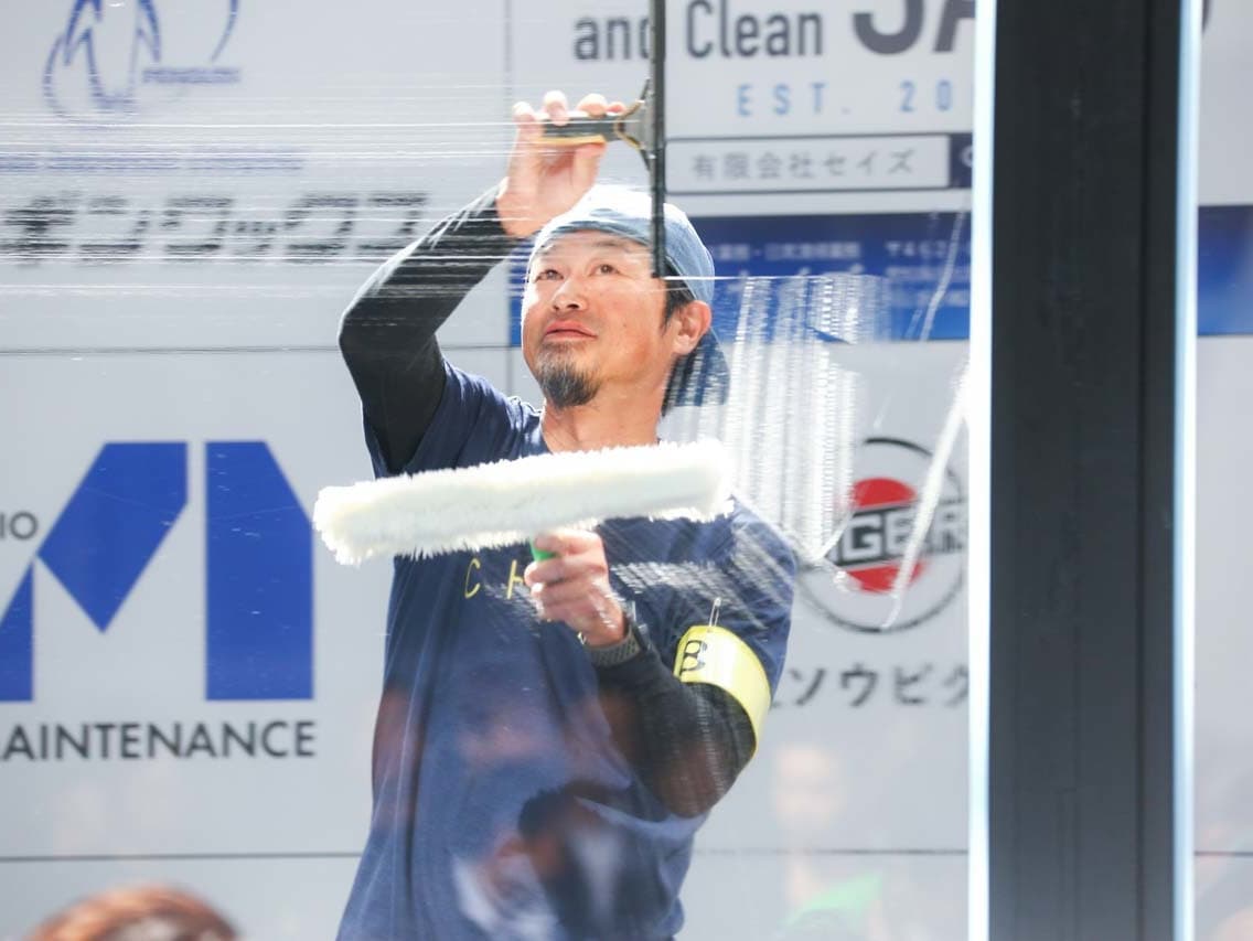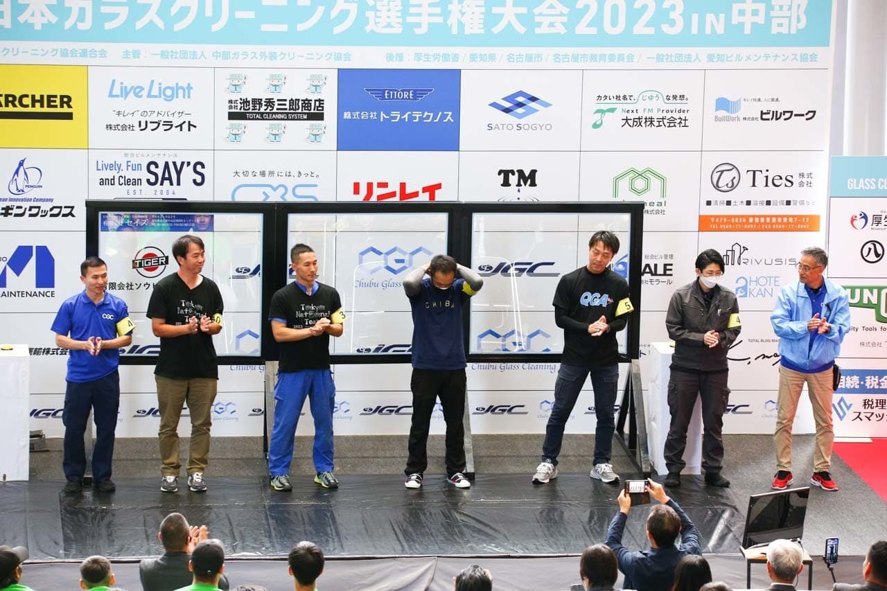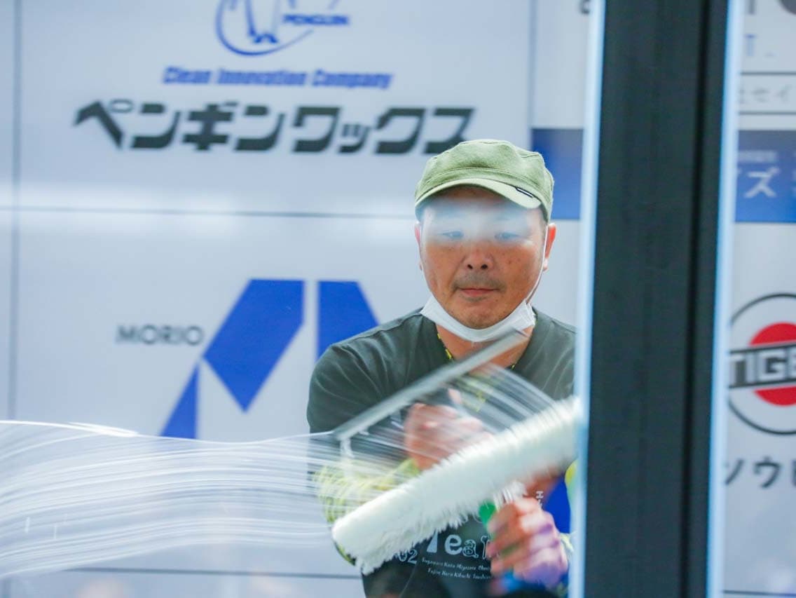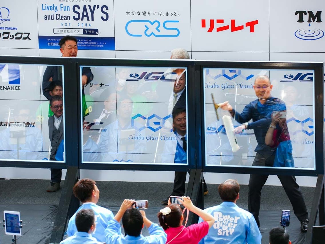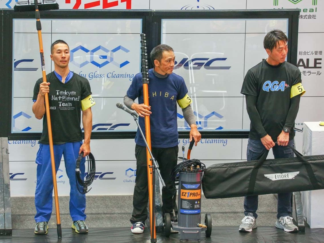 1040mm×1150mmの窓枠付き板ガラスを35cmのシャンプーと30cmのスクイージーを使用して、より早くよりきれいに拭き上げる技術を競います。