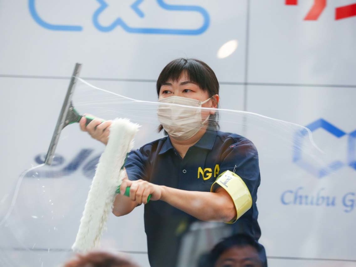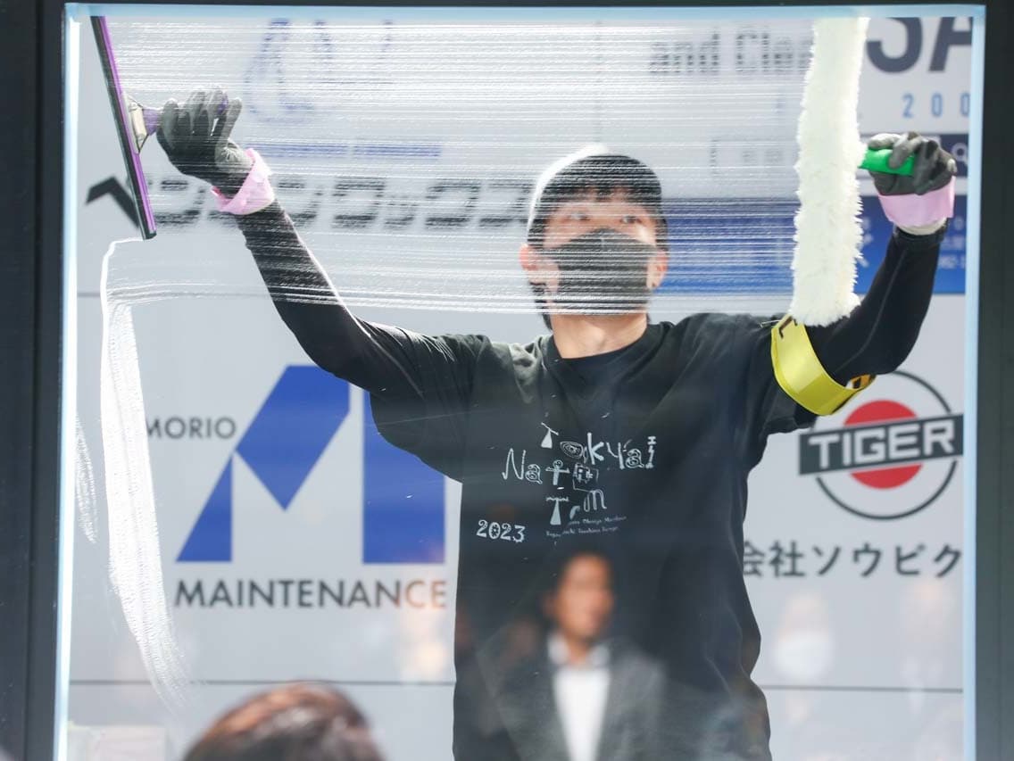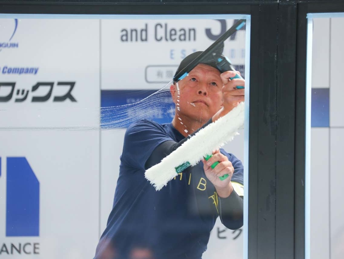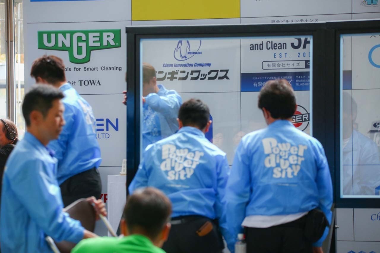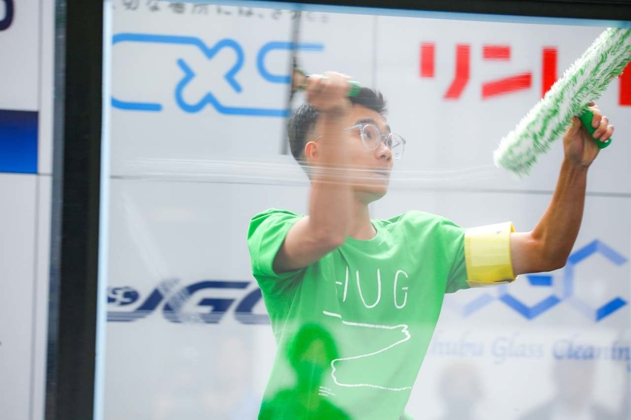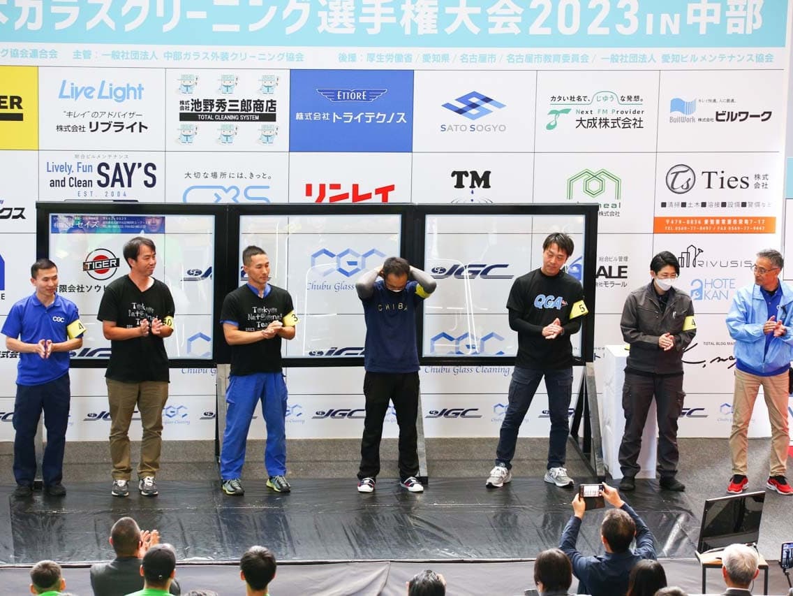 1040mm×1150mmの窓枠付き板ガラスを35cmのシャンプーと30cmのスクイージーを使用して、より早くよりきれいに拭き上げる技術を競います。