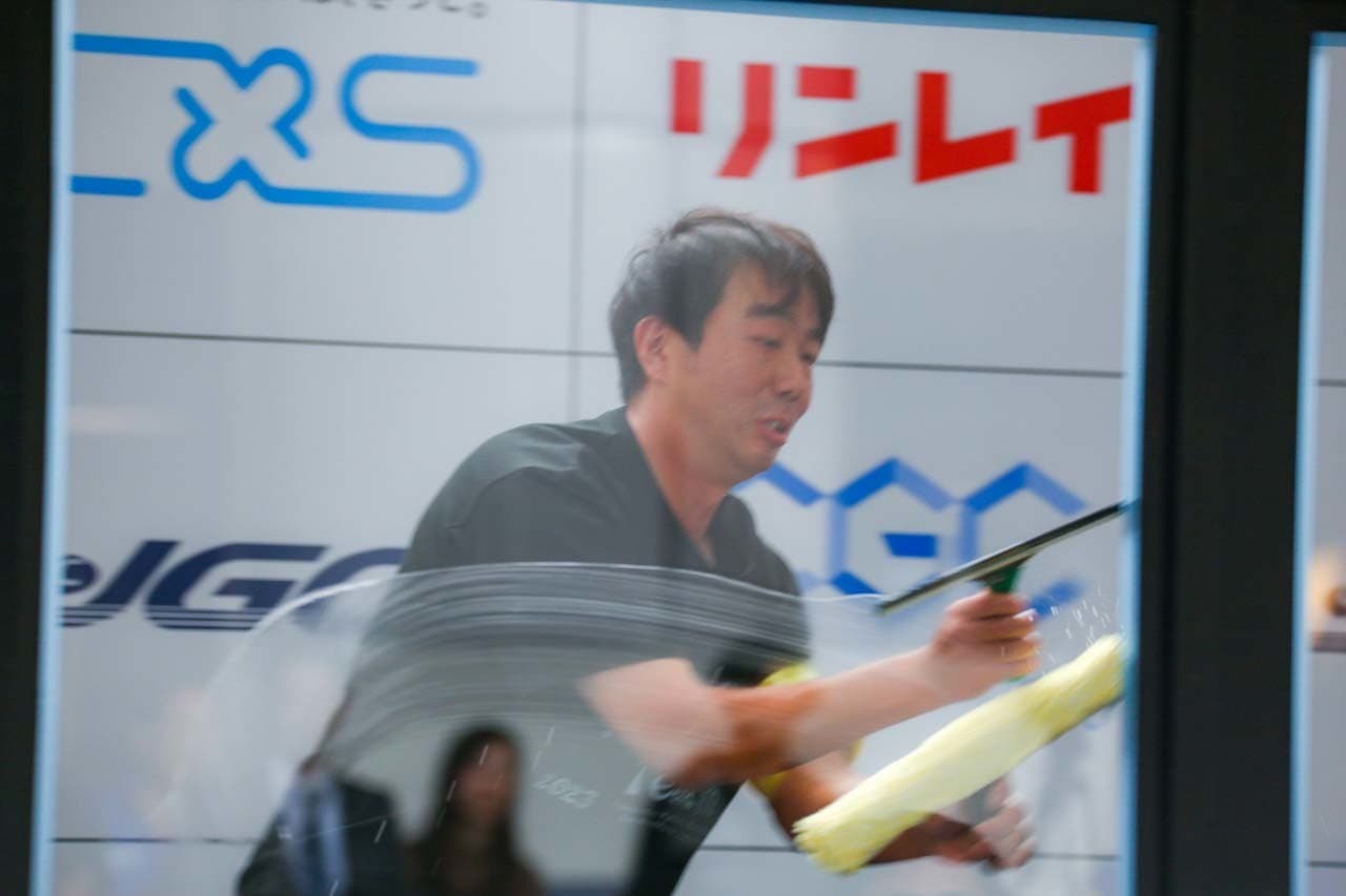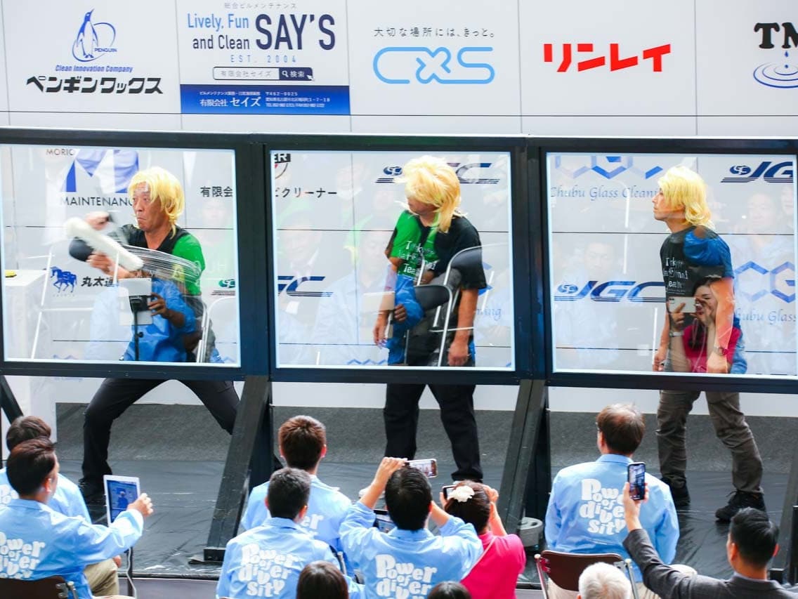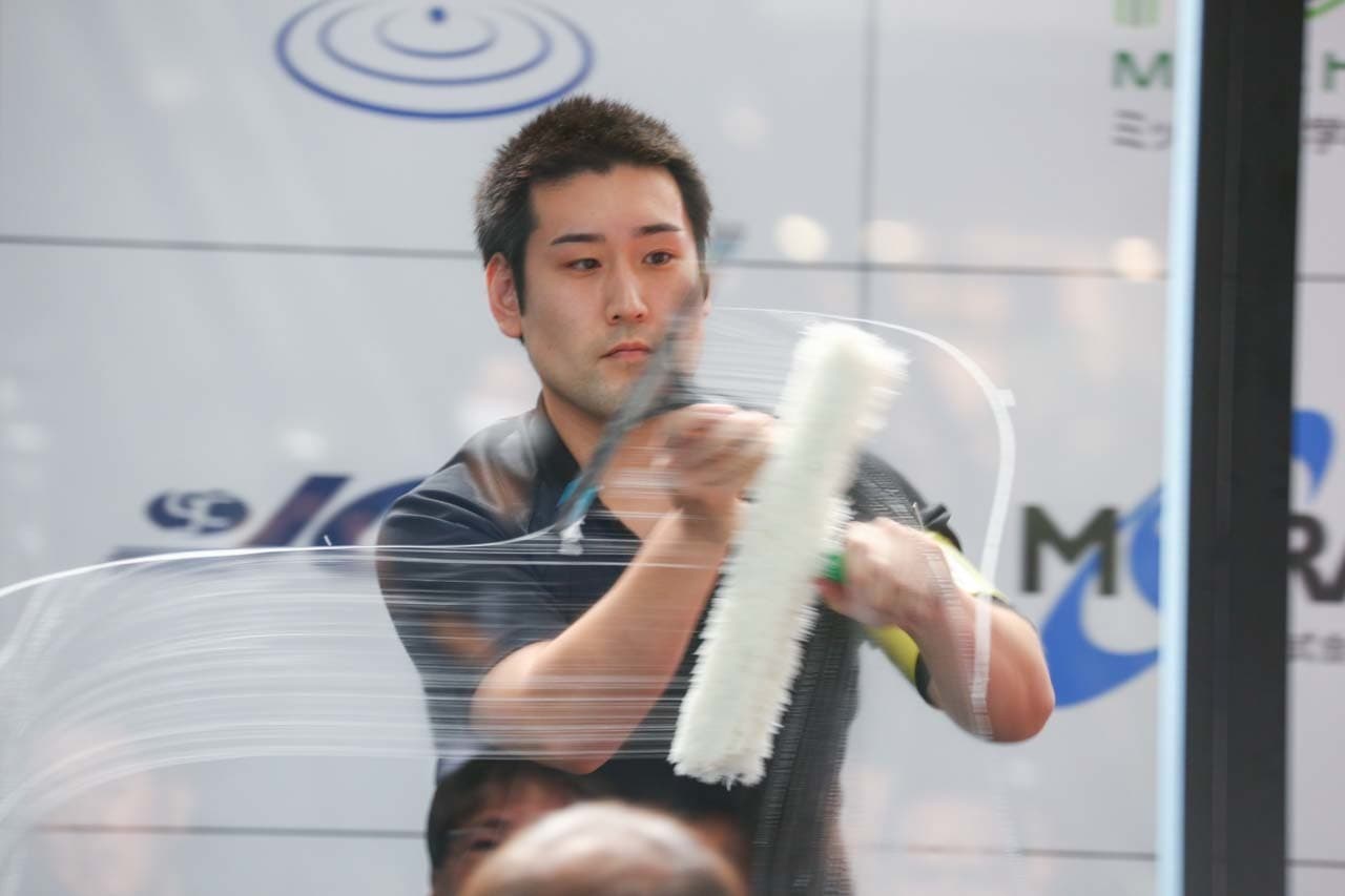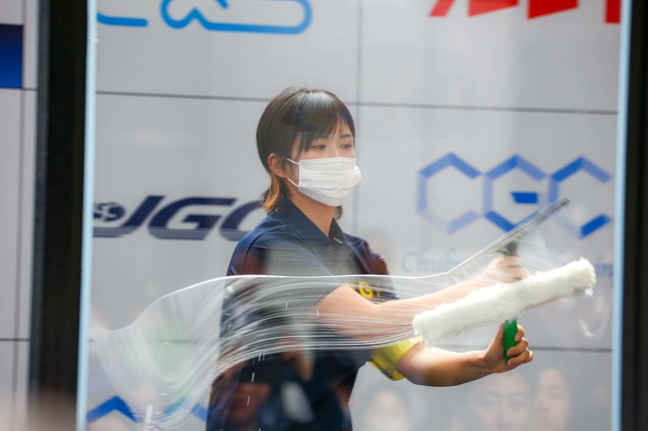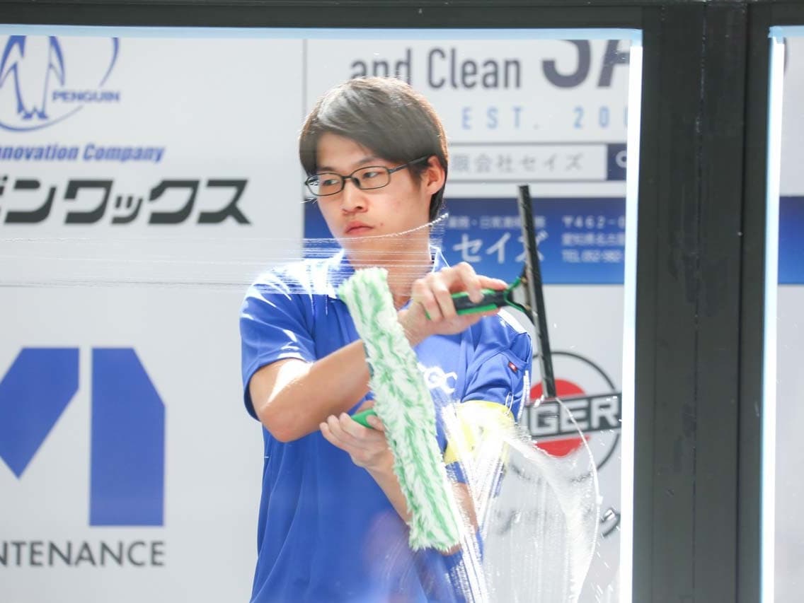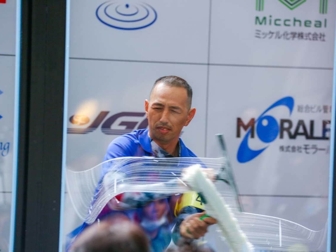 1040mm×1150mmの窓枠付き板ガラスを35cmのシャンプーと30cmのスクイージーを使用して、より早くよりきれいに拭き上げる技術を競います。