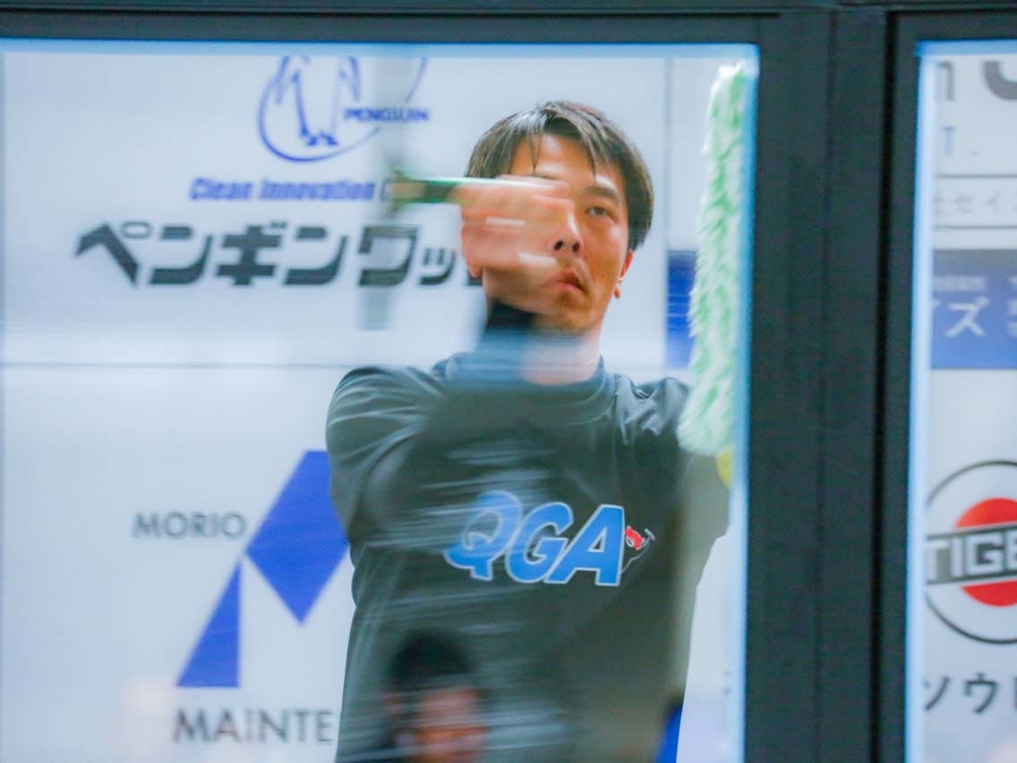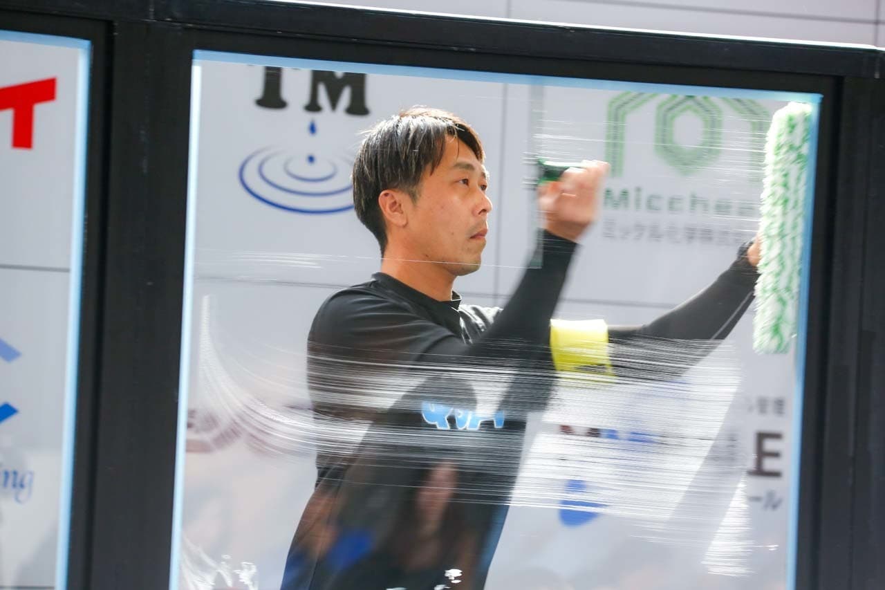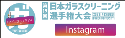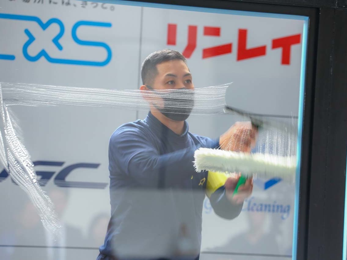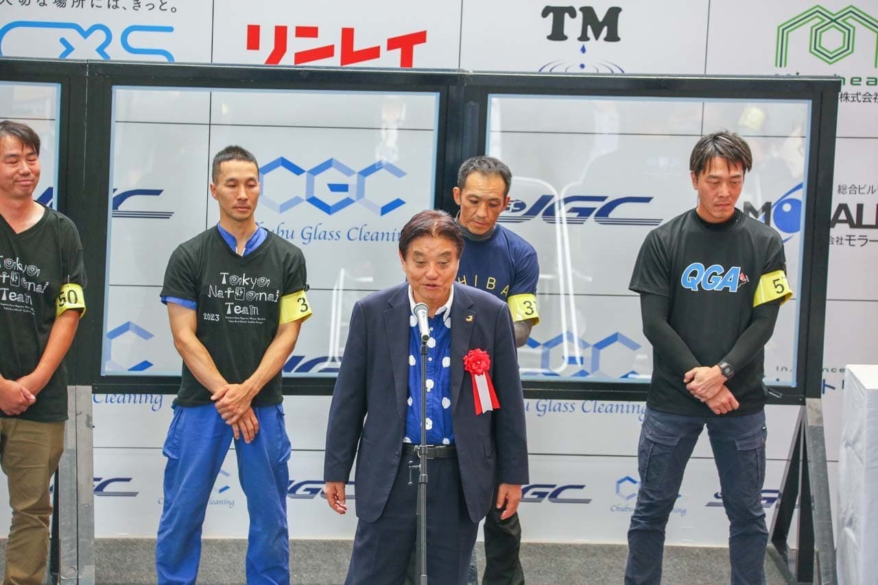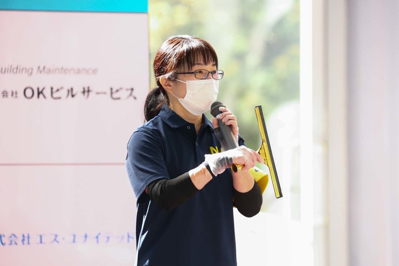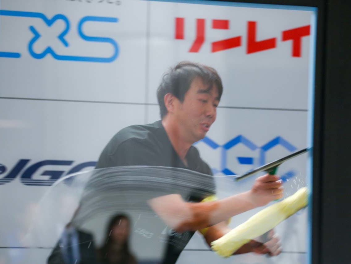 1040mm×1150mmの窓枠付き板ガラスを35cmのシャンプーと30cmのスクイージーを使用して、より早くよりきれいに拭き上げる技術を競います。