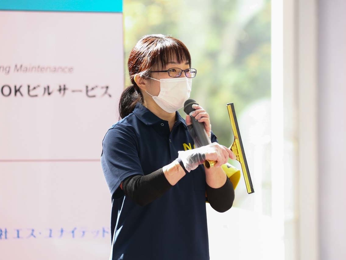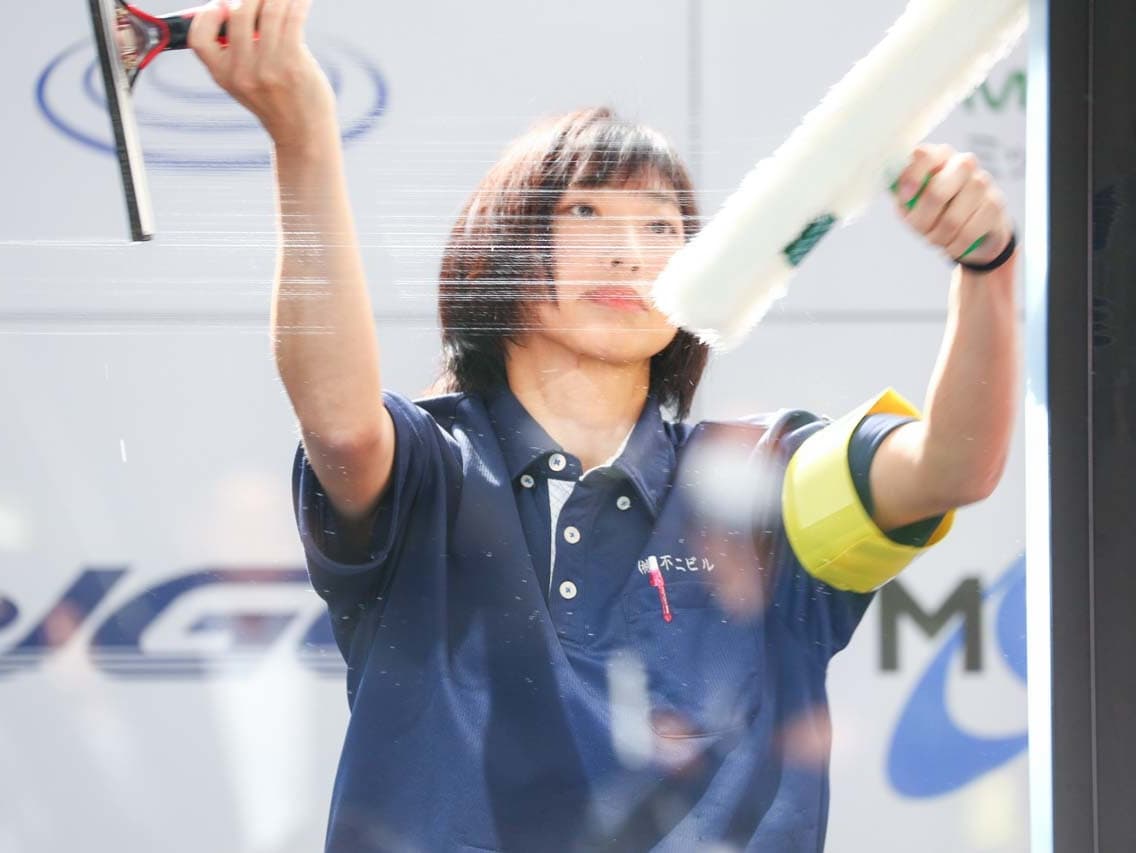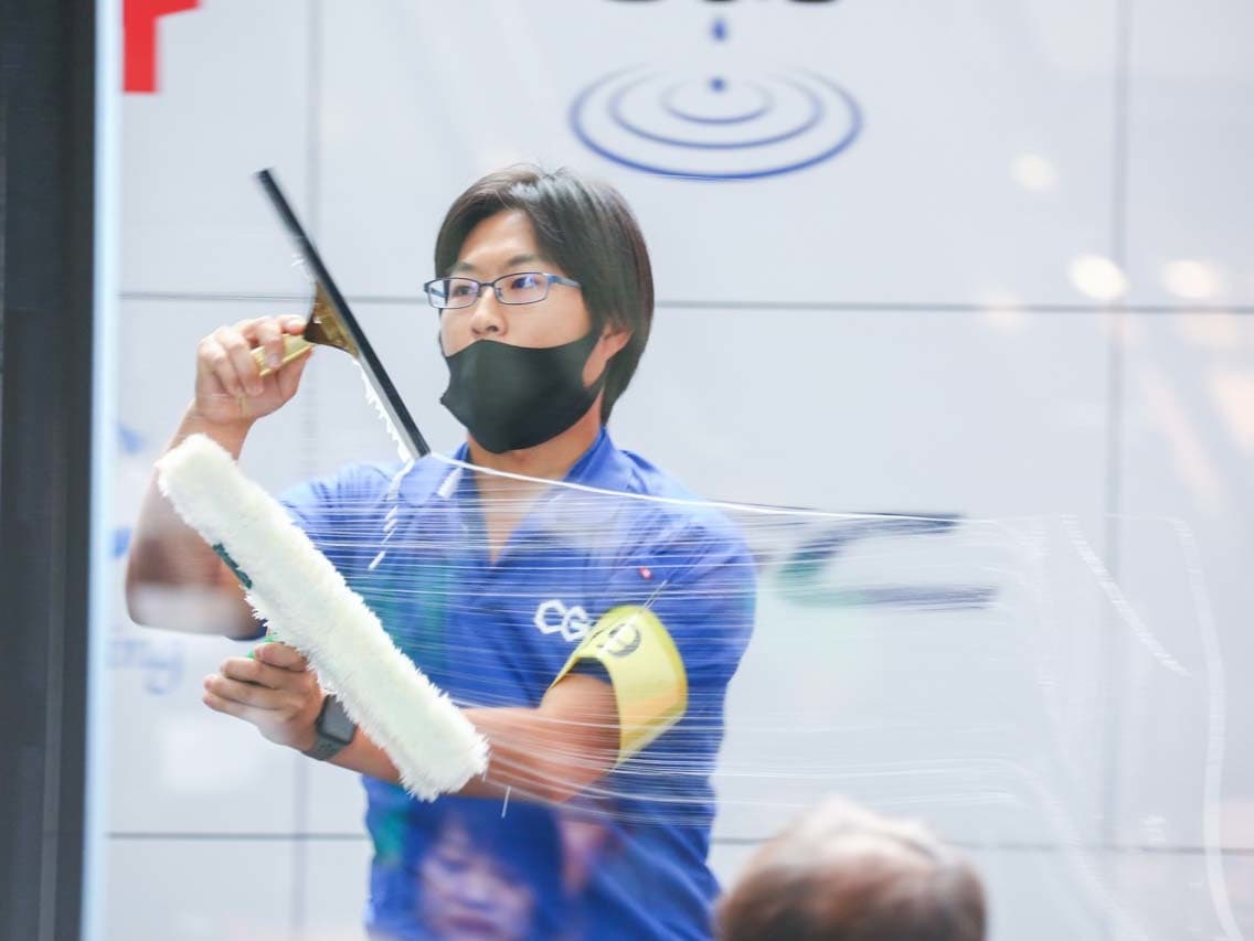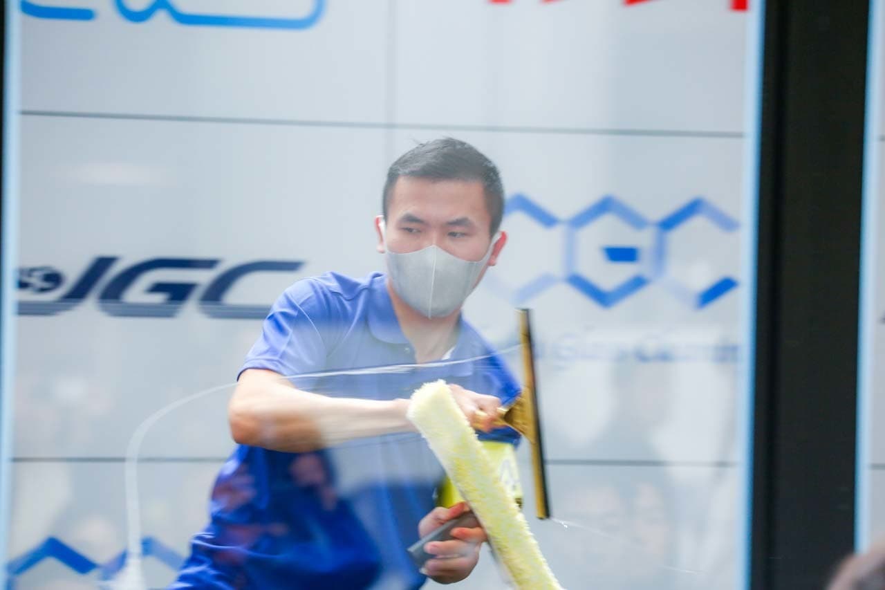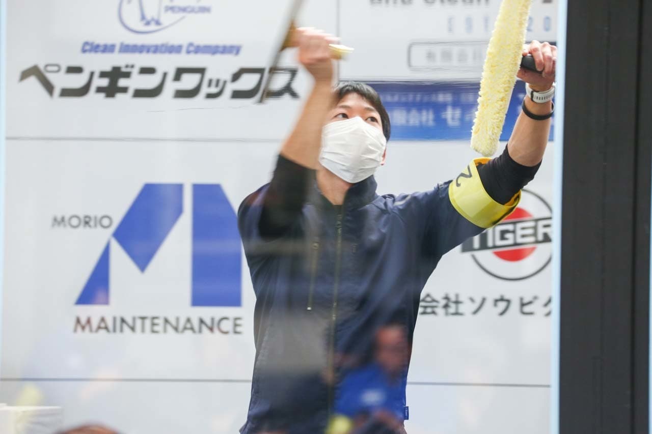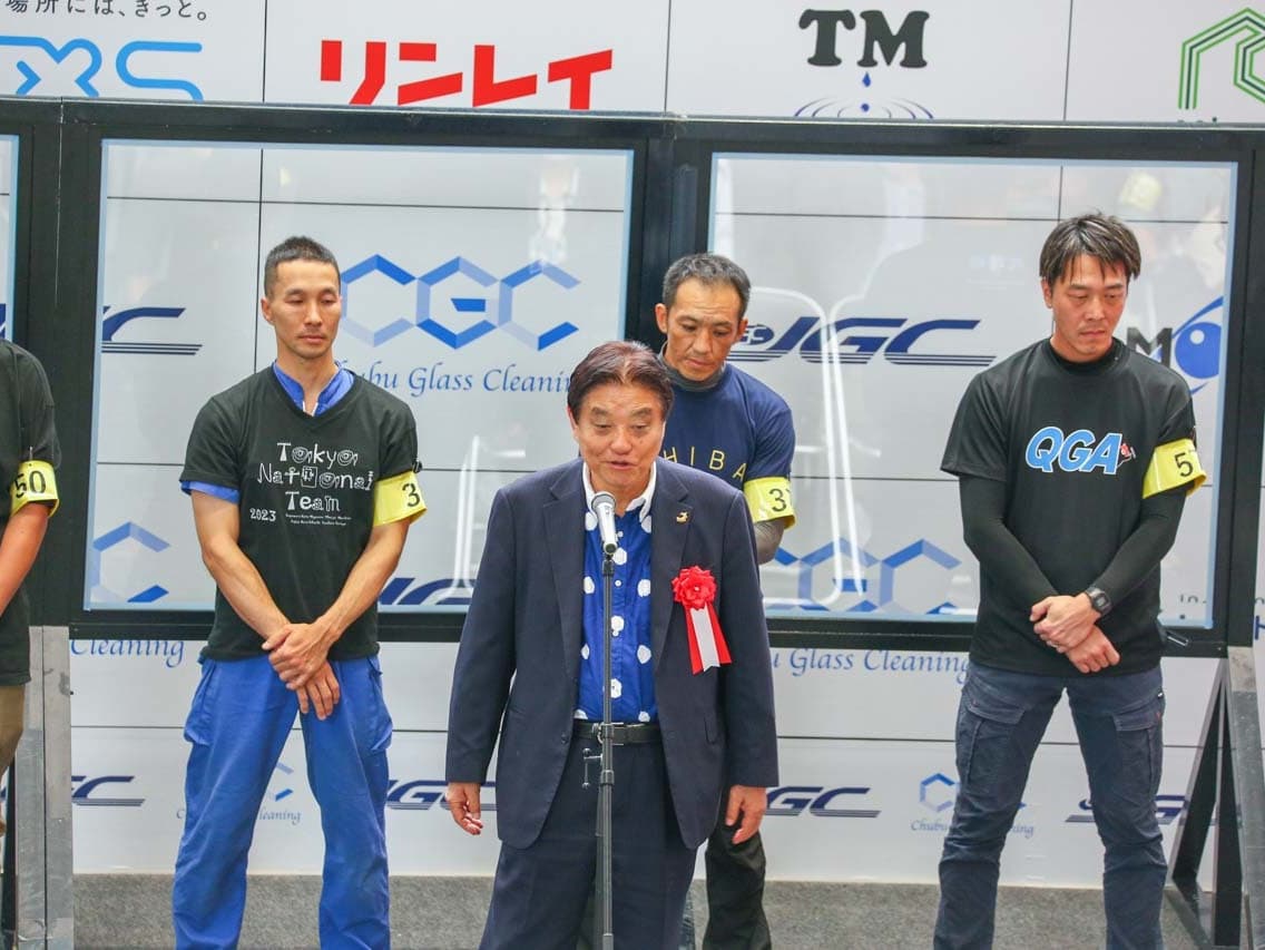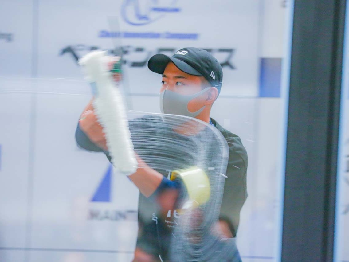1040mm×1150mmの窓枠付き板ガラスを35cmのシャンプーと30cmのスクイージーを使用して、より早くよりきれいに拭き上げる技術を競います。