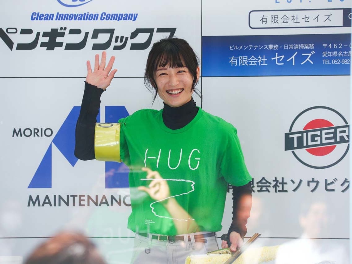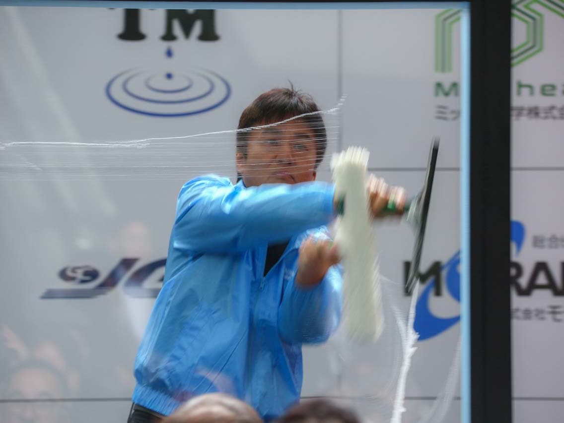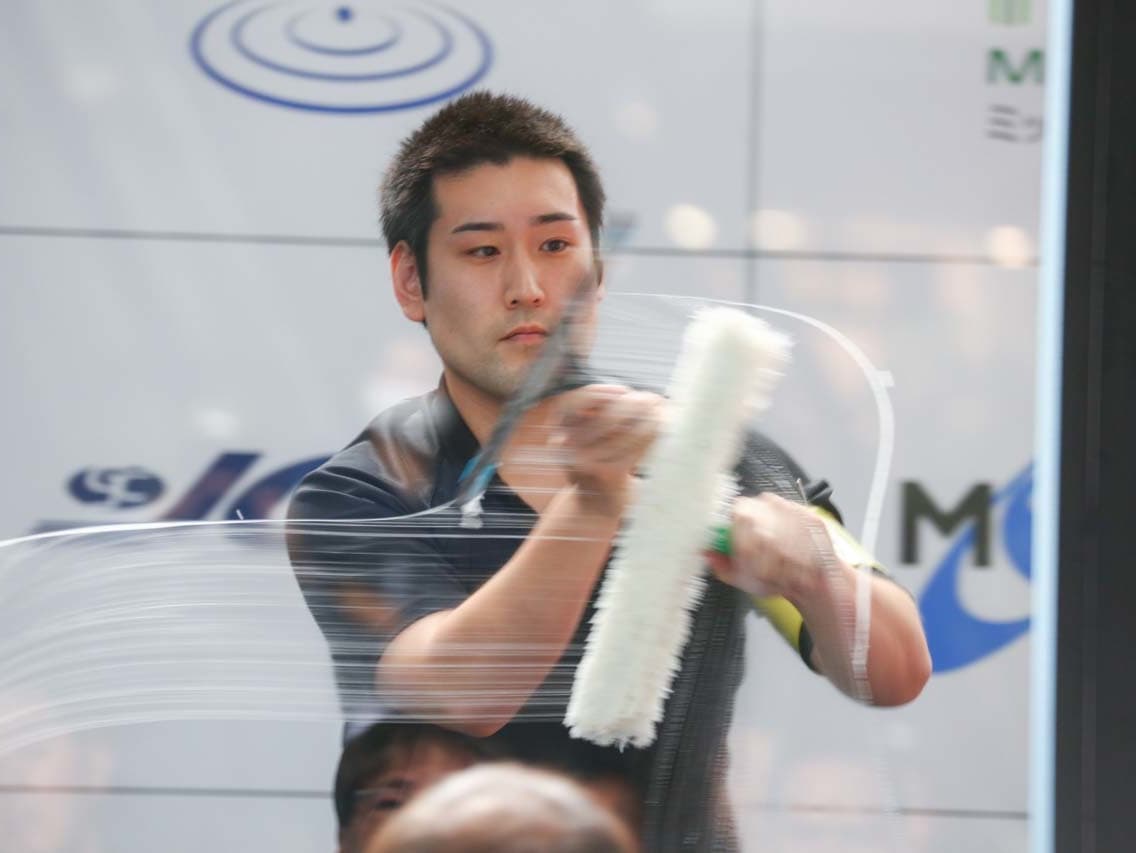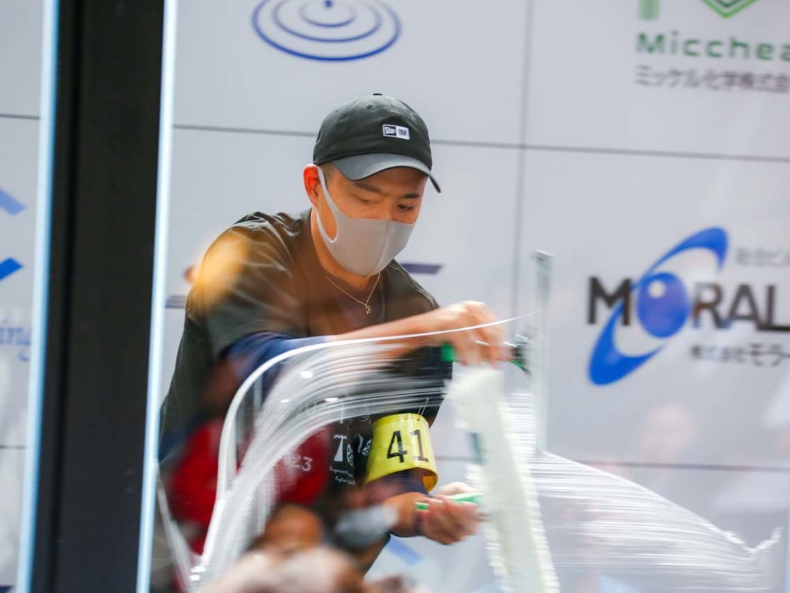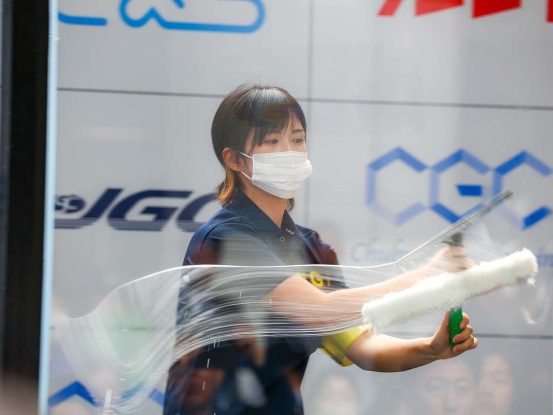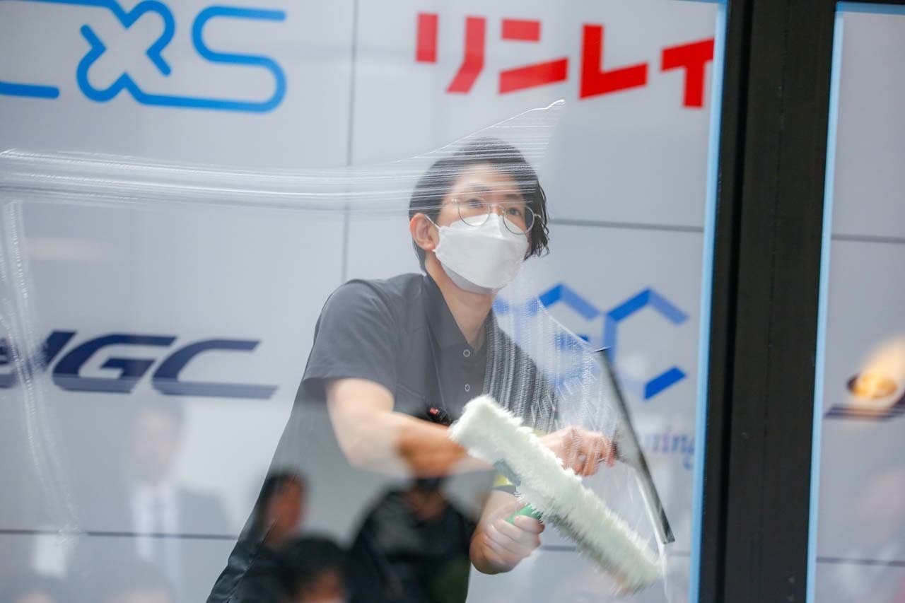 1040mm×1150mmの窓枠付き板ガラスを35cmのシャンプーと30cmのスクイージーを使用して、より早くよりきれいに拭き上げる技術を競います。