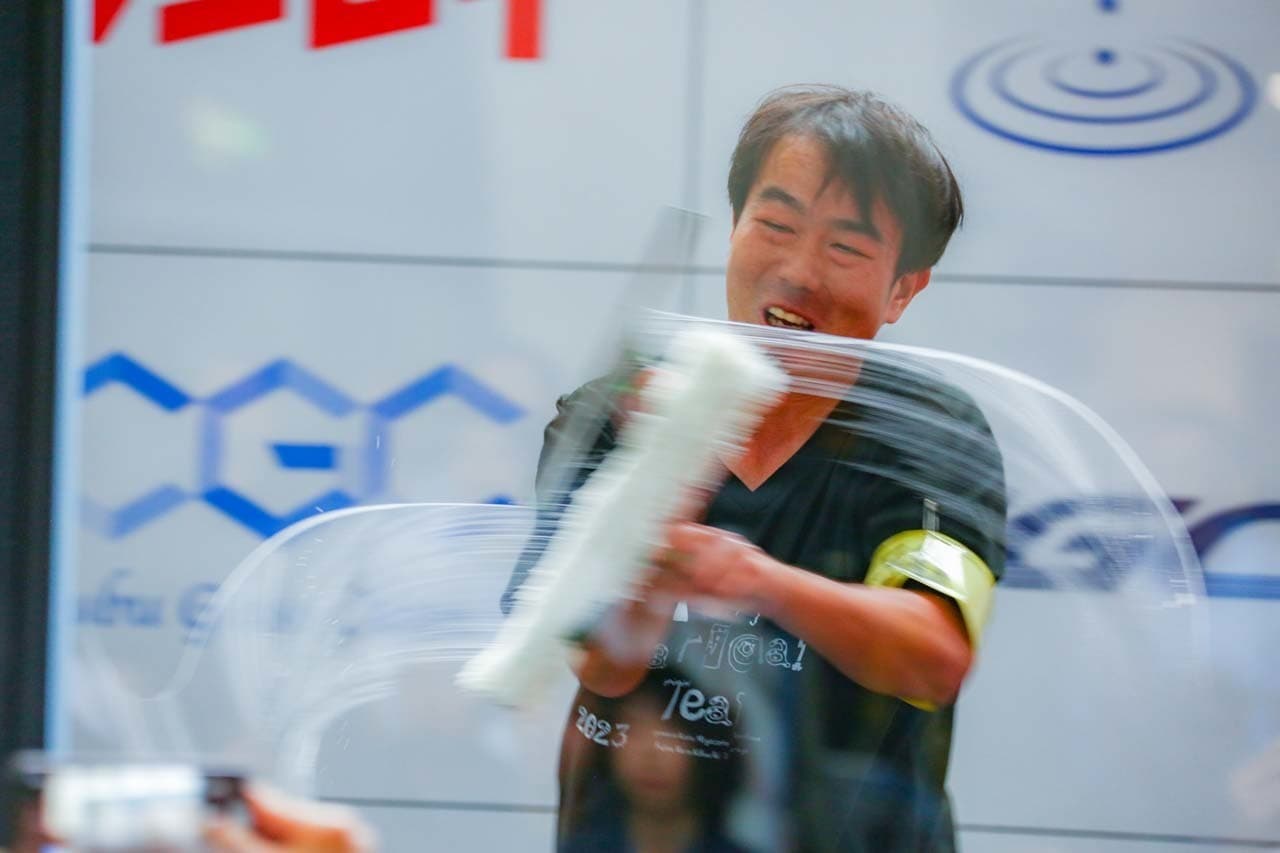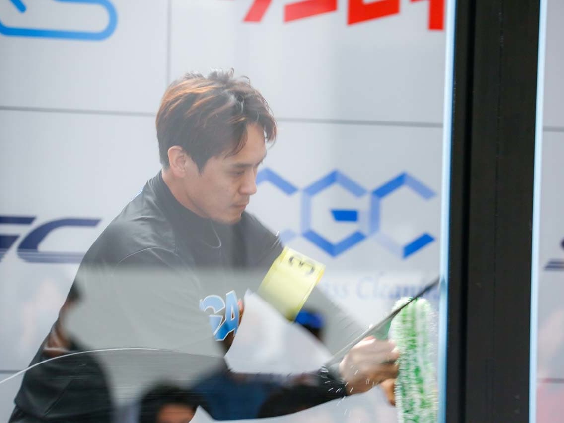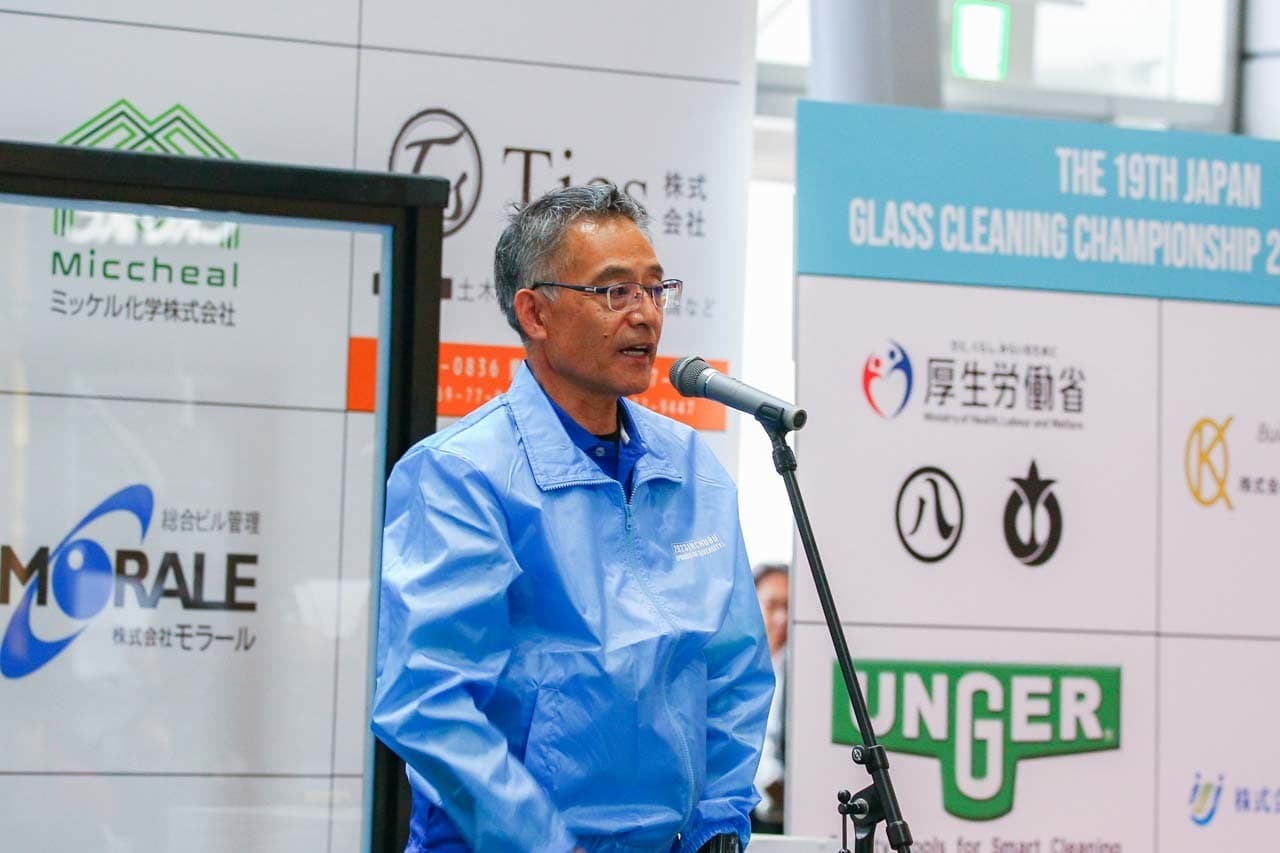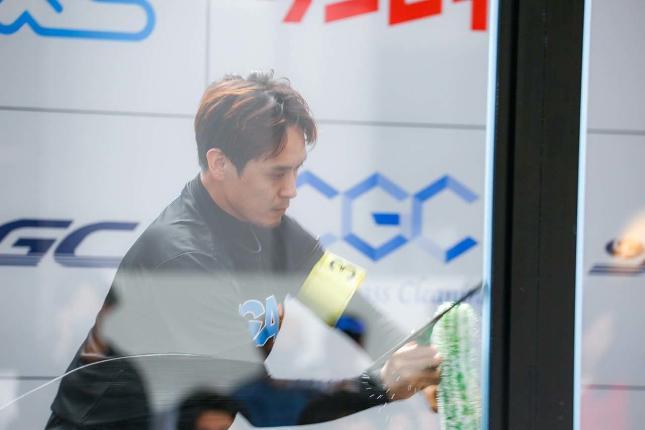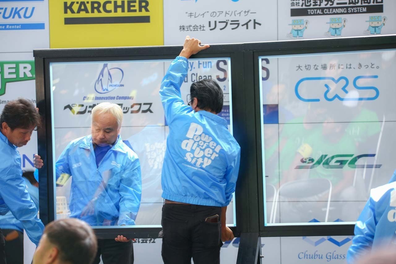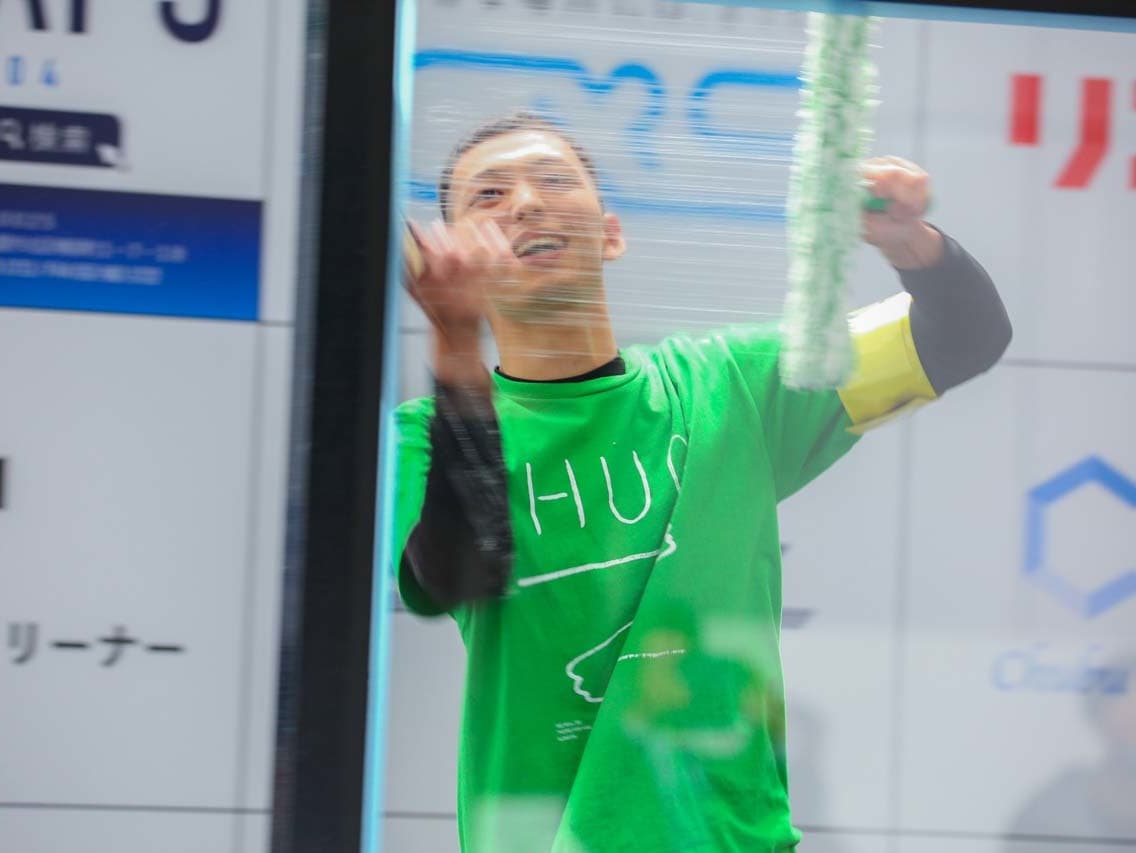 1040mm×1150mmの窓枠付き板ガラスを35cmのシャンプーと30cmのスクイージーを使用して、より早くよりきれいに拭き上げる技術を競います。
