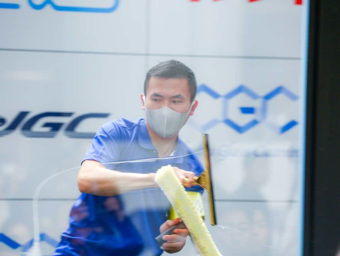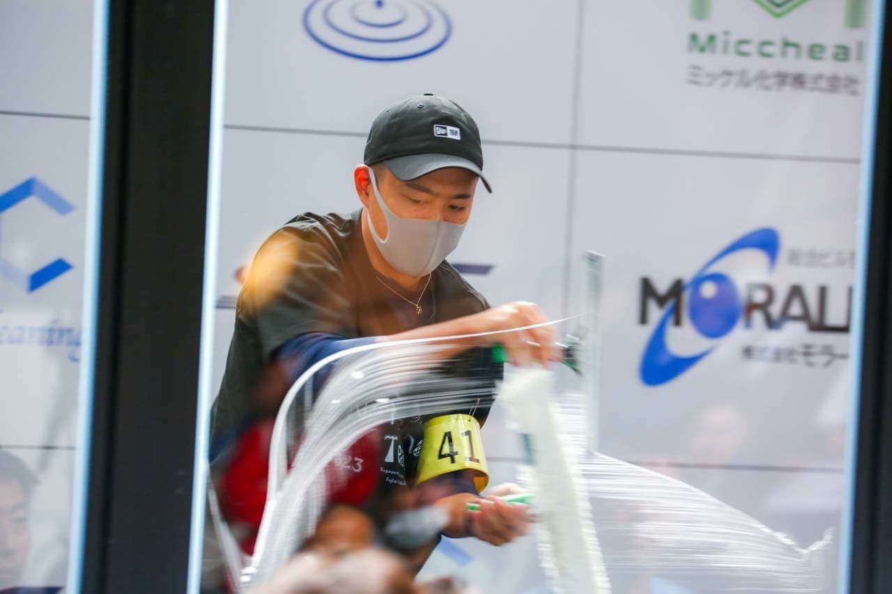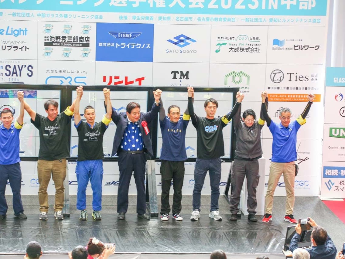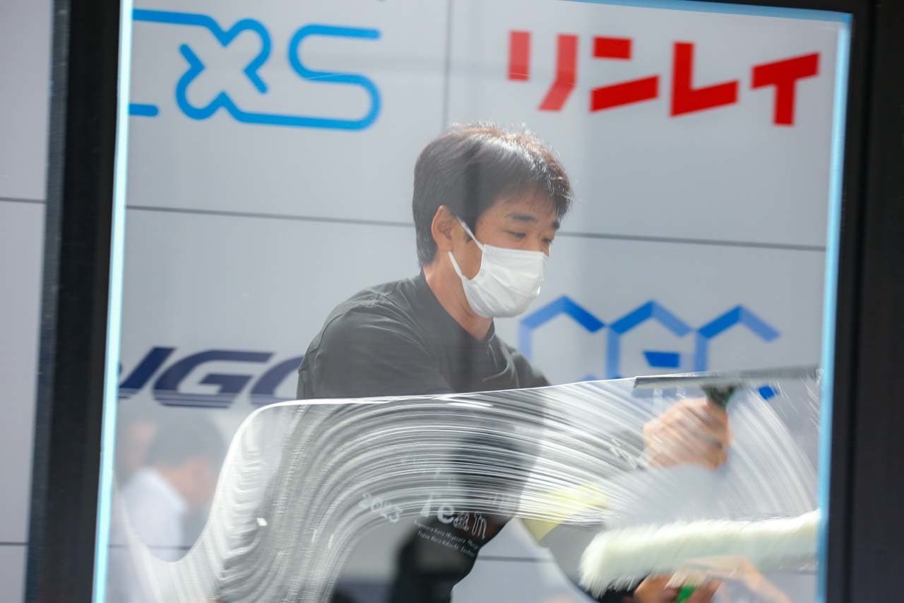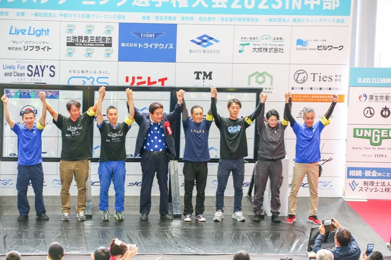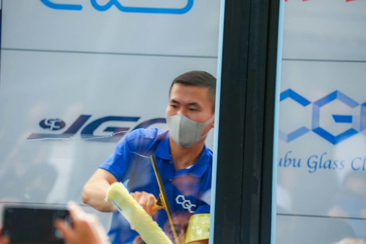 1040mm×1150mmの窓枠付き板ガラスを35cmのシャンプーと30cmのスクイージーを使用して、より早くよりきれいに拭き上げる技術を競います。
