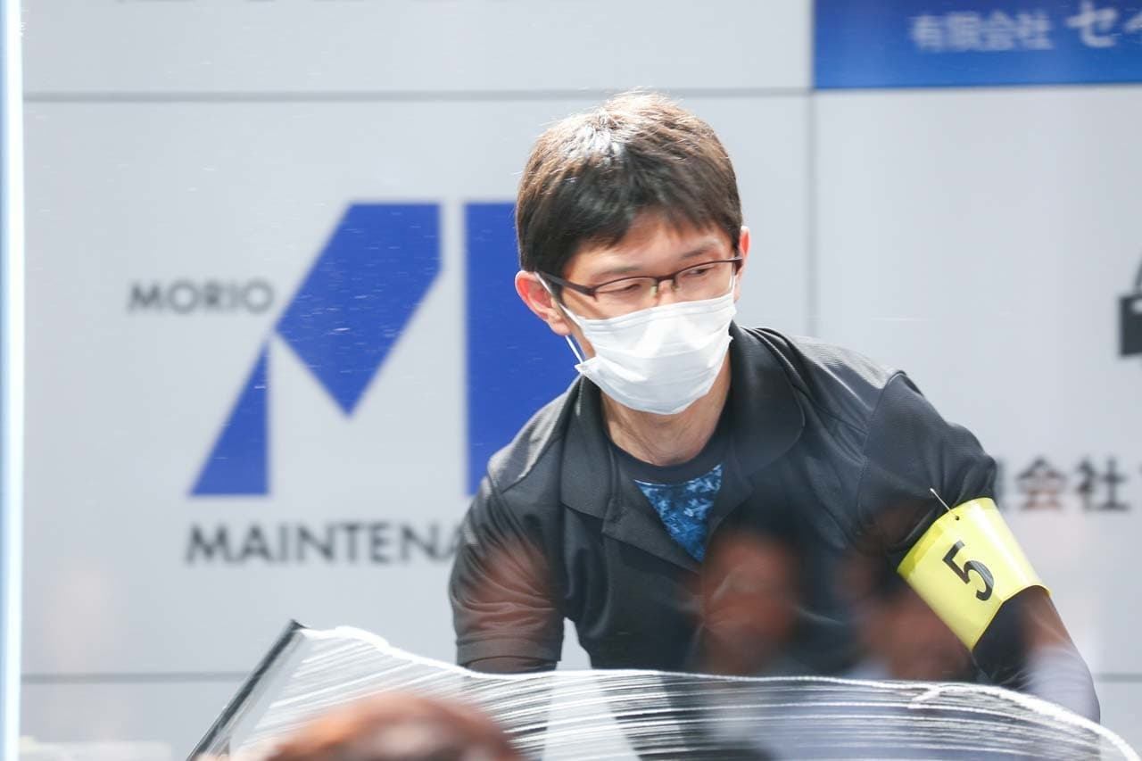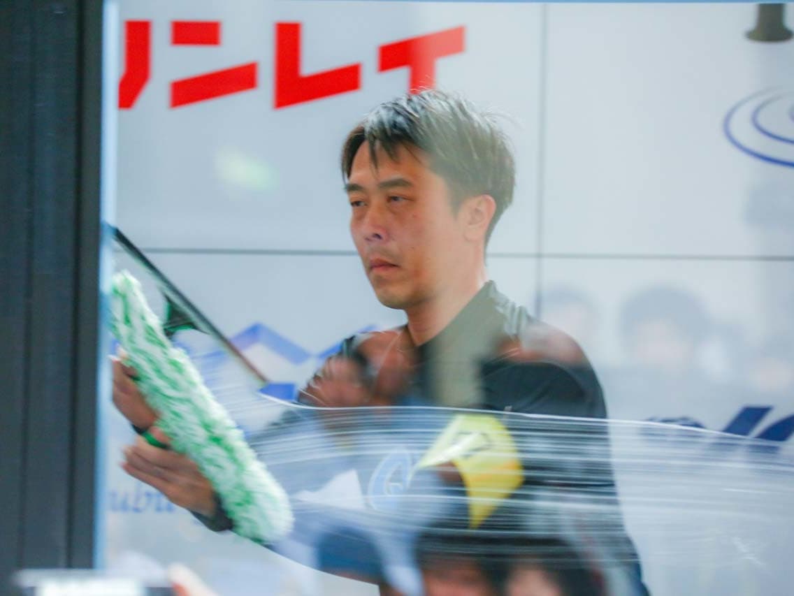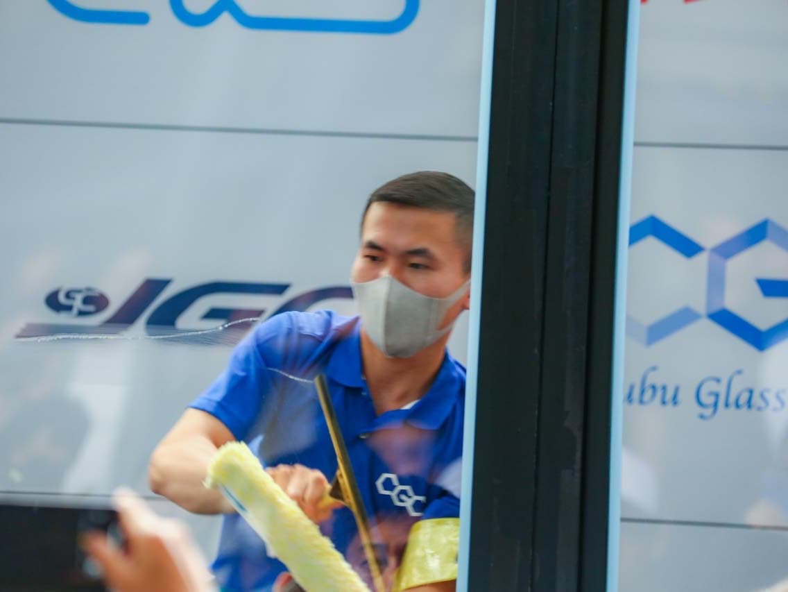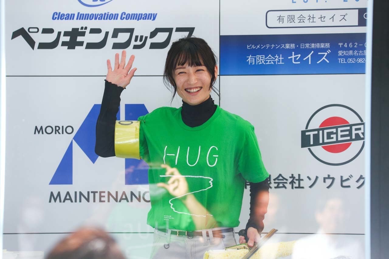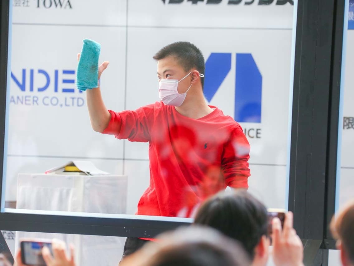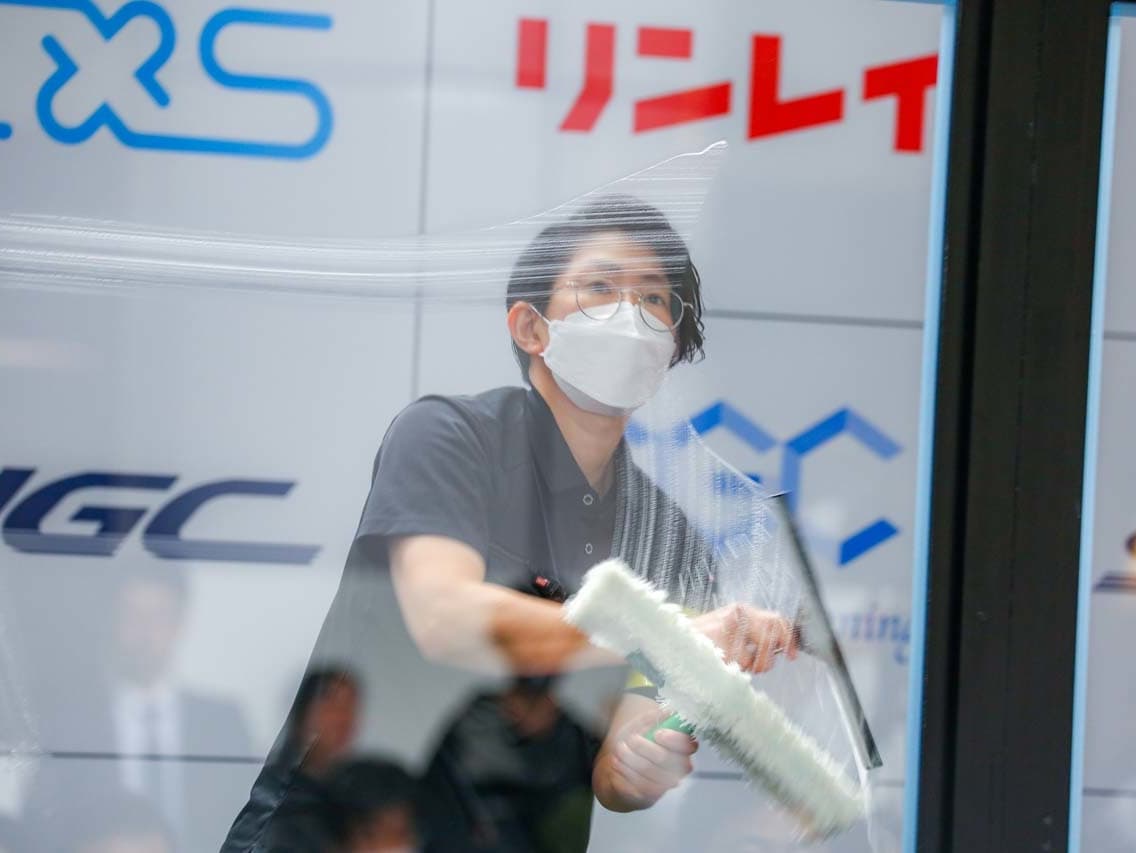 1040mm×1150mmの窓枠付き板ガラスを35cmのシャンプーと30cmのスクイージーを使用して、より早くよりきれいに拭き上げる技術を競います。