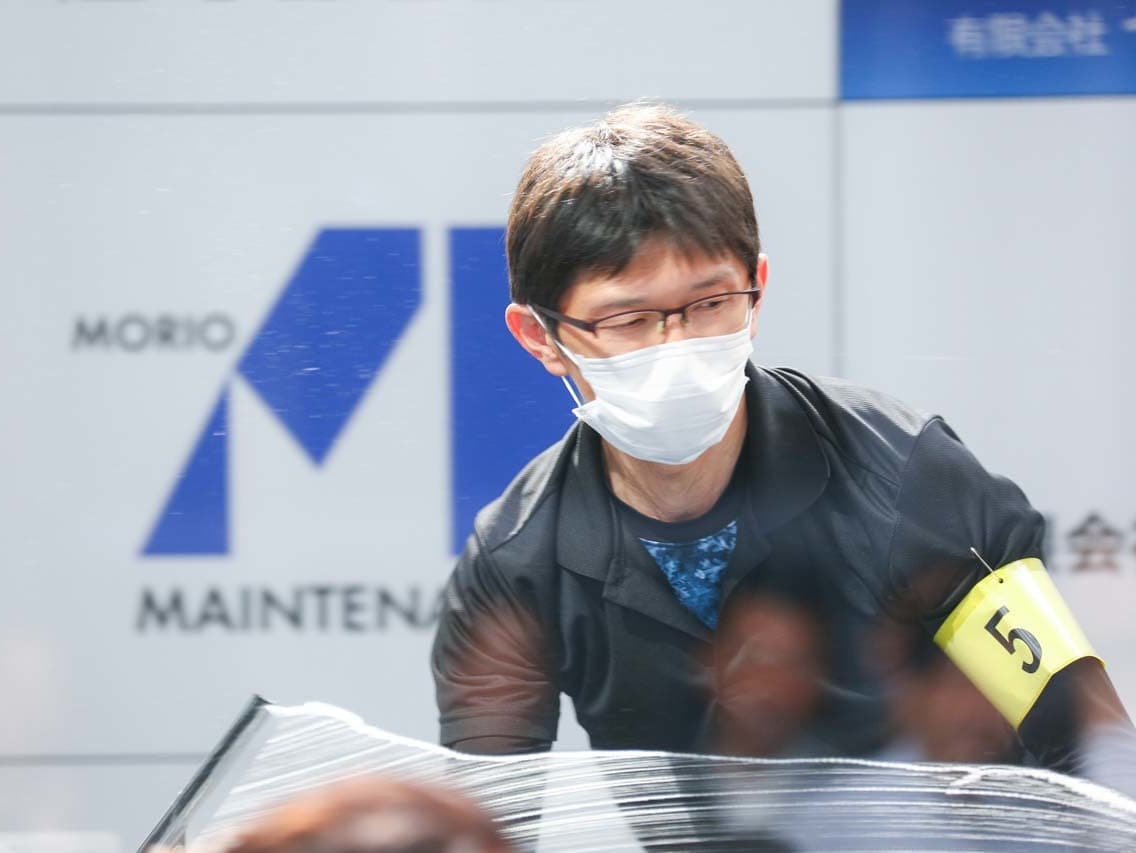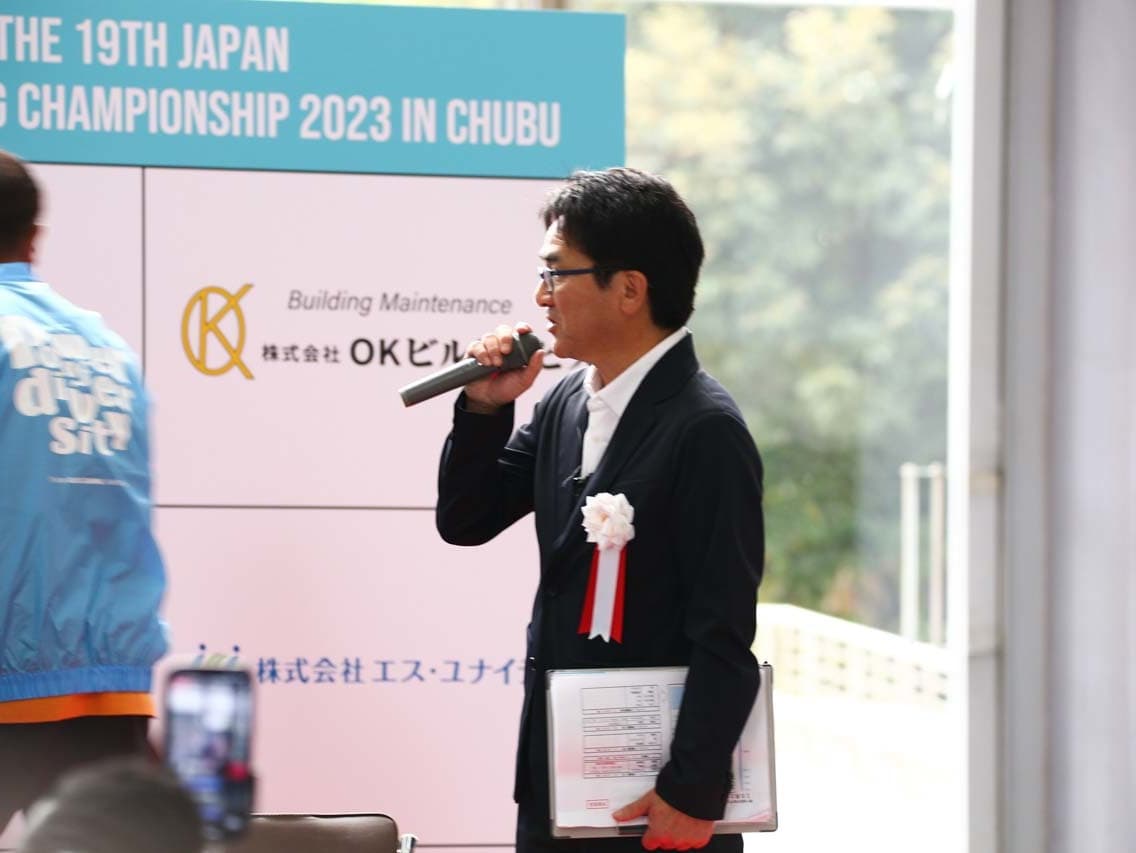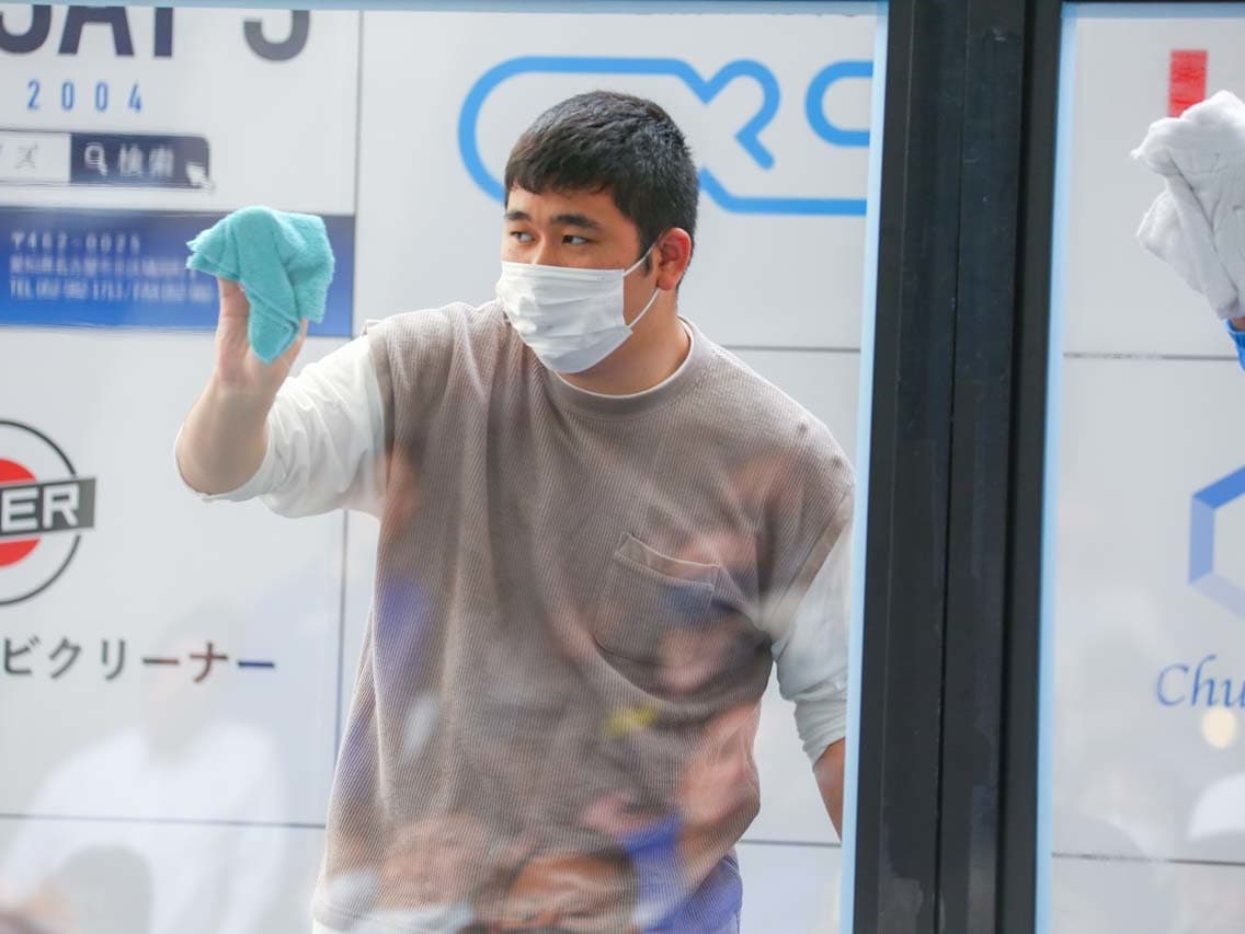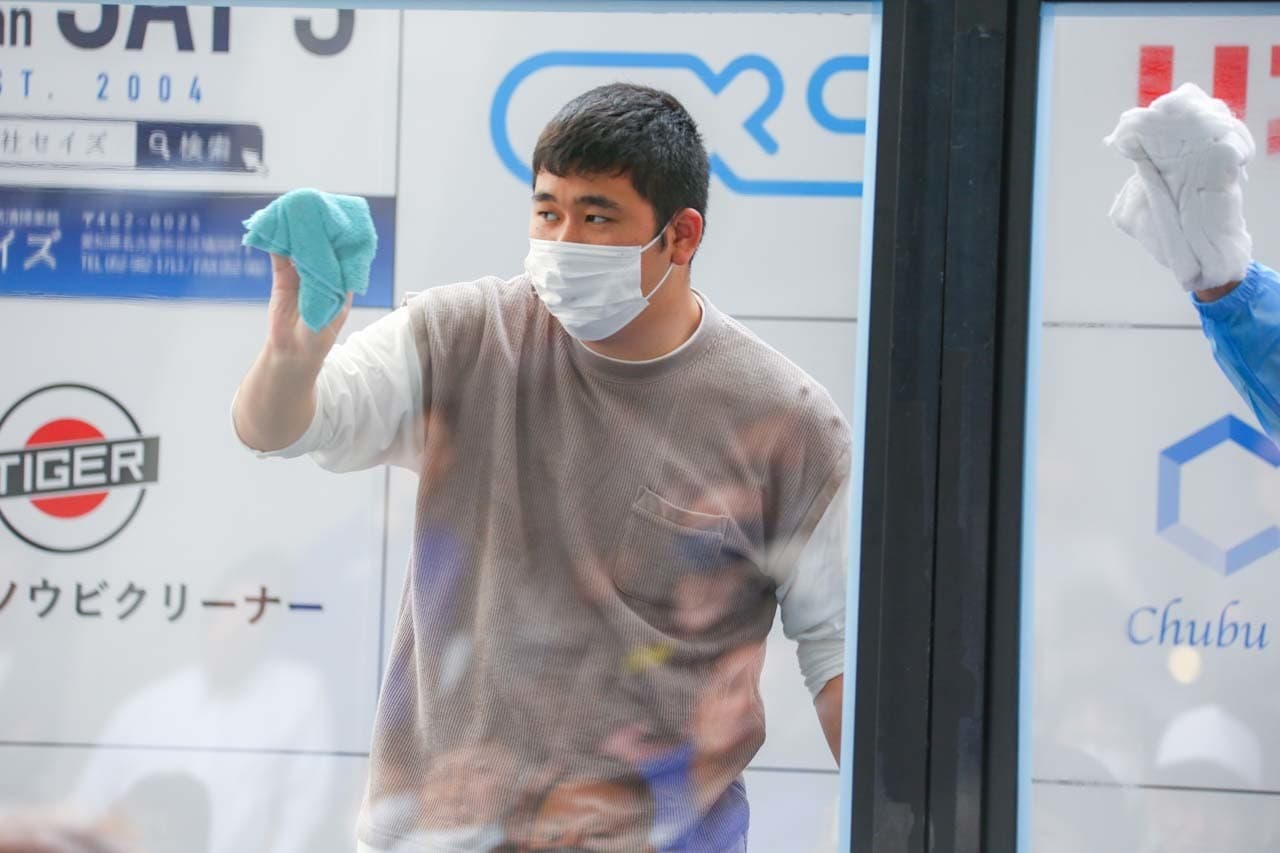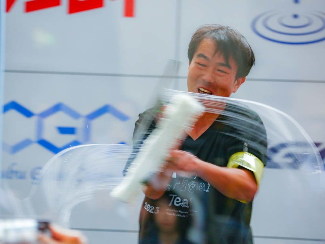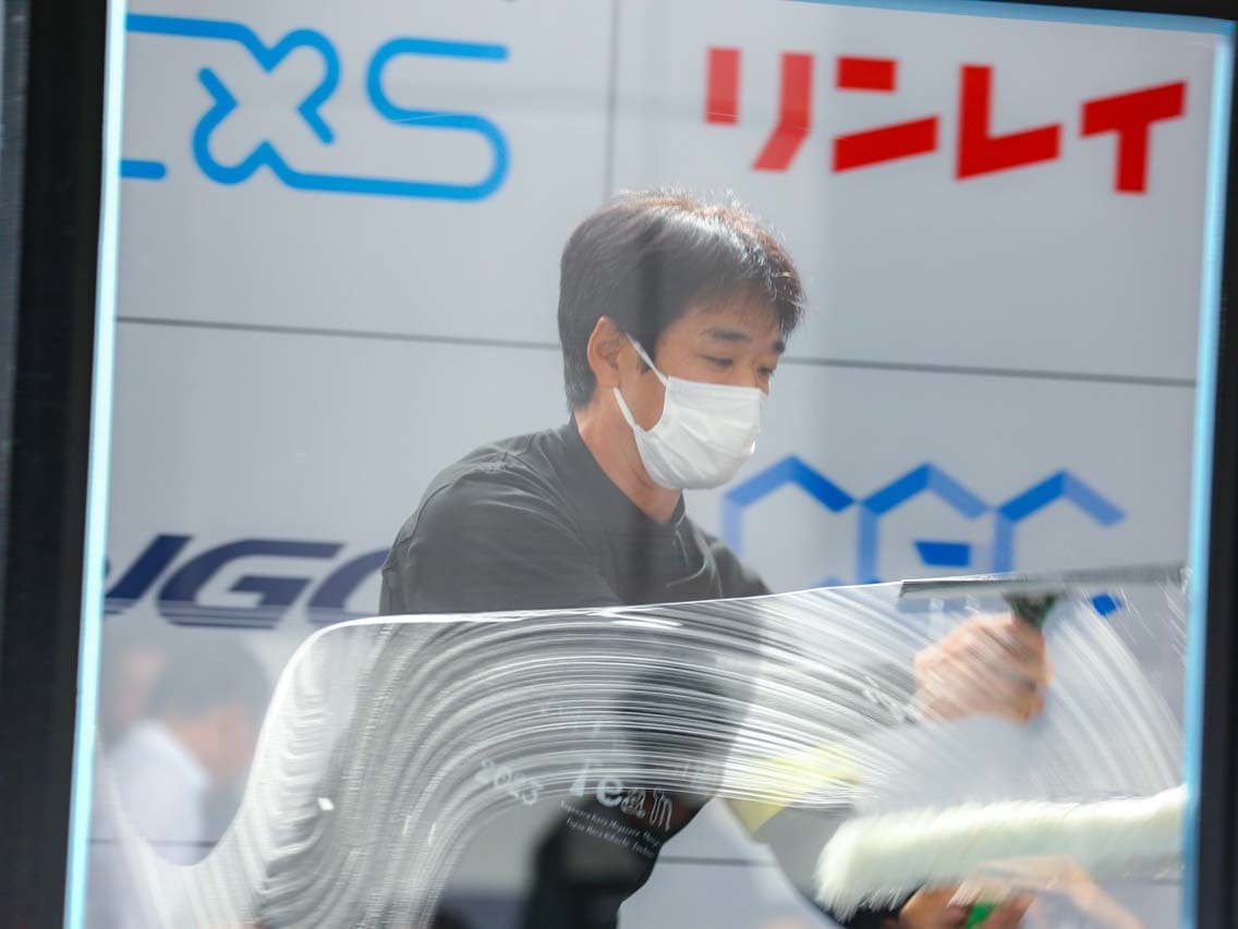 1040mm×1150mmの窓枠付き板ガラスを35cmのシャンプーと30cmのスクイージーを使用して、より早くよりきれいに拭き上げる技術を競います。