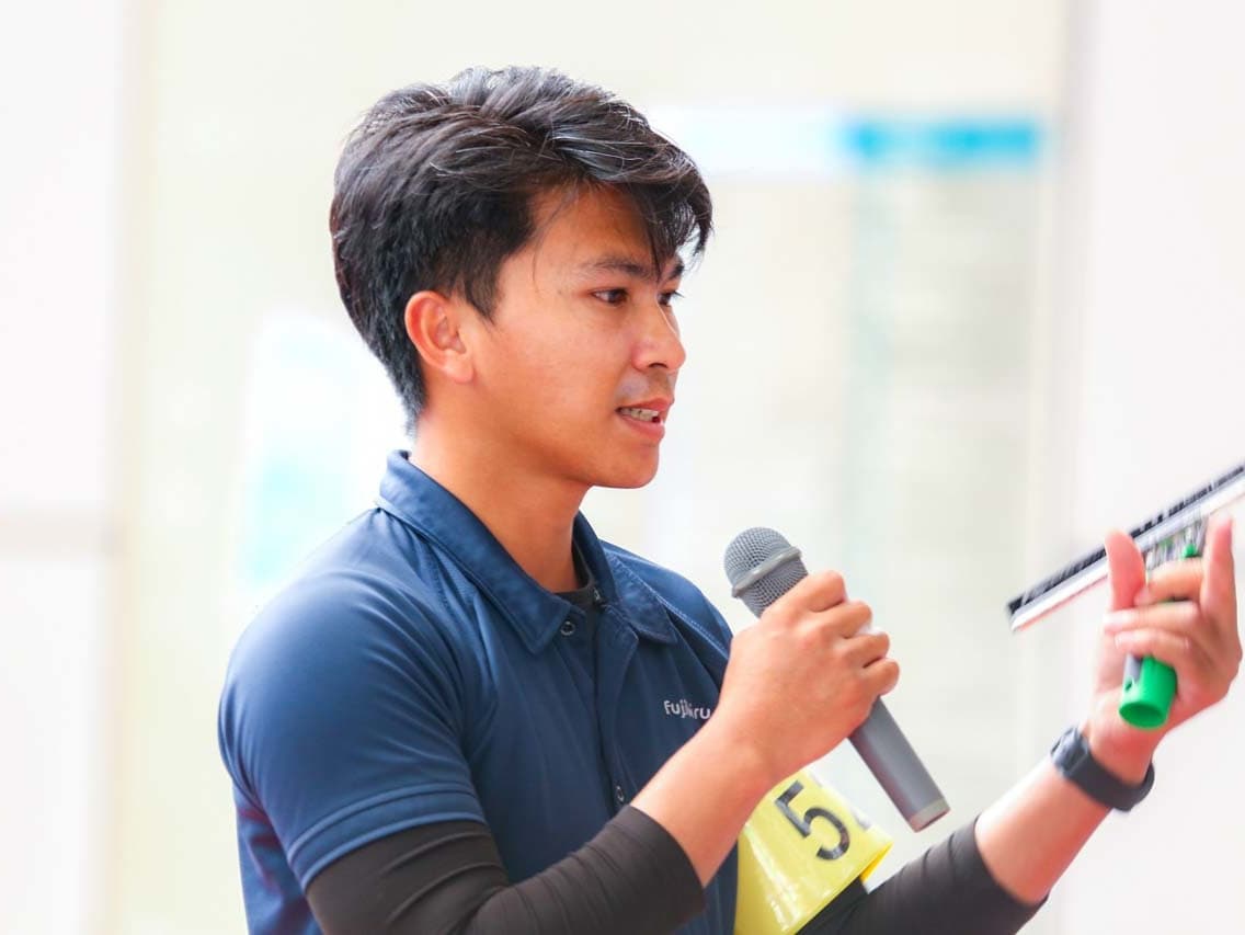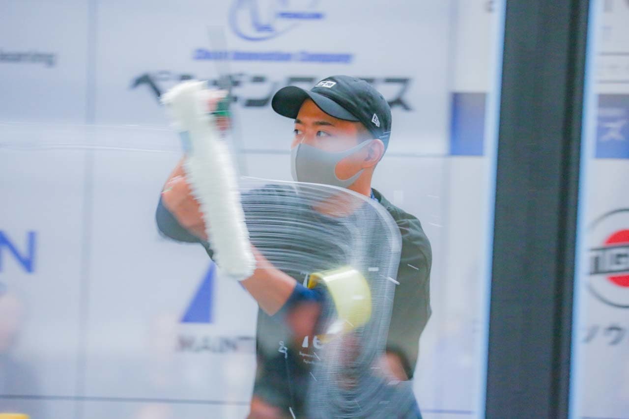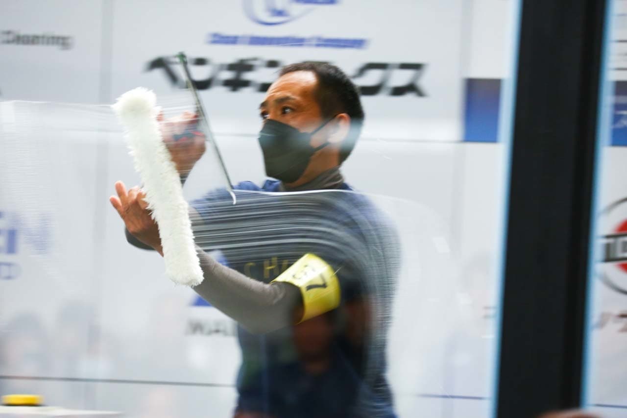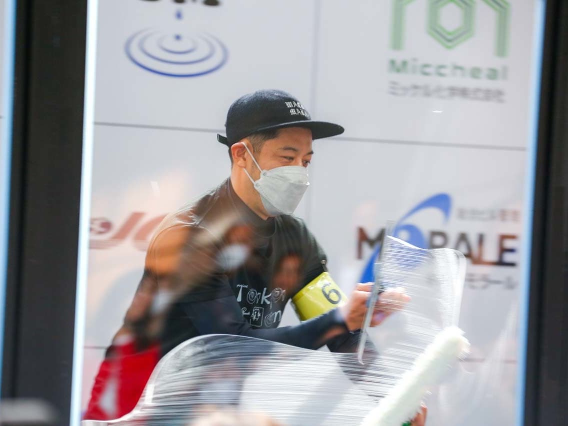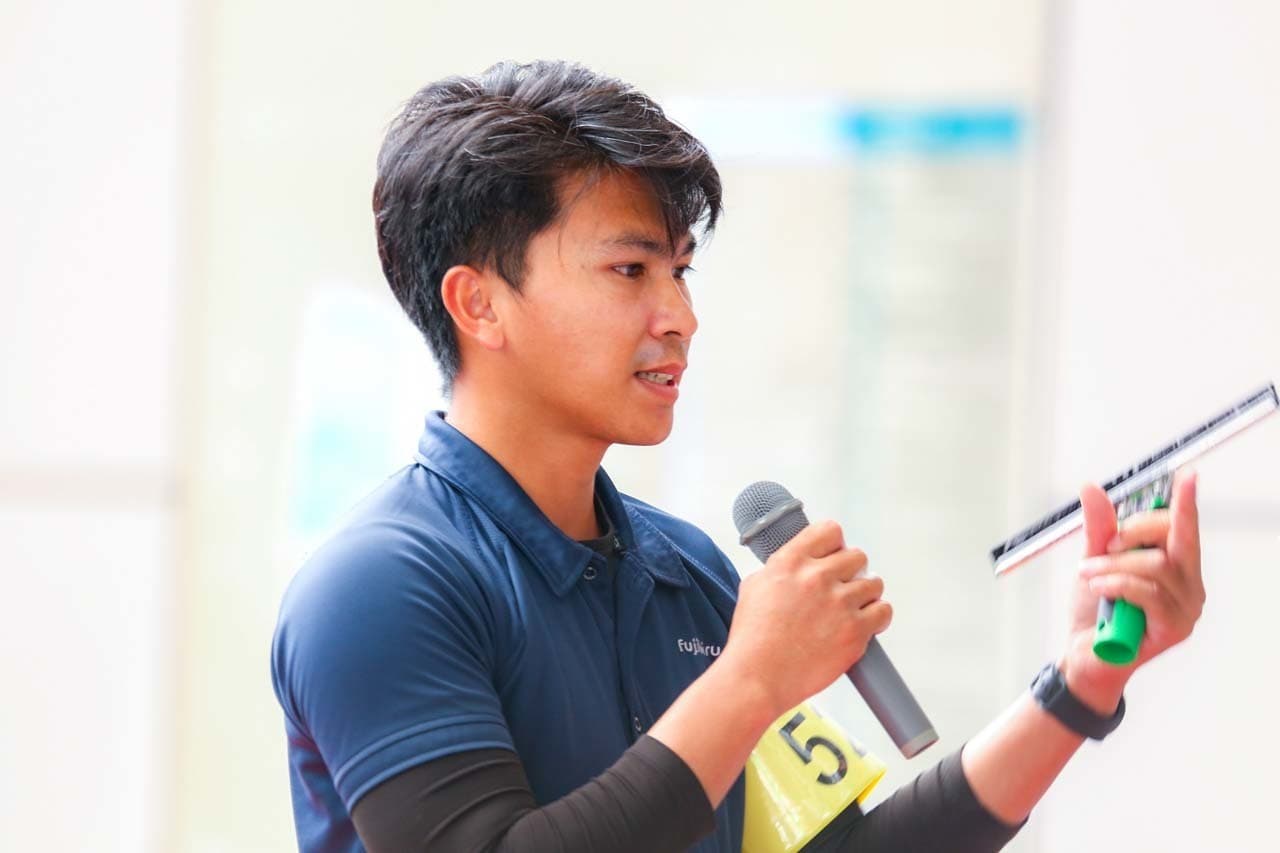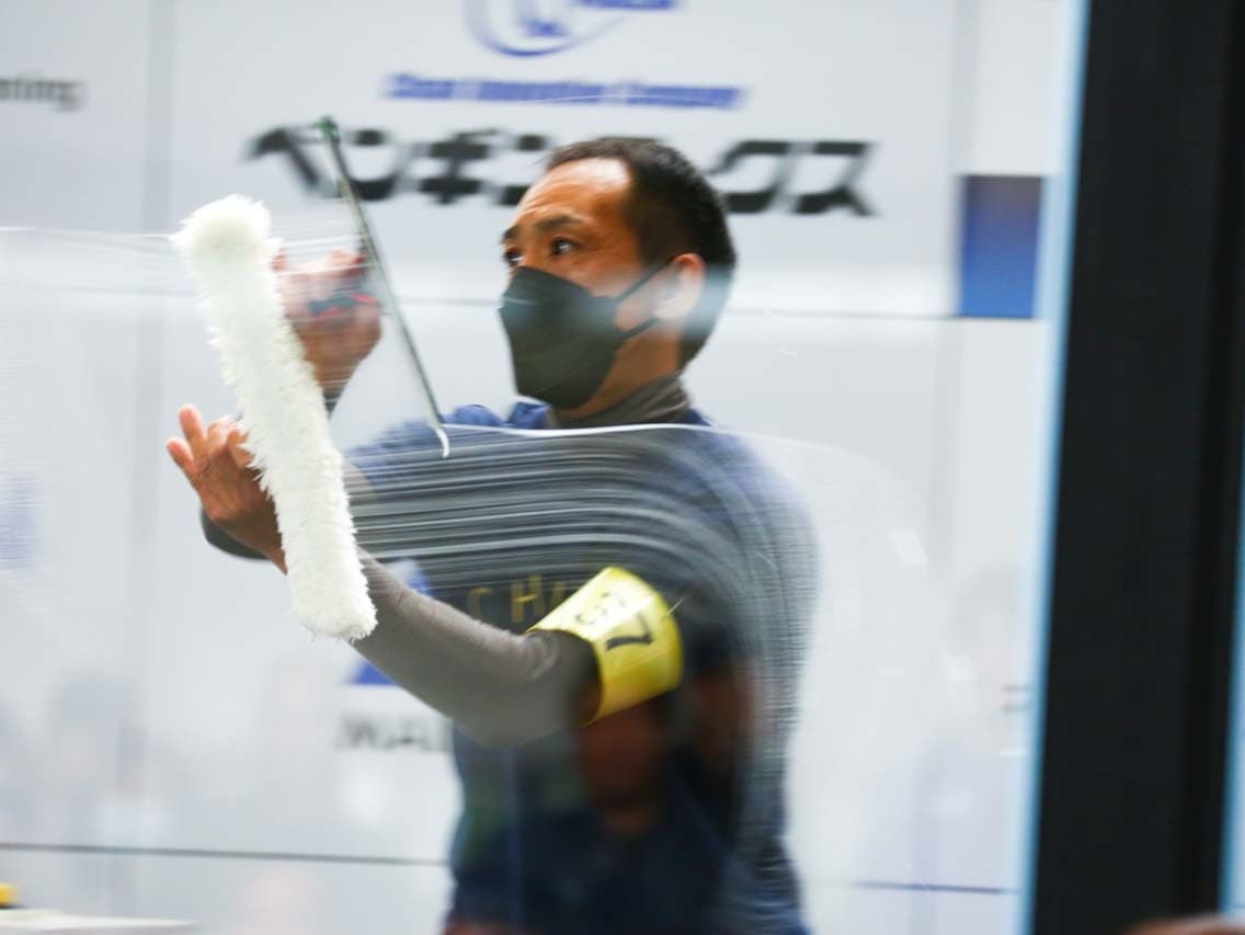 1040mm×1150mmの窓枠付き板ガラスを35cmのシャンプーと30cmのスクイージーを使用して、より早くよりきれいに拭き上げる技術を競います。